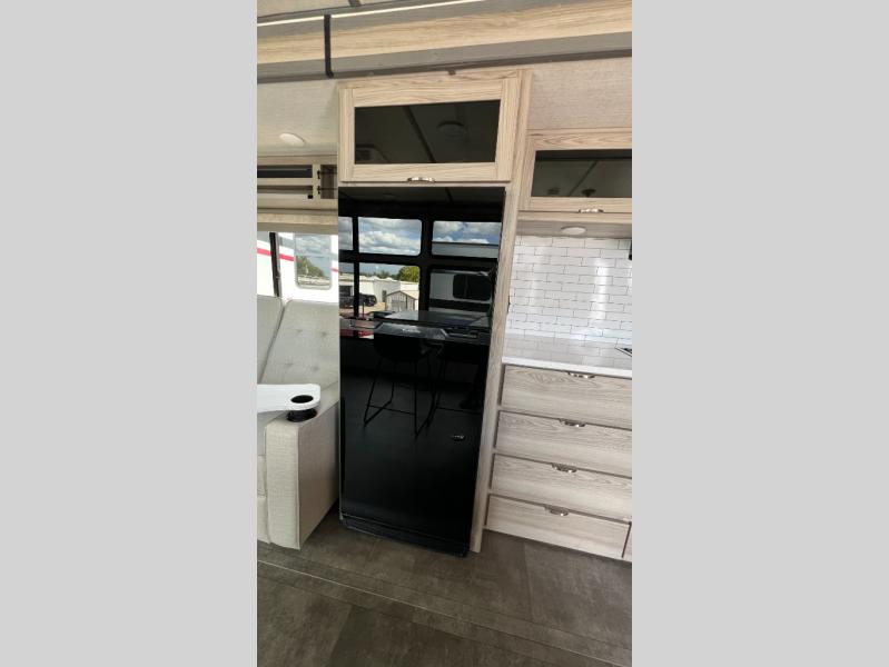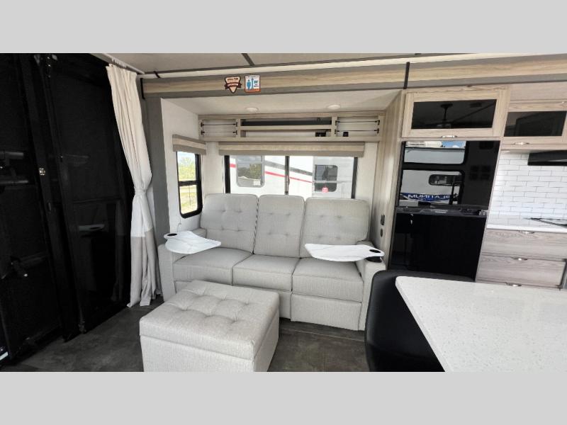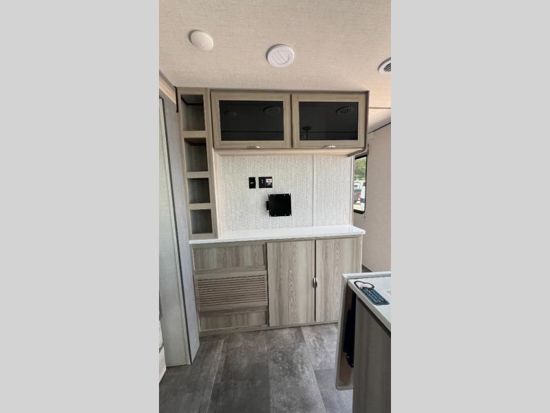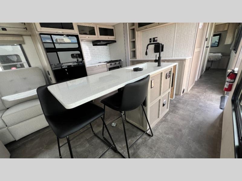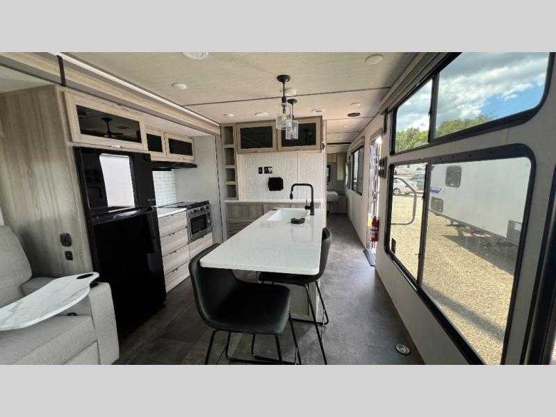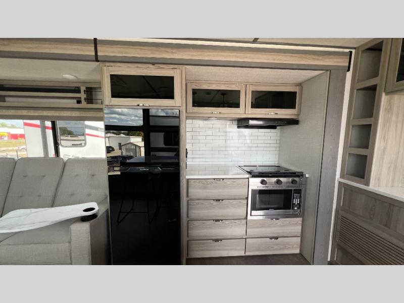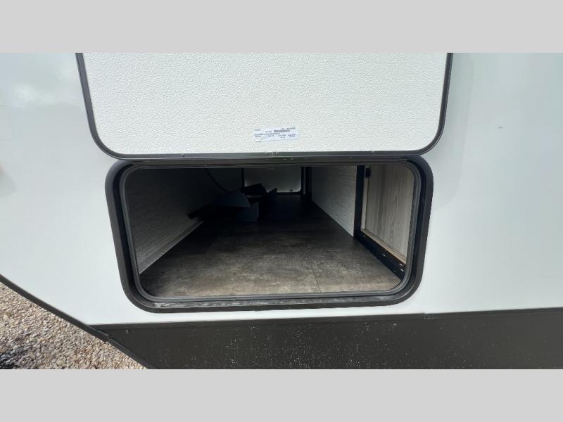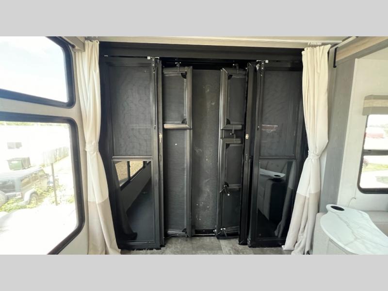 There is a lot to love about the FSX 30VCVIEWX toy hauler! Starting with the 1,500 lb. patio with a three-seasons door that leads into the garage area. Once you remove your off-road toy from the 1,500 lb. tie downs, you can open up the slide and enjoy the open area with a hide a bed sofa ottoman and wall storage with area to mount a TV. The kitchen includes a 12-volt refrigerator, three-burner cooktop, and convection microwave. The kitchen also has an island with sink and flip-up countertop extension on each side. One flip-up countertop serves as a breakfast bar, and comes with two bar stool seats. You even have a movie theater projector with premium sound to watch your favorite movies in style. The bunk area is private with a secret door to access it--and includes one bunk and a jackknife sofa, as well as a flip-up desk. There is also a bike door for outside access. The full bath has a roomy shower, vanity with sink, and toilet. The front bedroom has a Versa-Tilt king bed, wardrobes on either side of the bed, a storage area with baskets and shelving, and underbed storage. Enjoy the outdoors with the 22' power awning with LED lighting and pass-through storage!