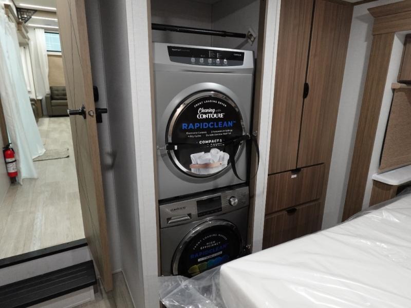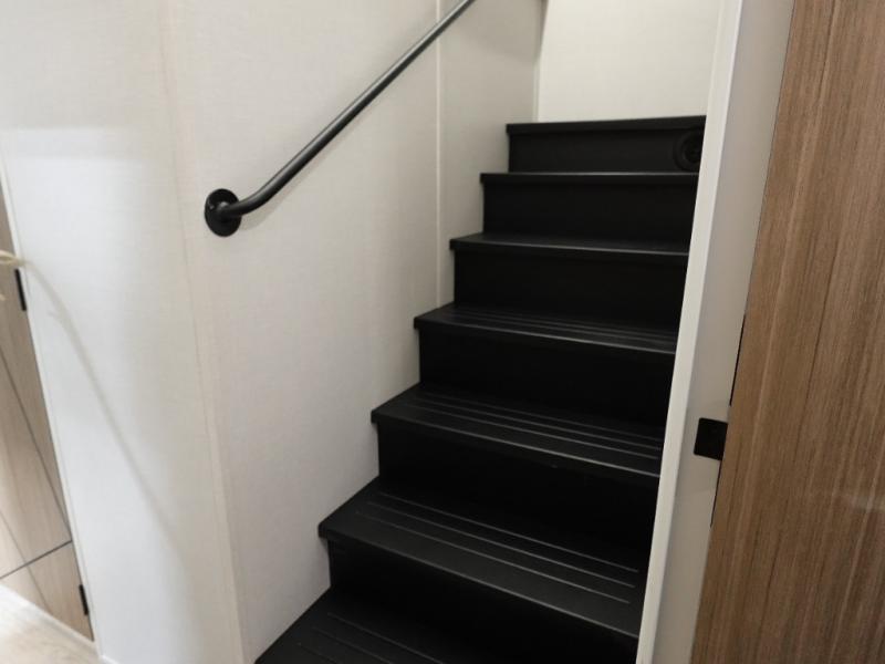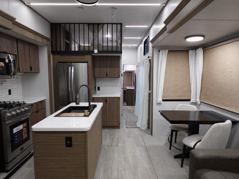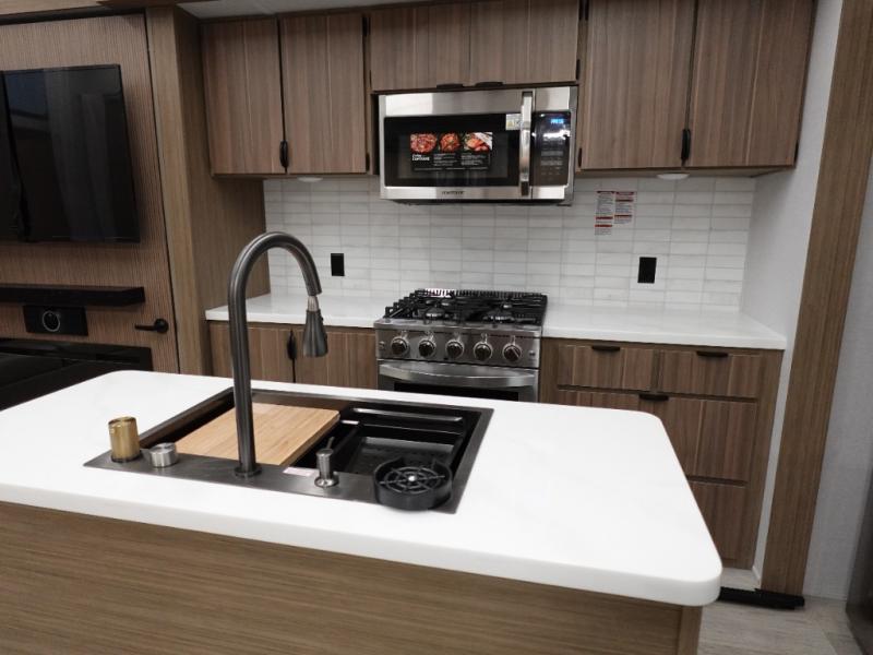 With a double loft in this destination trailer, everyone can join in on the fun! The kids will love having their own space with the two loft areas, one with two 42" x 74" bunk mats and storage area and the other with one 42" x 74" bunk mat and storage area. Plus, you will also have your own privacy with the front private bedroom which features a king bed with Versa-Tilt, front windows for plenty of sunlight to shine through, one of the entry doors, and a closet with washer and dryer. The full bathroom has a walk-in shower with a seat so everyone can stay clean and refreshed. The kitchen island will not only make your meal prep easier, but also your clean up with the Versa-Sink!