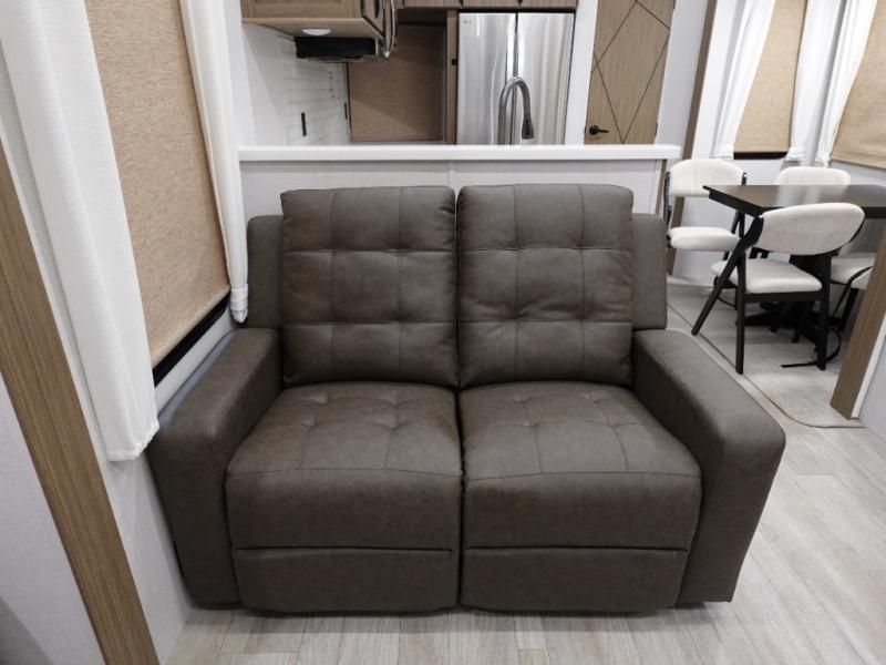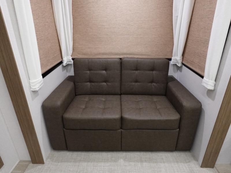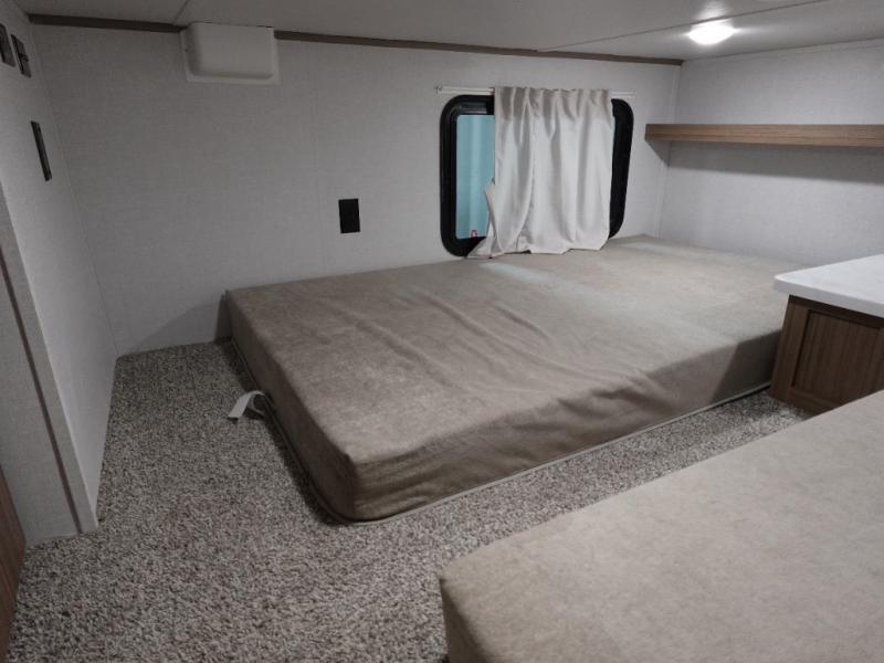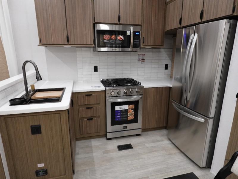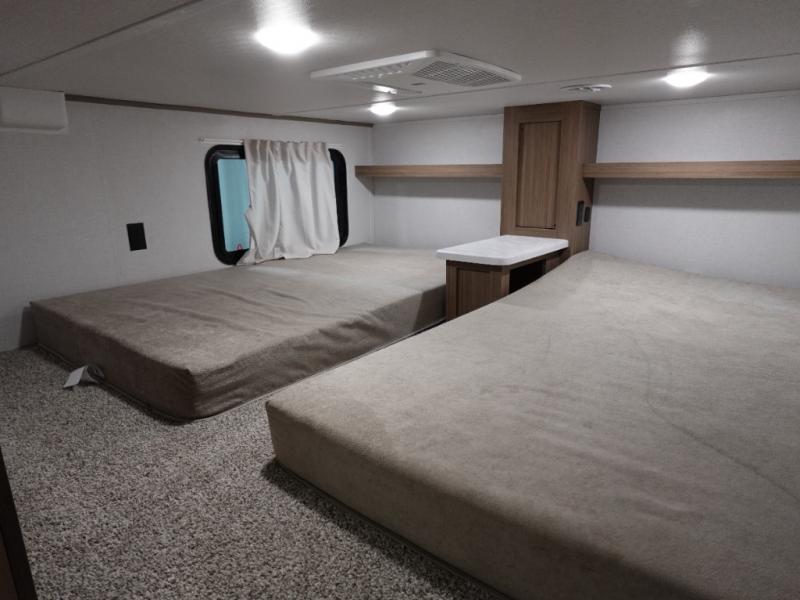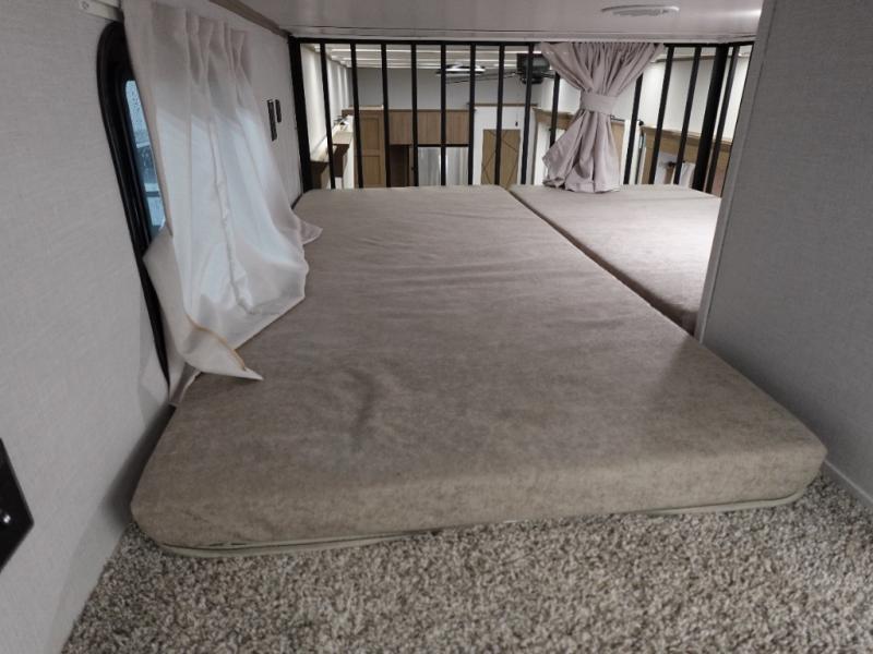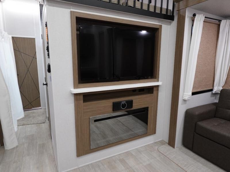 This destination trailer is truly exceptional with its large front kitchen that comes with stainless steel appliances, lots of cabinet and pantry space, and even a free standing dinette so others can play games nearby while you cook! The living area has two opposing sofa slides and theater seating across from the entertainment center with a fireplace for a relaxing evening indoors. With a walk-in shower including a seat in the full bathroom, everyone is sure to stay clean. The rear private bedroom not only features a king bed slide with Versa-Tilt and a closet with a washer/dryer, but also has a double loft above it with four bunk mats in total!