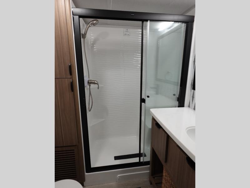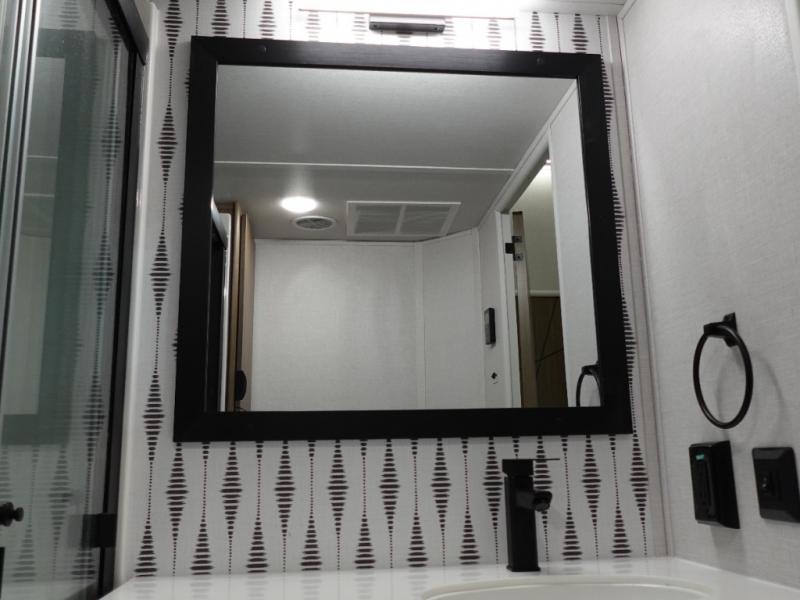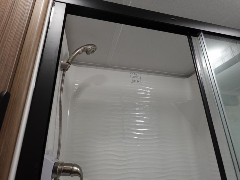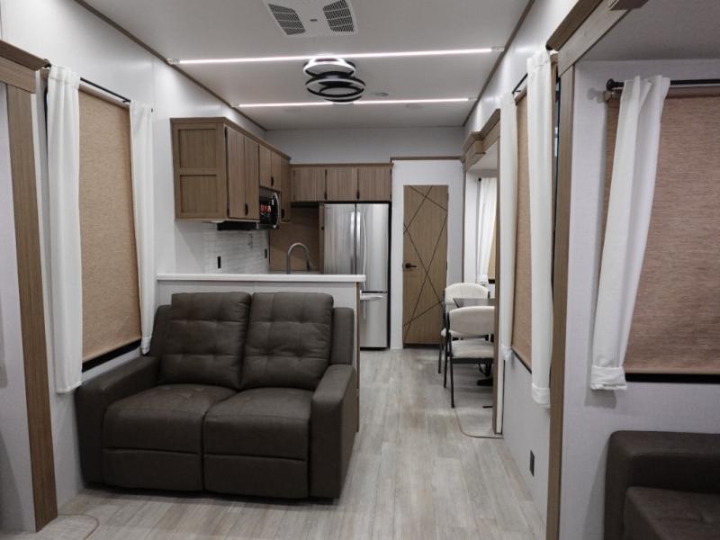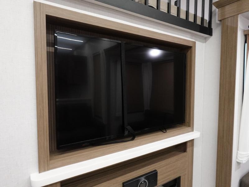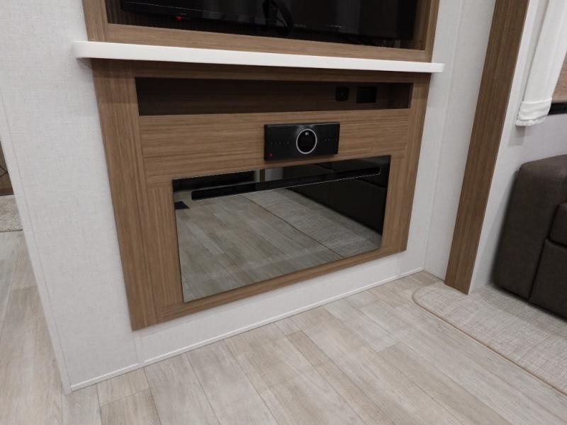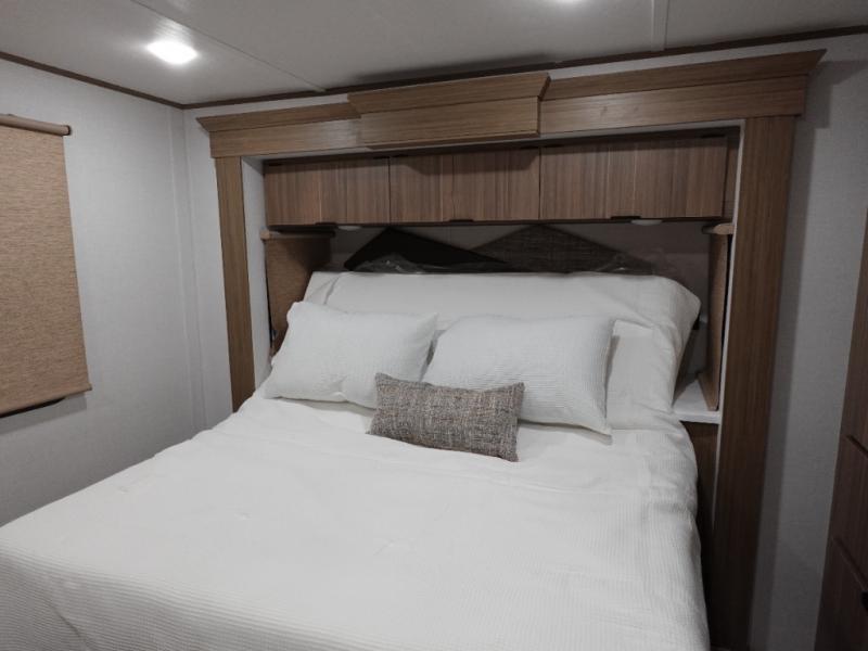 With any Salem Grand Villa destination trailer by Forest River, you can call home wherever you park it! There is a heated and enclosed Accessibelly for added protection in all seasons, LED "Blade Lighting" under the awning, Lippert On-The-Go ladder prep, plus many more exterior conveniences. Elegant curtain rods and curtains will have you feeling right at home, along with stainless steel kitchen appliances, stylish roller shades, and enhanced floating shelves for added storage. Each model includes a central vacuum with a sweep attachment to help keep your space tidy, a 60k on-demand tankless water heater for endless hot showers, a JBL 3-Zone media center, plus more.