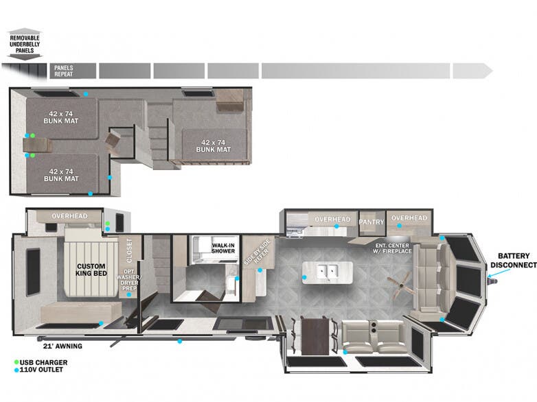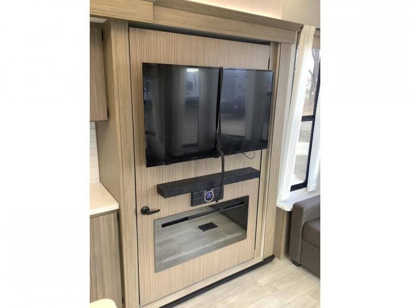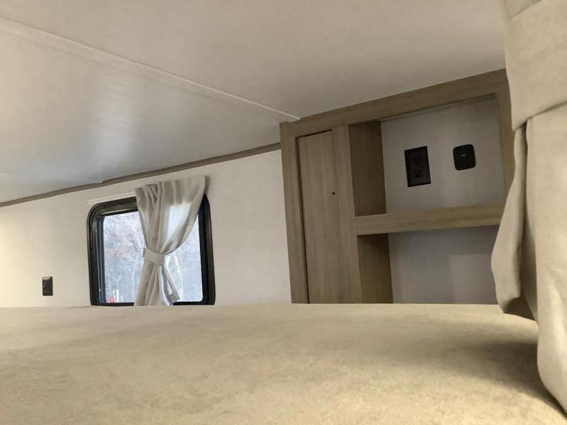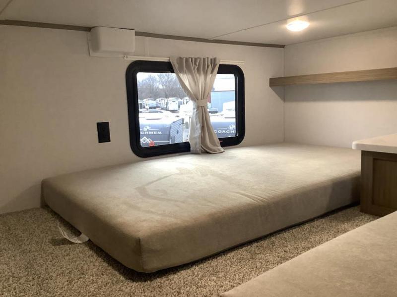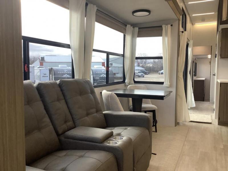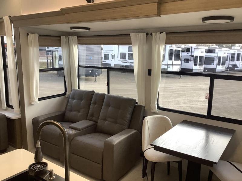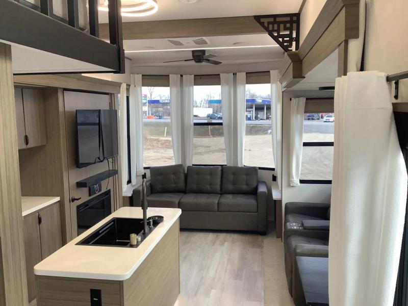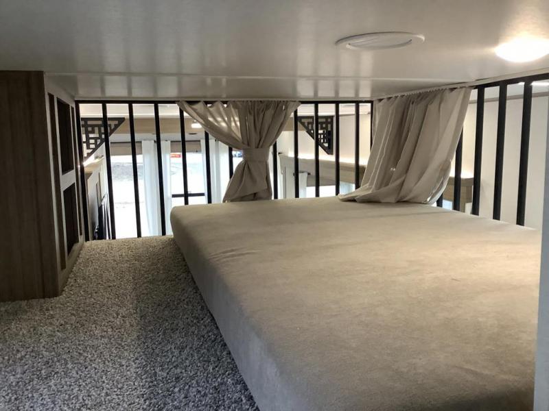 The grandkids will be begging to come along with you on your next getaway in this destination trailer! It features a double loft with three 42" x 74" bunk mats in total above the rear private bedroom. Inside the bedroom, you will find a king bed with Versa-Tilt slide and overhead cabinets, and a closet with optional washer/dryer prep if you want the option to go full-time. The walk-in shower with a seat will make it easy for everyone to stay fresh and clean as well. The living and kitchen area feature a kitchen island, a free standing dinette to enjoy meals and play games at, a front sofa, and theater seating across from the entertainment center with a fireplace for those crisp evenings!