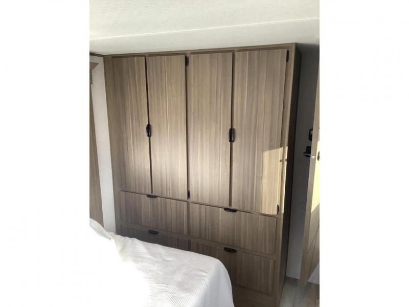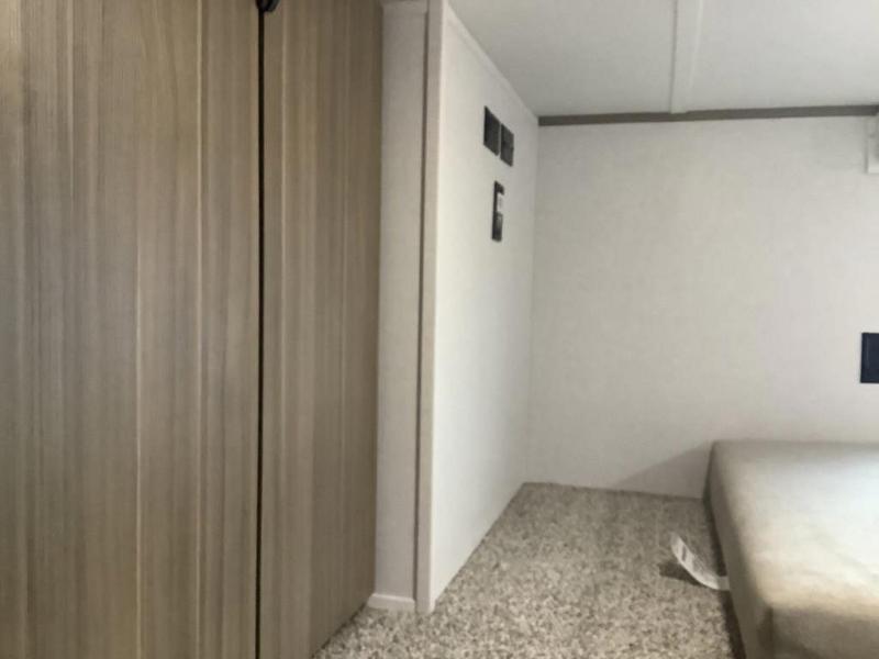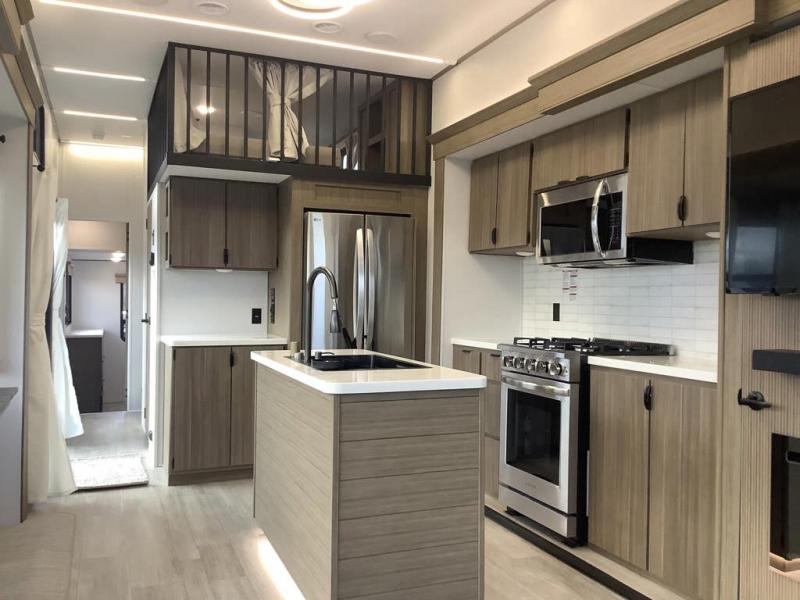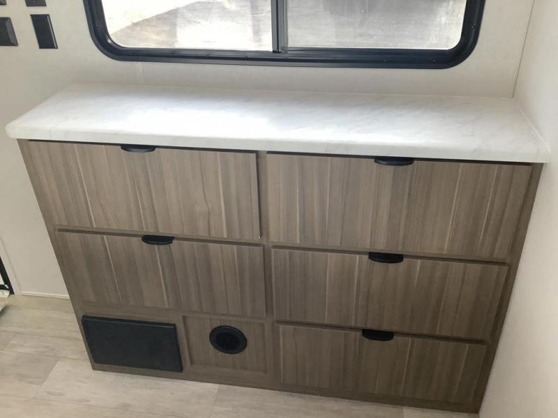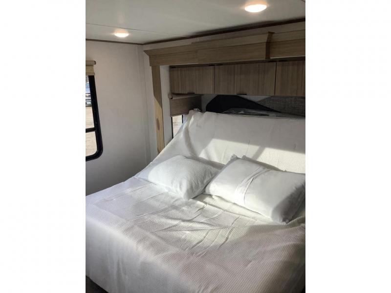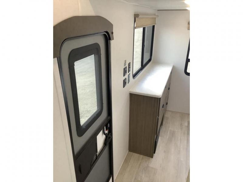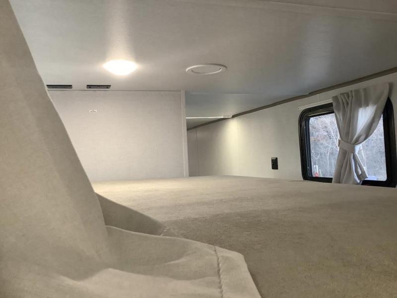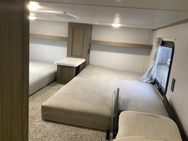 The grandkids will be begging to come along with you on your next getaway in this destination trailer! It features a double loft with three 42" x 74" bunk mats in total above the rear private bedroom. Inside the bedroom, you will find a king bed with Versa-Tilt slide and overhead cabinets, and a closet with optional washer/dryer prep if you want the option to go full-time. The walk-in shower with a seat will make it easy for everyone to stay fresh and clean as well. The living and kitchen area feature a kitchen island, a free standing dinette to enjoy meals and play games at, a front sofa, and theater seating across from the entertainment center with a fireplace for those crisp evenings!