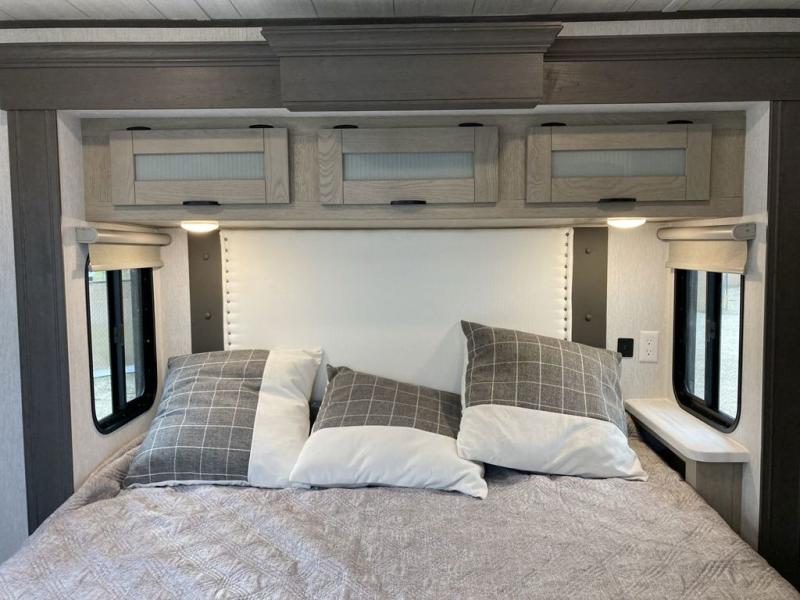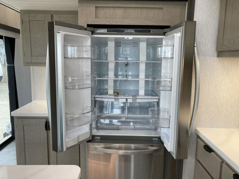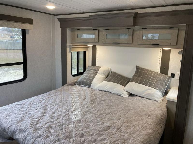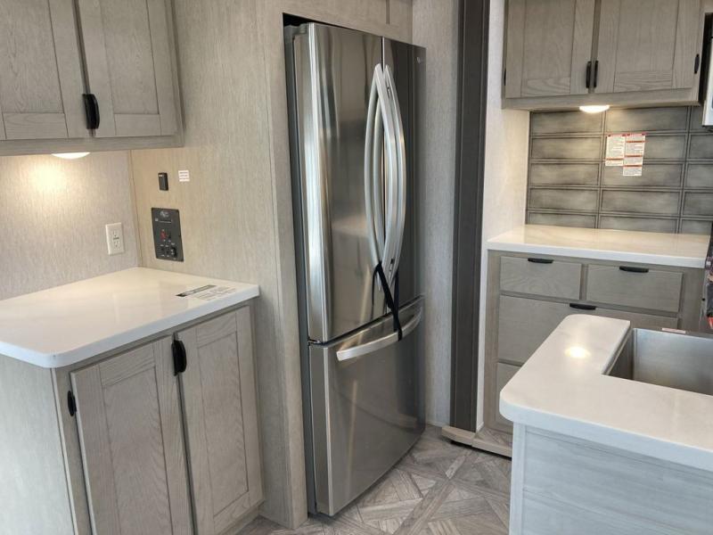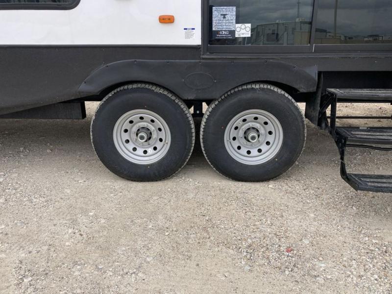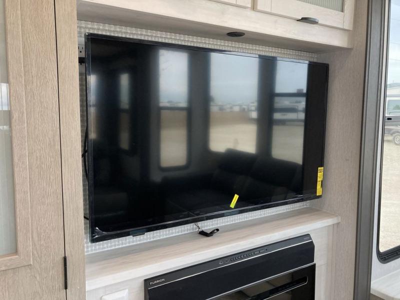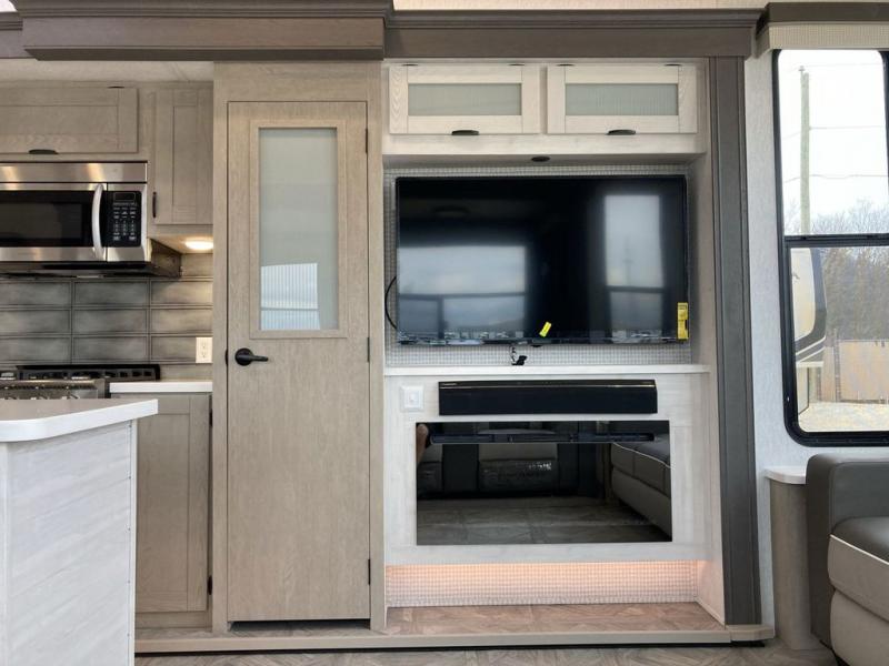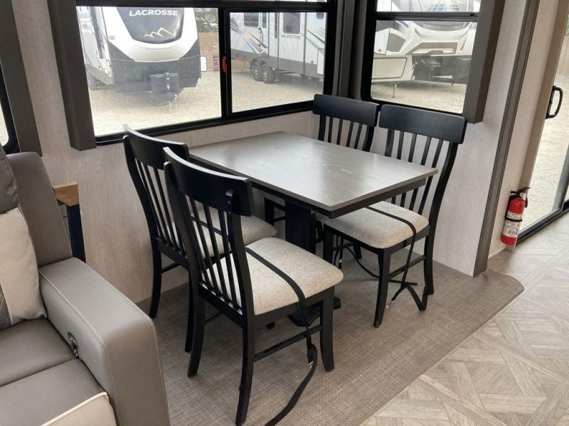 The grandkids will be begging to come along with you on your next getaway in this destination trailer! It features a double loft with three 42" x 74" bunk mats in total above the rear private bedroom. Inside the bedroom, you will find a king bed with Versa-Tilt slide and overhead cabinets, and a closet with optional washer/dryer prep if you want the option to go full-time. The walk-in shower with a seat will make it easy for everyone to stay fresh and clean as well. The living and kitchen area feature a kitchen island, a free standing dinette to enjoy meals and play games at, a front sofa, and theater seating across from the entertainment center with a fireplace for those crisp evenings!