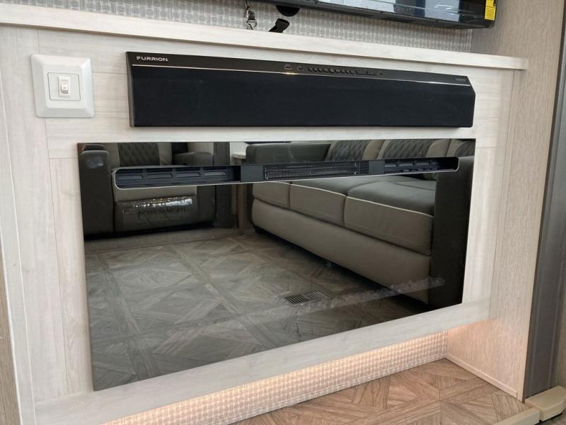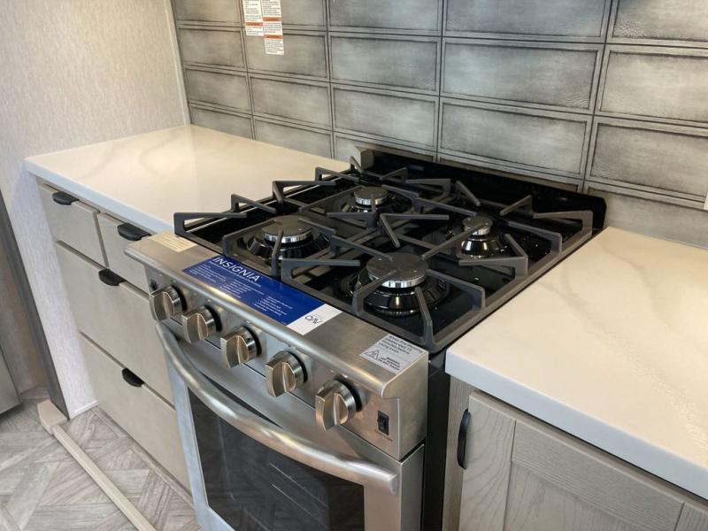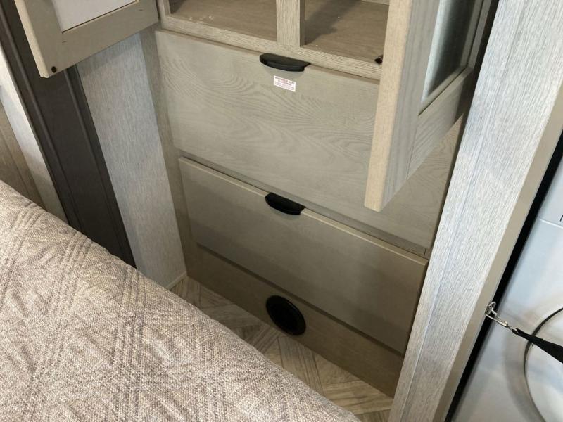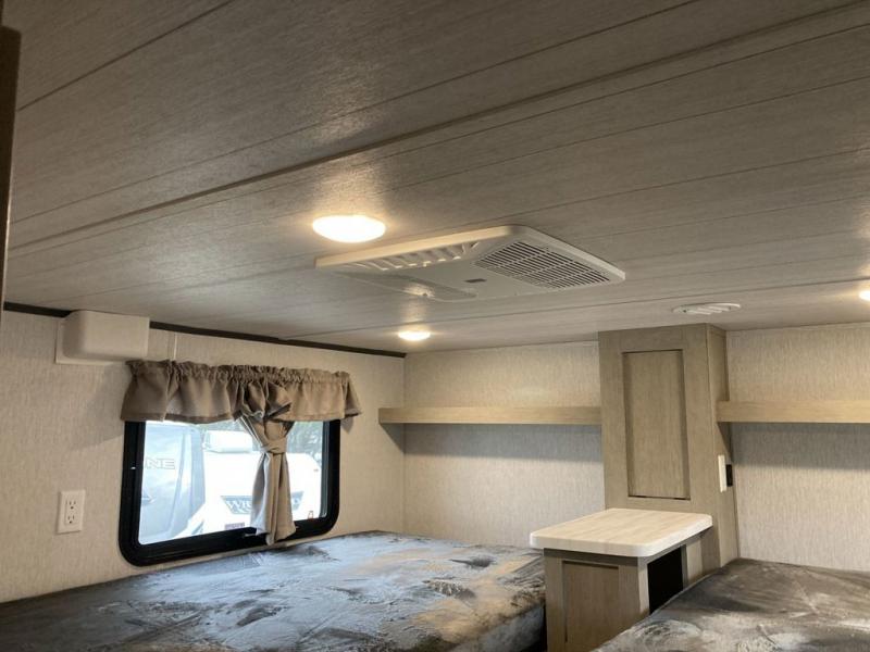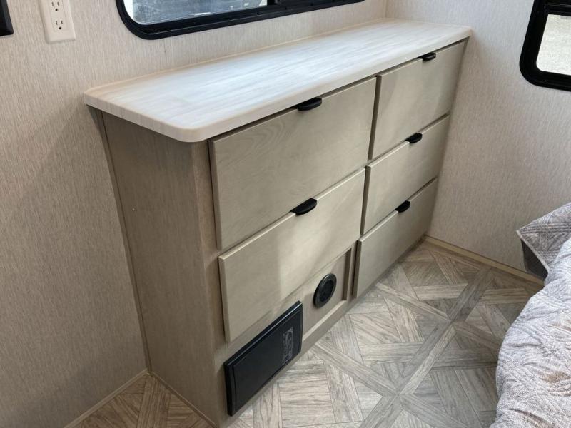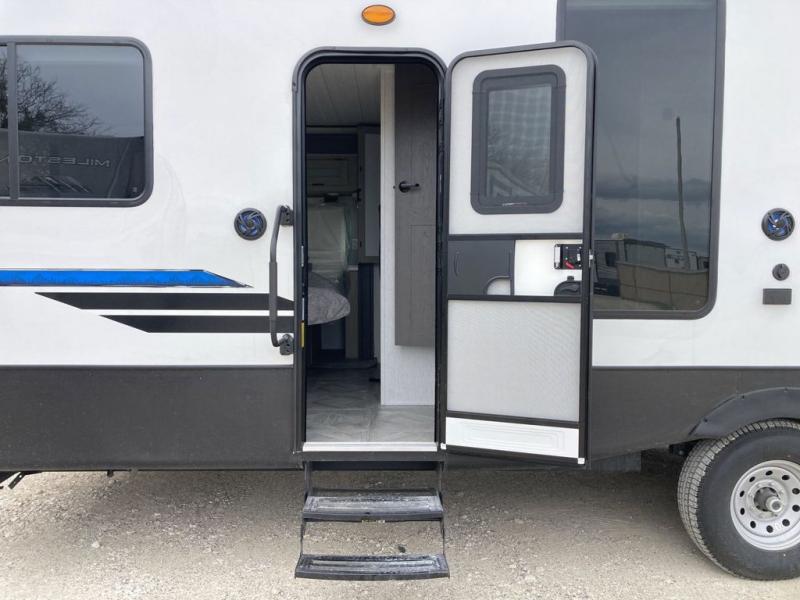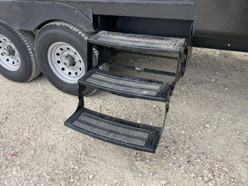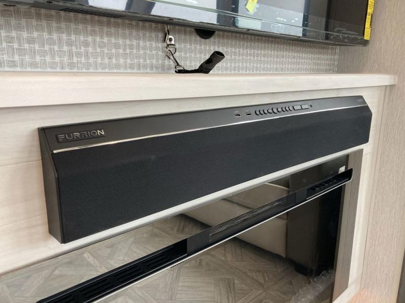 The grandkids will be begging to come along with you on your next getaway in this destination trailer! It features a double loft with three 42" x 74" bunk mats in total above the rear private bedroom. Inside the bedroom, you will find a king bed with Versa-Tilt slide and overhead cabinets, and a closet with optional washer/dryer prep if you want the option to go full-time. The walk-in shower with a seat will make it easy for everyone to stay fresh and clean as well. The living and kitchen area feature a kitchen island, a free standing dinette to enjoy meals and play games at, a front sofa, and theater seating across from the entertainment center with a fireplace for those crisp evenings!