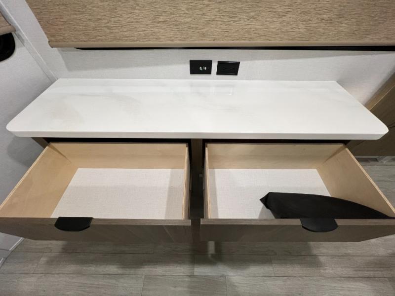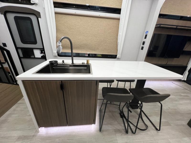 It won't be hard to find comfort in this spacious destination trailer for five to six! The rear covered veranda includes a ceiling fan to keep you cool as you cook on the exterior kitchen! Patio doors here will lead into the main living area that includes an L-shaped sofa with an ottoman plus an entertainment center with a fireplace for cooler evenings. A full kitchen is complete with all the appliances to make meals each day, a kitchen island with four chairs, plus a refrigerator and pantry for food storage. There is a front bedroom with a Versa-Tilt custom king bed slide out, a dresser and wardrobe plus a second wardrobe with washer and dryer prep if you choose to add those appliances. Your guests can make themselves at home in the loft that includes a queen bed, a cabinet with shelves, and a table with space below for feet if you want to eat up here or play a board game!