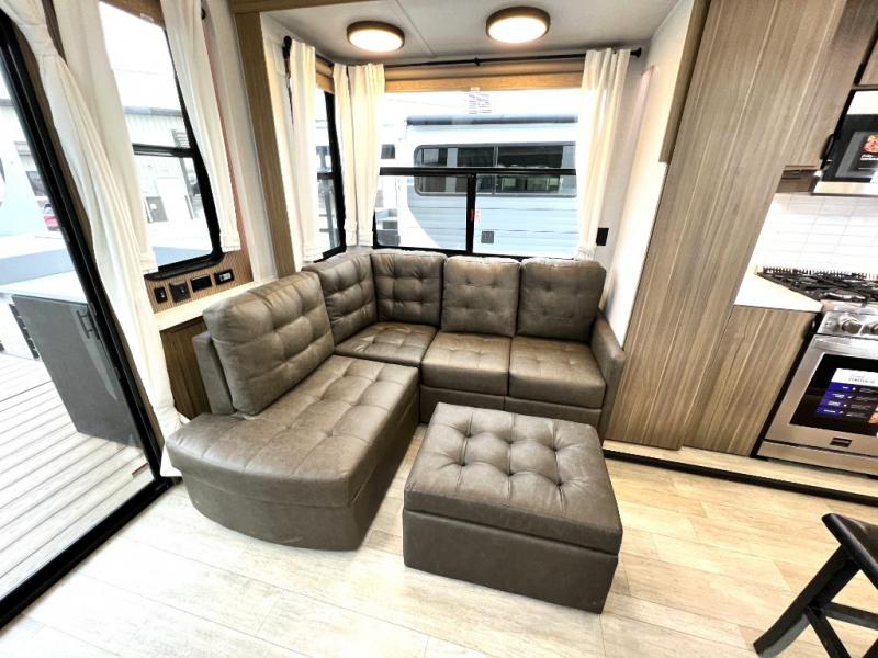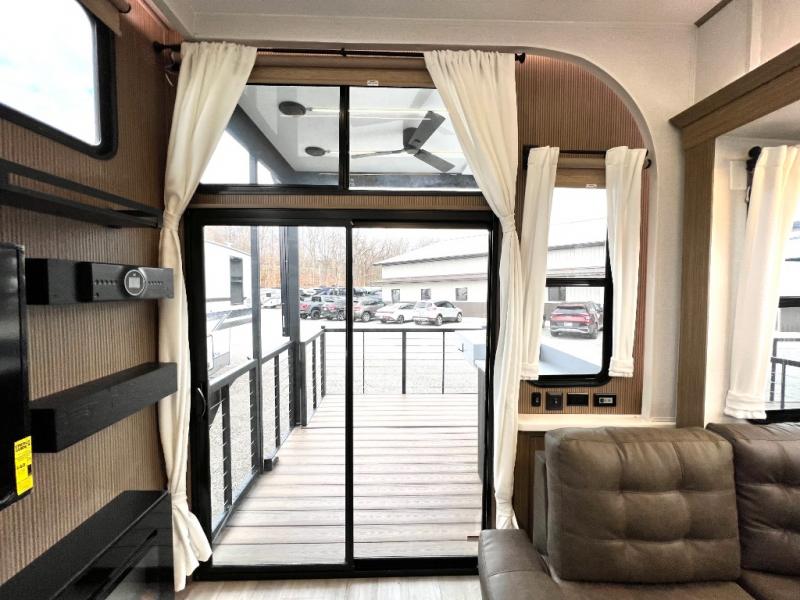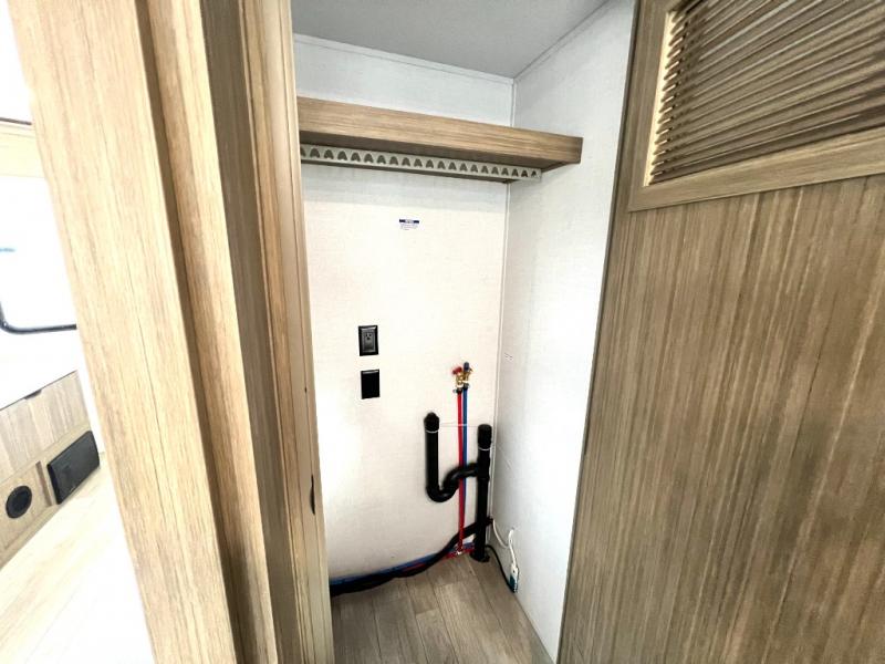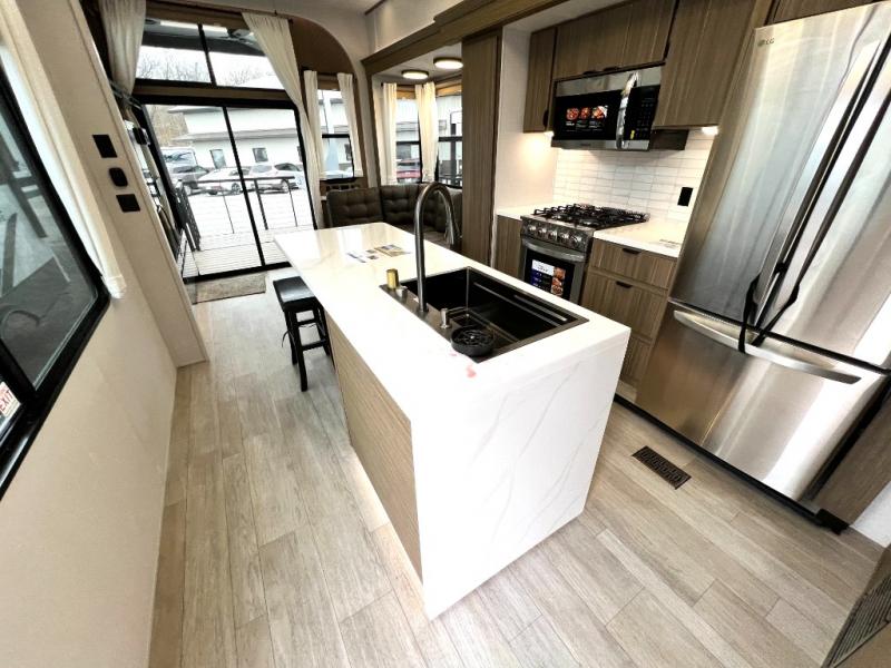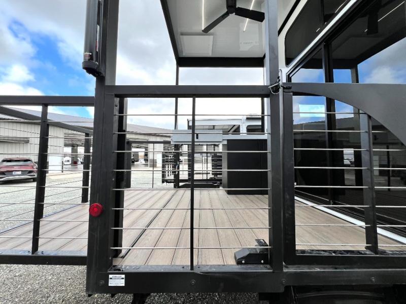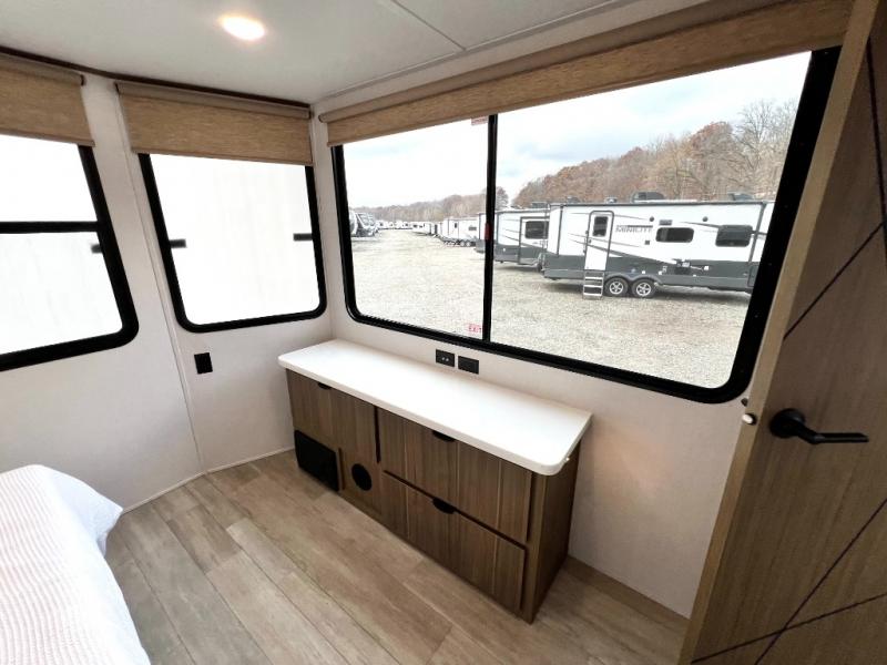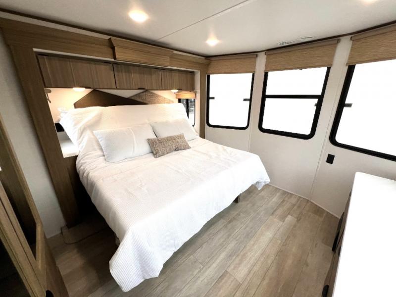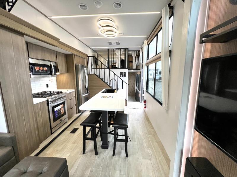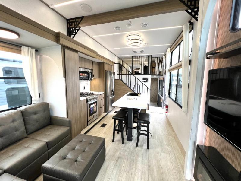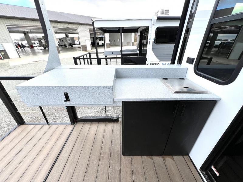 It won't be hard to find comfort in this spacious destination trailer for five to six! The rear covered veranda includes a ceiling fan to keep you cool as you cook on the exterior kitchen! Patio doors here will lead into the main living area that includes an L-shaped sofa with an ottoman plus an entertainment center with a fireplace for cooler evenings. A full kitchen is complete with all the appliances to make meals each day, a kitchen island with four chairs, plus a refrigerator and pantry for food storage. There is a front bedroom with a Versa-Tilt custom king bed slide out, a dresser and wardrobe plus a second wardrobe with washer and dryer prep if you choose to add those appliances. Your guests can make themselves at home in the loft that includes a queen bed, a cabinet with shelves, and a table with space below for feet if you want to eat up here or play a board game!
