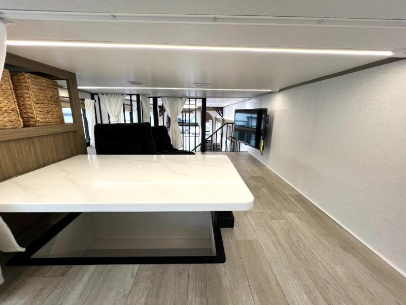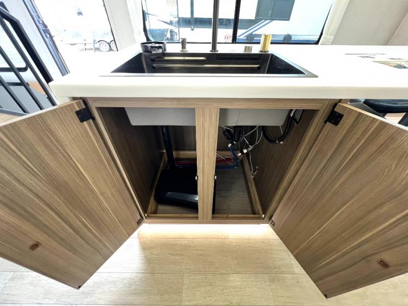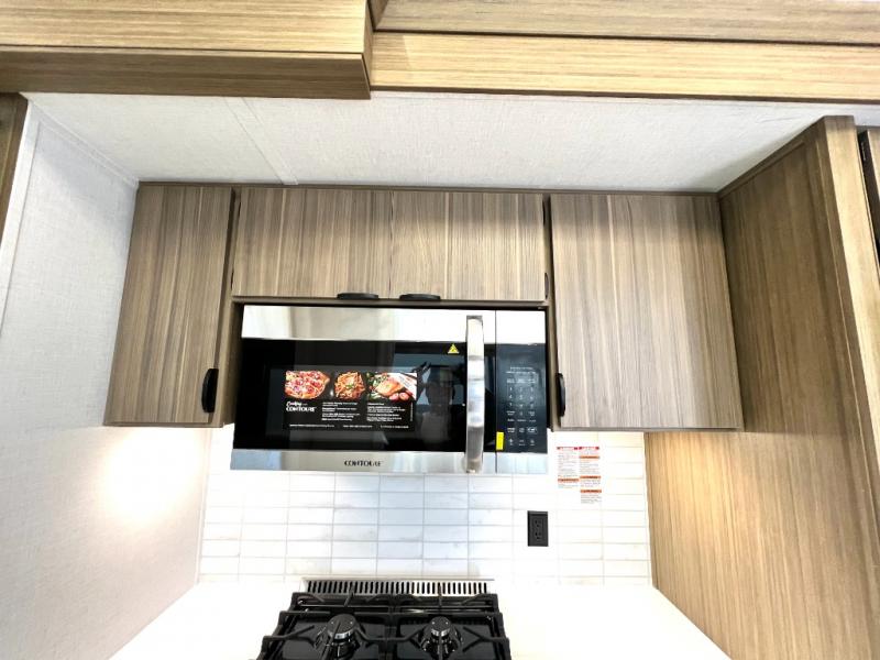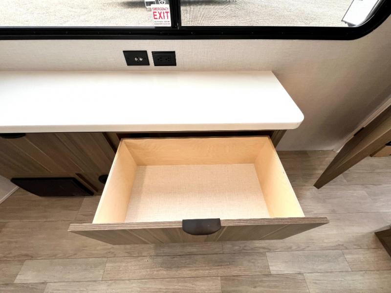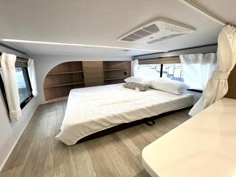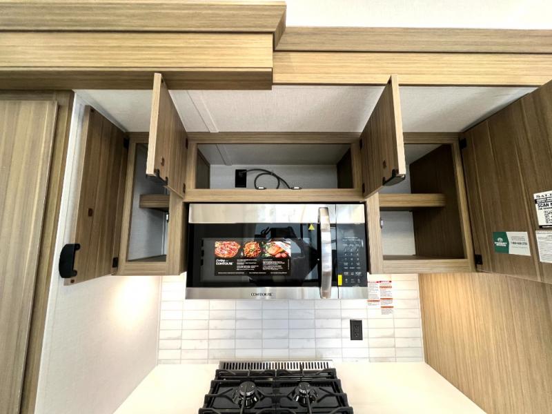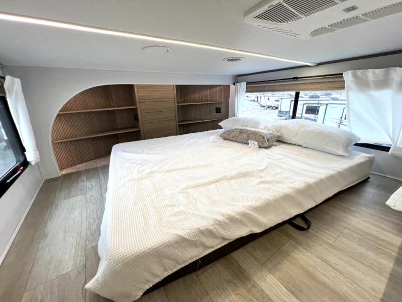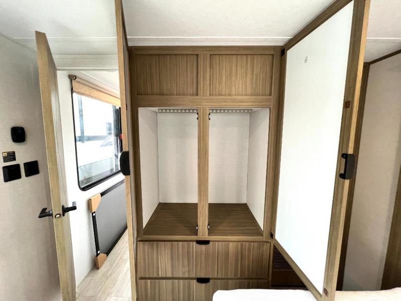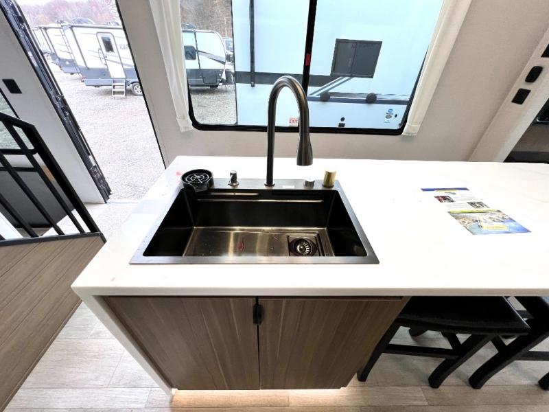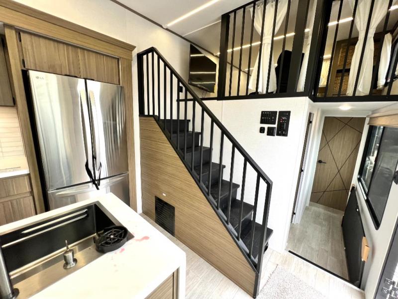 It won't be hard to find comfort in this spacious destination trailer for five to six! The rear covered veranda includes a ceiling fan to keep you cool as you cook on the exterior kitchen! Patio doors here will lead into the main living area that includes an L-shaped sofa with an ottoman plus an entertainment center with a fireplace for cooler evenings. A full kitchen is complete with all the appliances to make meals each day, a kitchen island with four chairs, plus a refrigerator and pantry for food storage. There is a front bedroom with a Versa-Tilt custom king bed slide out, a dresser and wardrobe plus a second wardrobe with washer and dryer prep if you choose to add those appliances. Your guests can make themselves at home in the loft that includes a queen bed, a cabinet with shelves, and a table with space below for feet if you want to eat up here or play a board game!