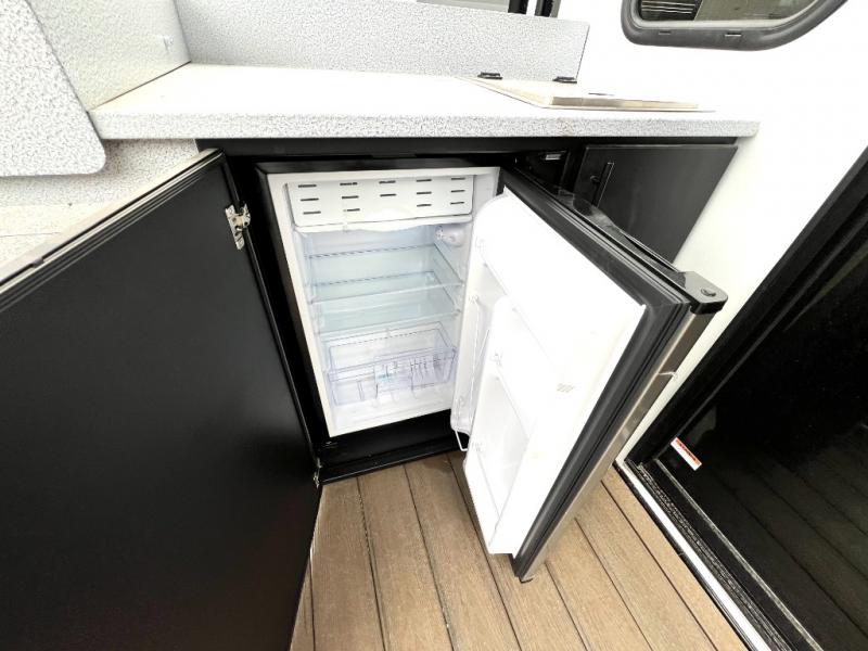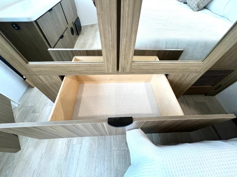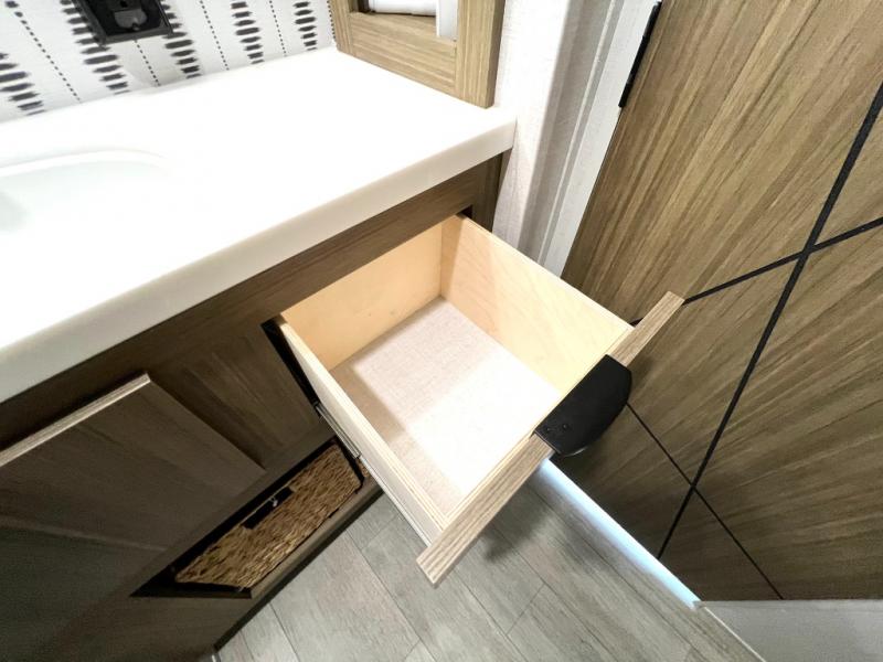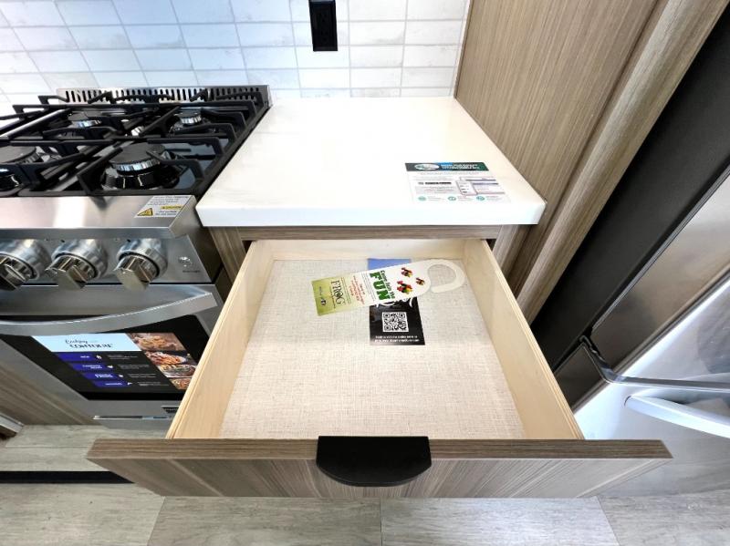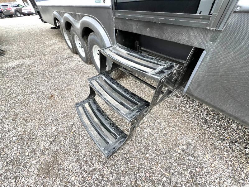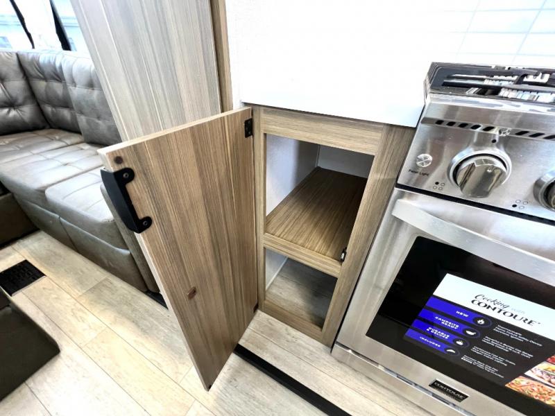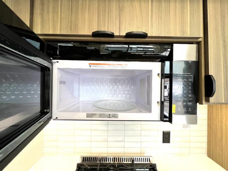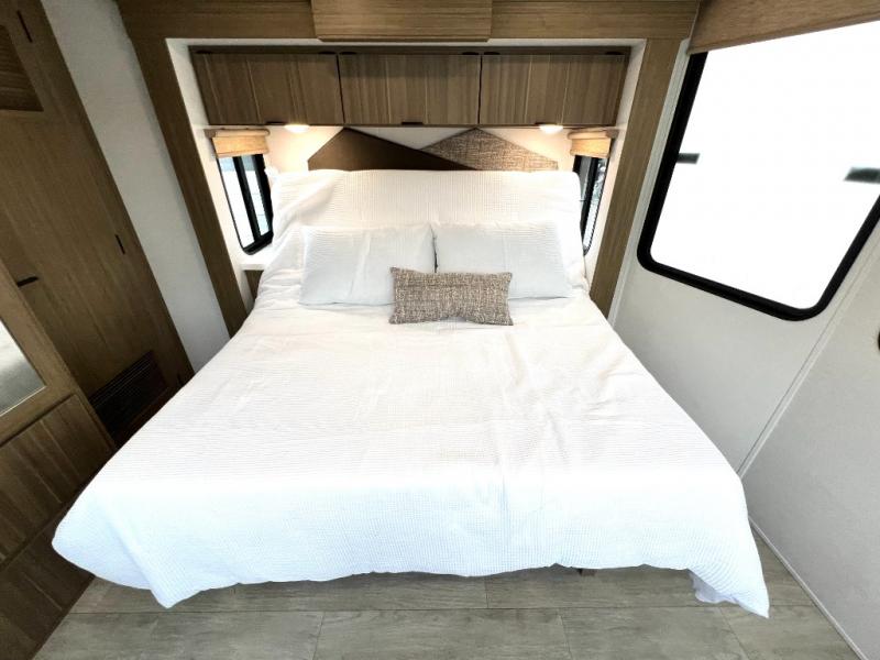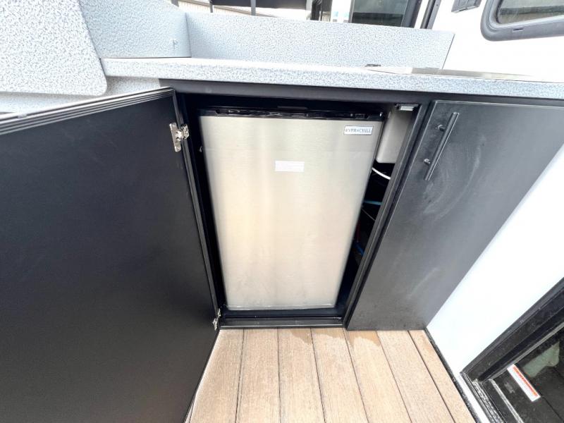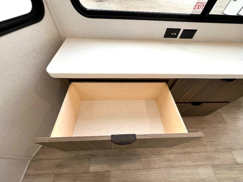 It won't be hard to find comfort in this spacious destination trailer for five to six! The rear covered veranda includes a ceiling fan to keep you cool as you cook on the exterior kitchen! Patio doors here will lead into the main living area that includes an L-shaped sofa with an ottoman plus an entertainment center with a fireplace for cooler evenings. A full kitchen is complete with all the appliances to make meals each day, a kitchen island with four chairs, plus a refrigerator and pantry for food storage. There is a front bedroom with a Versa-Tilt custom king bed slide out, a dresser and wardrobe plus a second wardrobe with washer and dryer prep if you choose to add those appliances. Your guests can make themselves at home in the loft that includes a queen bed, a cabinet with shelves, and a table with space below for feet if you want to eat up here or play a board game!
