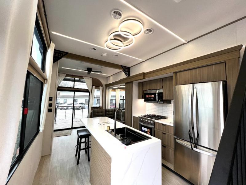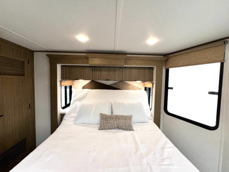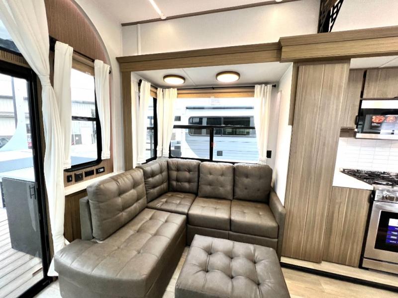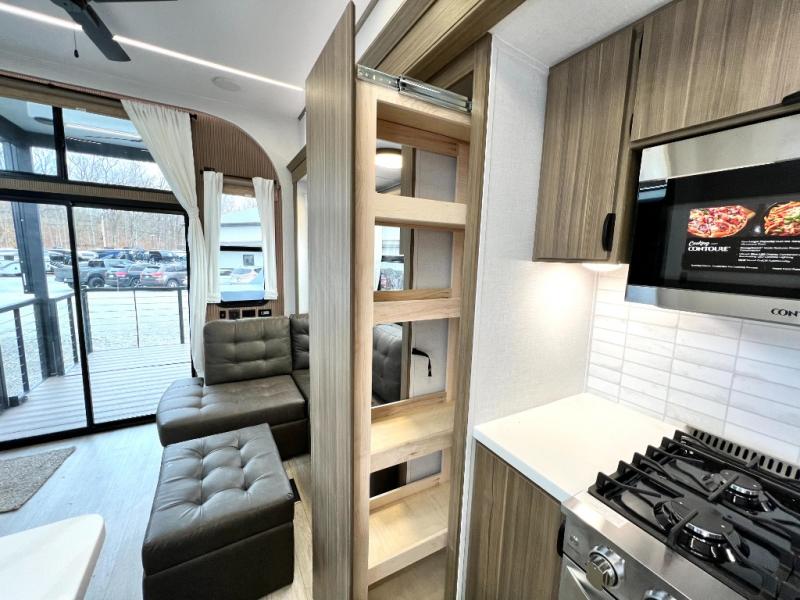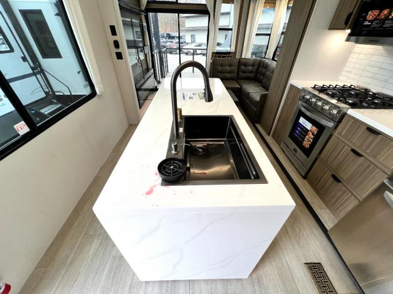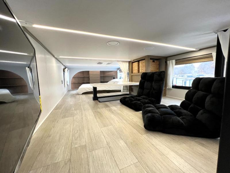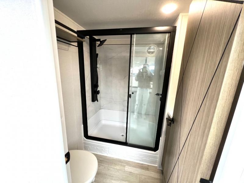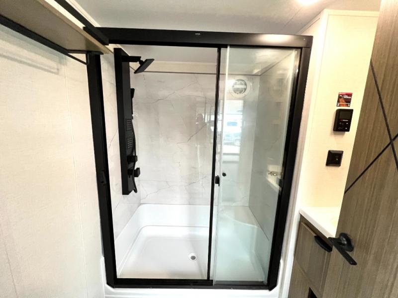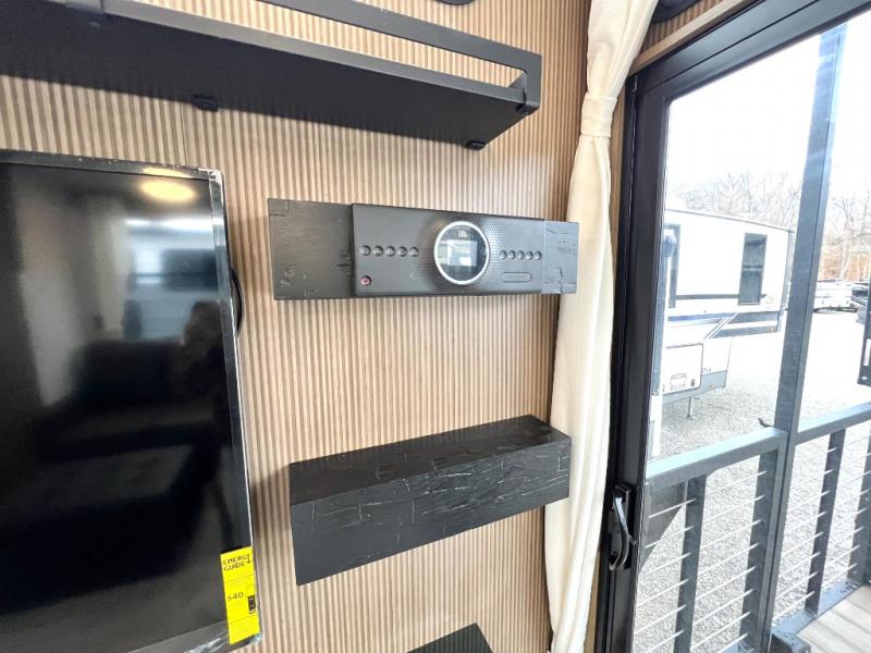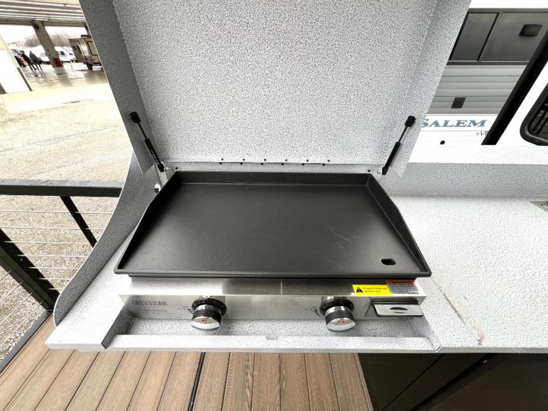 With any Salem Grand Villa destination trailer by Forest River, you can call home wherever you park it! There is a heated and enclosed Accessibelly for added protection in all seasons, LED "Blade Lighting" under the awning, Lippert On-The-Go ladder prep, plus many more exterior conveniences. Elegant curtain rods and curtains will have you feeling right at home, along with stainless steel kitchen appliances, stylish roller shades, and enhanced floating shelves for added storage. Each model includes a central vacuum with a sweep attachment to help keep your space tidy, a 60k on-demand tankless water heater for endless hot showers, a JBL 3-Zone media center, plus available options to further customize your trailer.