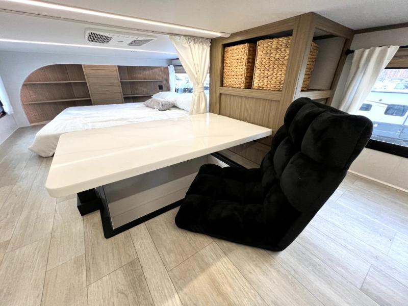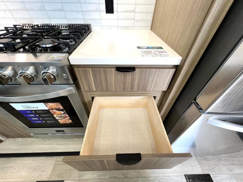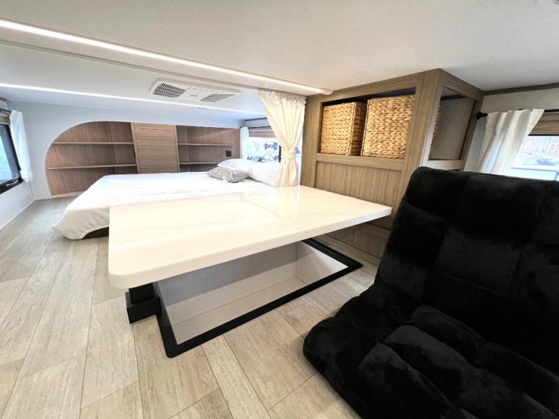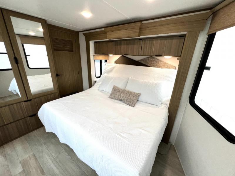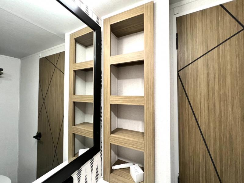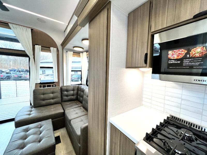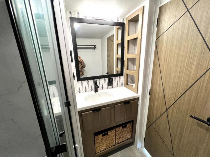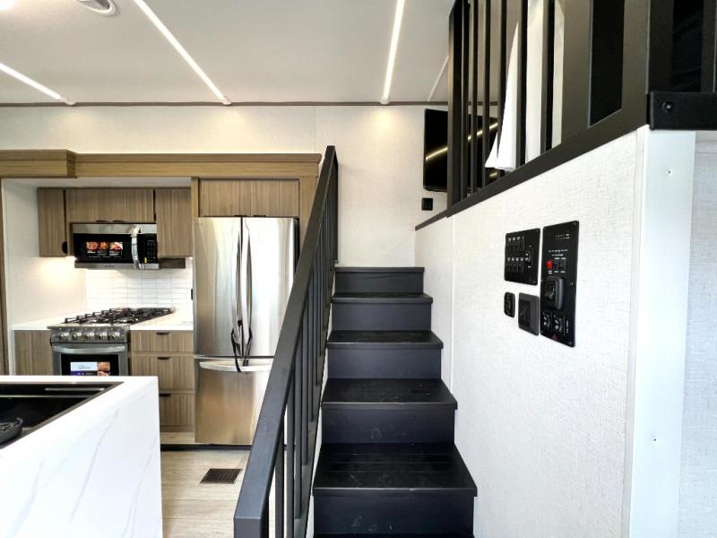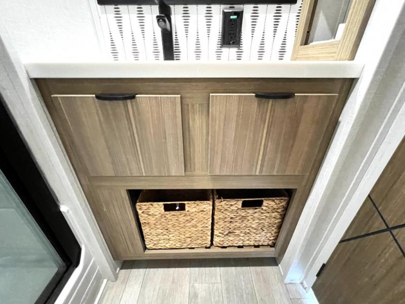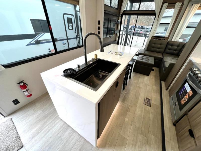 With any Salem Grand Villa destination trailer by Forest River, you can call home wherever you park it! There is a heated and enclosed Accessibelly for added protection in all seasons, LED "Blade Lighting" under the awning, Lippert On-The-Go ladder prep, plus many more exterior conveniences. Elegant curtain rods and curtains will have you feeling right at home, along with stainless steel kitchen appliances, stylish roller shades, and enhanced floating shelves for added storage. Each model includes a central vacuum with a sweep attachment to help keep your space tidy, a 60k on-demand tankless water heater for endless hot showers, a JBL 3-Zone media center, plus available options to further customize your trailer.