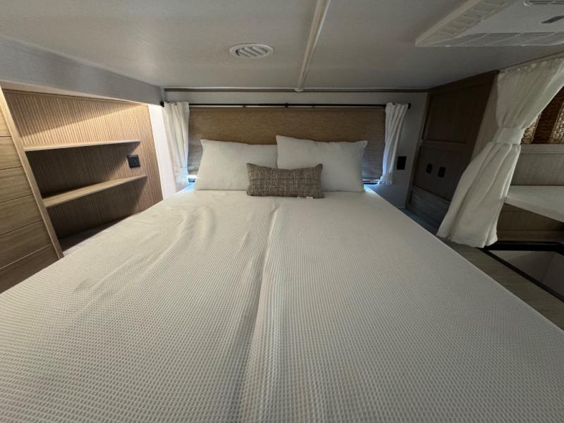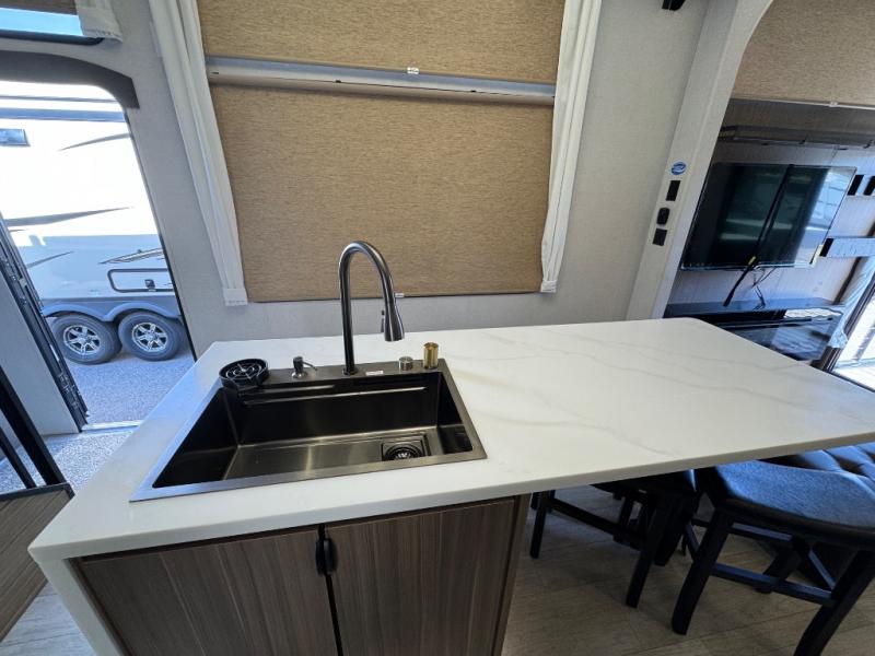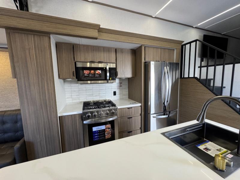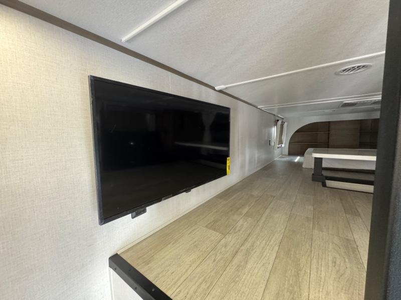 It won't be hard to find comfort in this spacious destination trailer for five to six! The rear covered veranda includes a ceiling fan to keep you cool as you cook on the exterior kitchen! Patio doors here will lead into the main living area that includes an L-shaped sofa with an ottoman plus an entertainment center with a fireplace for cooler evenings. A full kitchen is complete with all the appliances to make meals each day, a kitchen island with four chairs, plus a refrigerator and pantry for food storage. There is a front bedroom with a Versa-Tilt custom king bed slide out, a dresser and wardrobe plus a second wardrobe with washer and dryer prep if you choose to add those appliances. Your guests can make themselves at home in the loft that includes a queen bed, a cabinet with shelves, and a table with space below for feet if you want to eat up here or play a board game!
