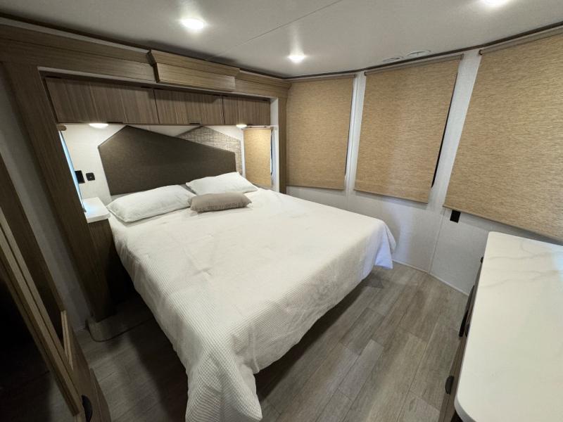 With any Salem Grand Villa destination trailer by Forest River, you can call home wherever you park it! There is a heated and enclosed Accessibelly for added protection in all seasons, LED "Blade Lighting" under the awning, Lippert On-The-Go ladder prep, plus many more exterior conveniences. Elegant curtain rods and curtains will have you feeling right at home, along with stainless steel kitchen appliances, stylish roller shades, and enhanced floating shelves for added storage. Each model includes a central vacuum with a sweep attachment to help keep your space tidy, a 60k on-demand tankless water heater for endless hot showers, a JBL 3-Zone media center, plus available options to further customize your trailer.