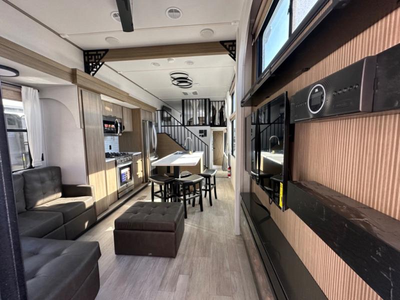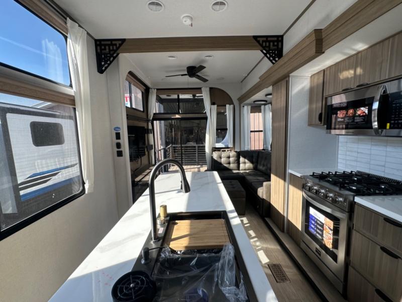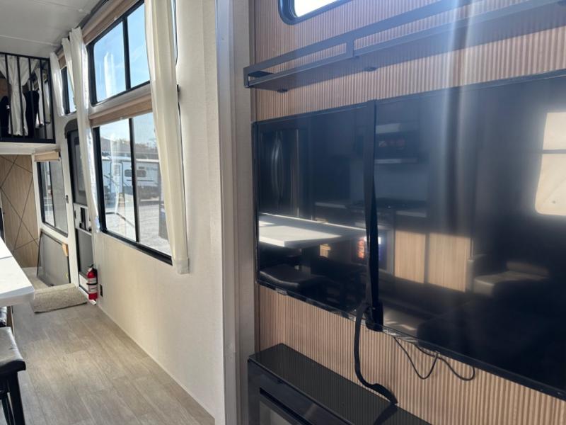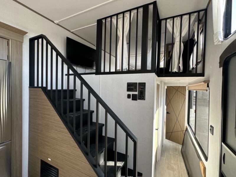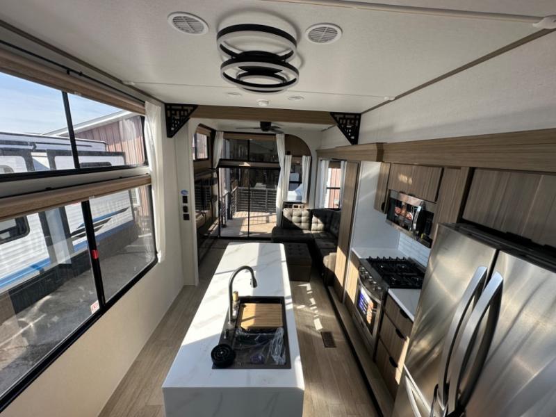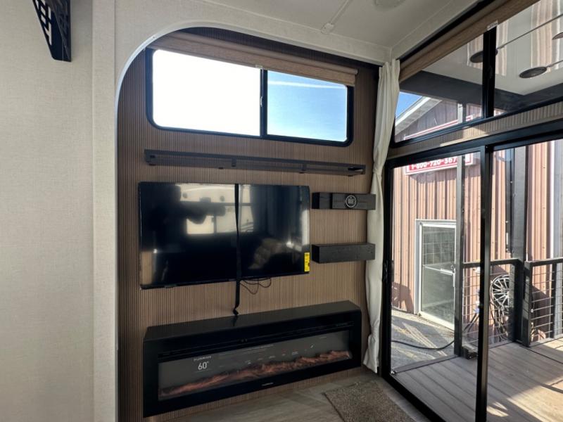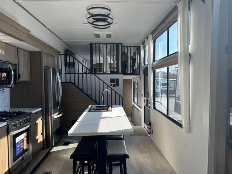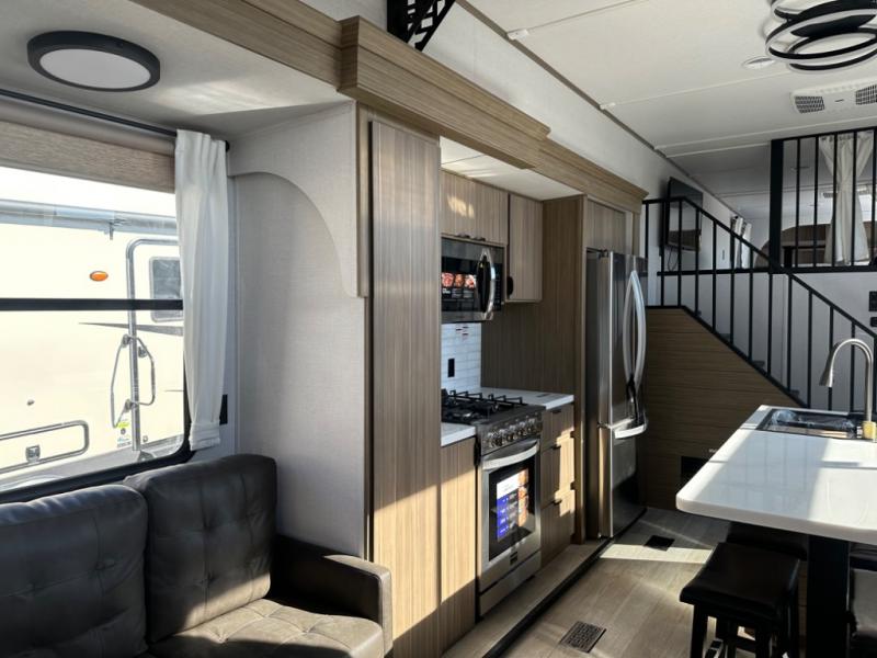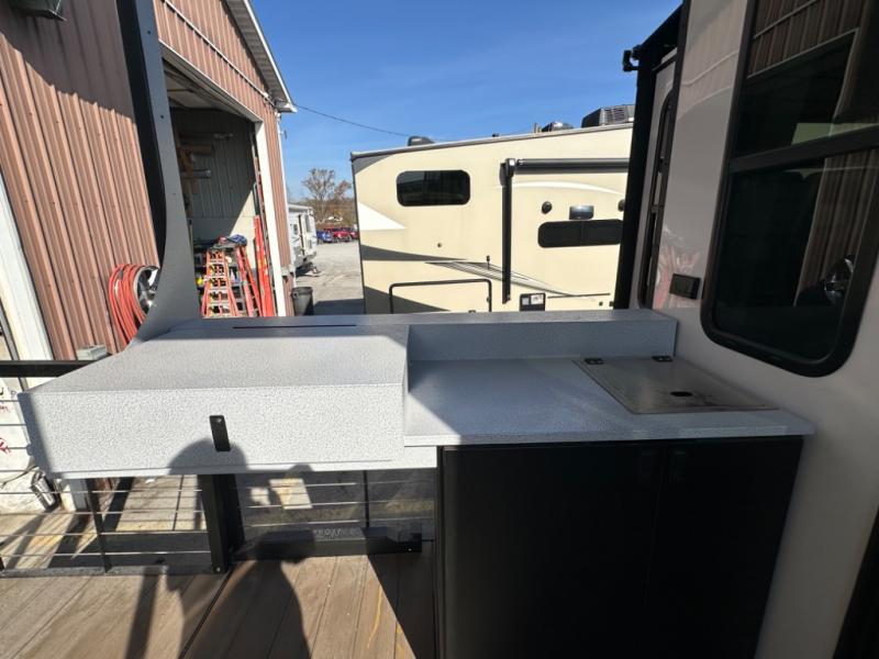 It won't be hard to find comfort in this spacious destination trailer for five to six! The rear covered veranda includes a ceiling fan to keep you cool as you cook on the exterior kitchen! Patio doors here will lead into the main living area that includes an L-shaped sofa with an ottoman plus an entertainment center with a fireplace for cooler evenings. A full kitchen is complete with all the appliances to make meals each day, a kitchen island with four chairs, plus a refrigerator and pantry for food storage. There is a front bedroom with a Versa-Tilt custom king bed slide out, a dresser and wardrobe plus a second wardrobe with washer and dryer prep if you choose to add those appliances. Your guests can make themselves at home in the loft that includes a queen bed, a cabinet with shelves, and a table with space below for feet if you want to eat up here or play a board game!