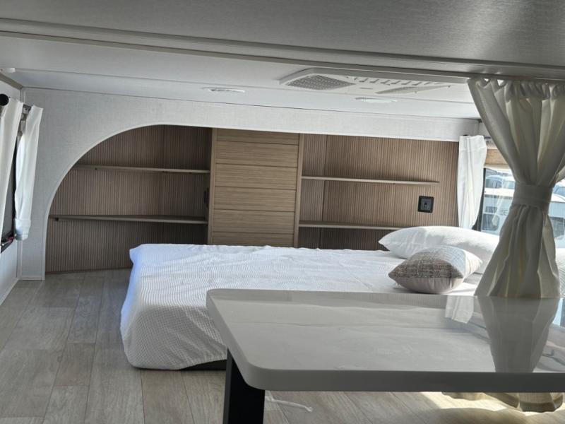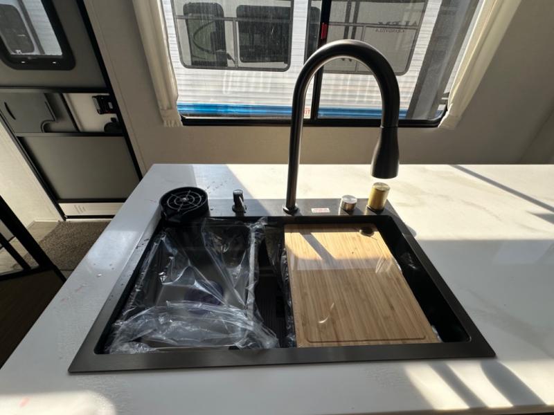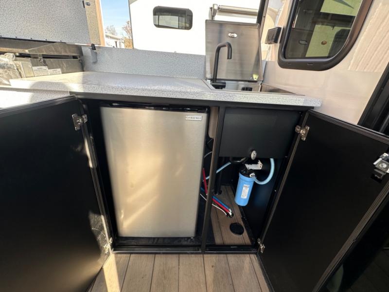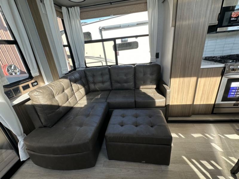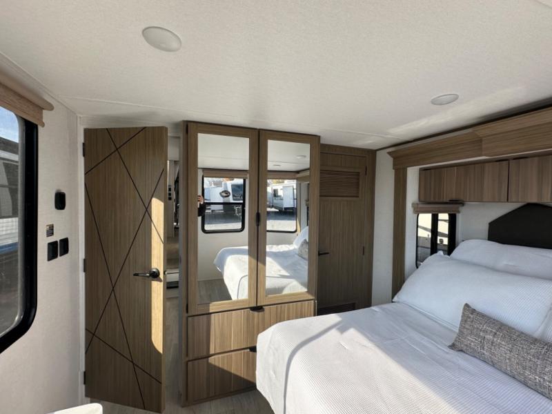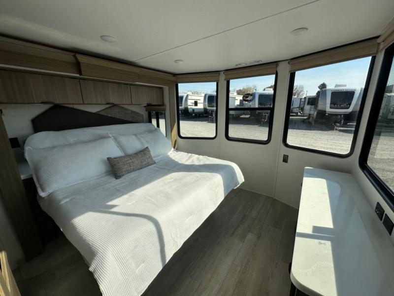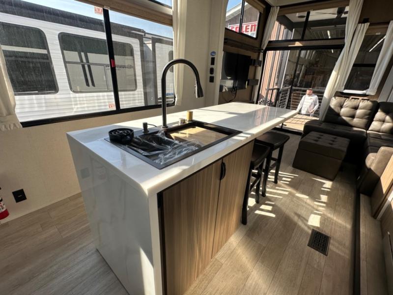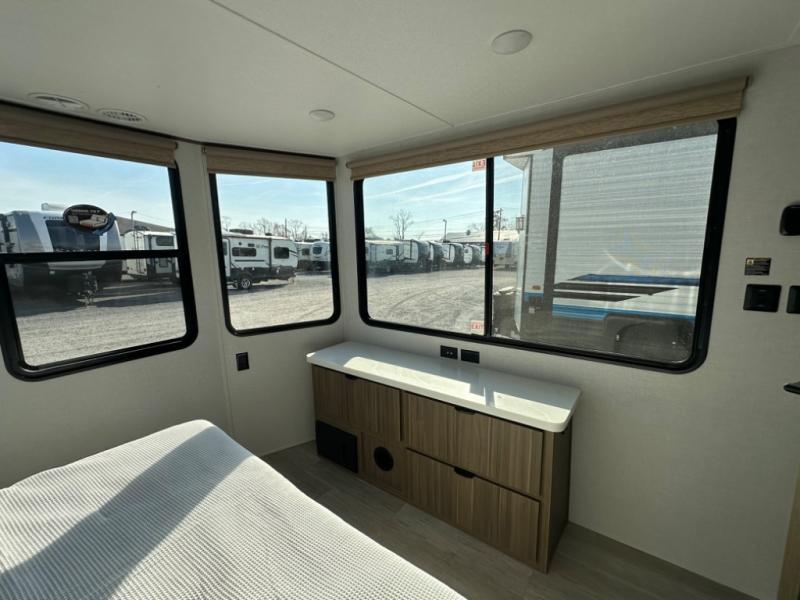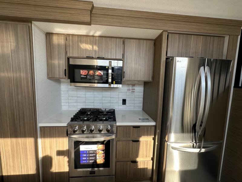 It won't be hard to find comfort in this spacious destination trailer for five to six! The rear covered veranda includes a ceiling fan to keep you cool as you cook on the exterior kitchen! Patio doors here will lead into the main living area that includes an L-shaped sofa with an ottoman plus an entertainment center with a fireplace for cooler evenings. A full kitchen is complete with all the appliances to make meals each day, a kitchen island with four chairs, plus a refrigerator and pantry for food storage. There is a front bedroom with a Versa-Tilt custom king bed slide out, a dresser and wardrobe plus a second wardrobe with washer and dryer prep if you choose to add those appliances. Your guests can make themselves at home in the loft that includes a queen bed, a cabinet with shelves, and a table with space below for feet if you want to eat up here or play a board game!