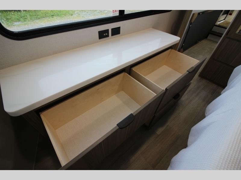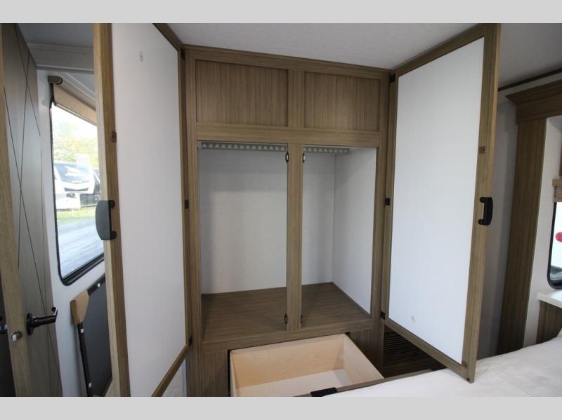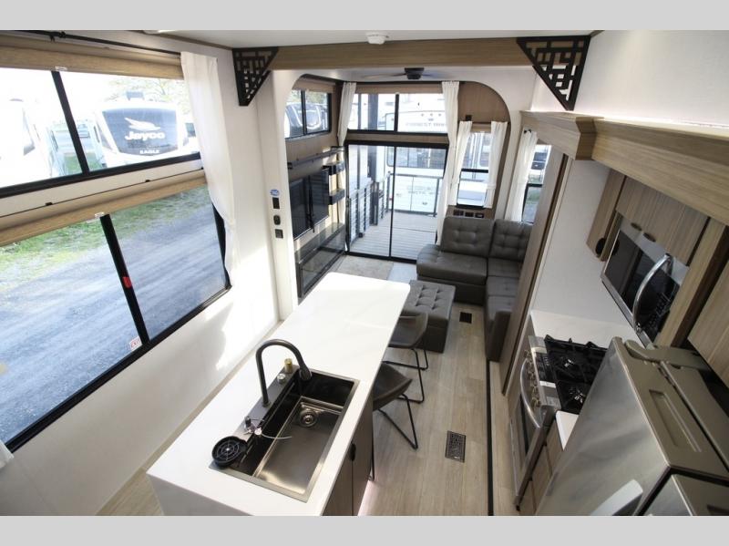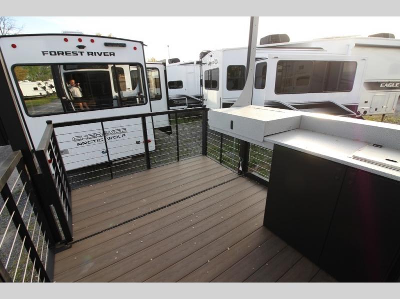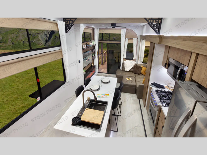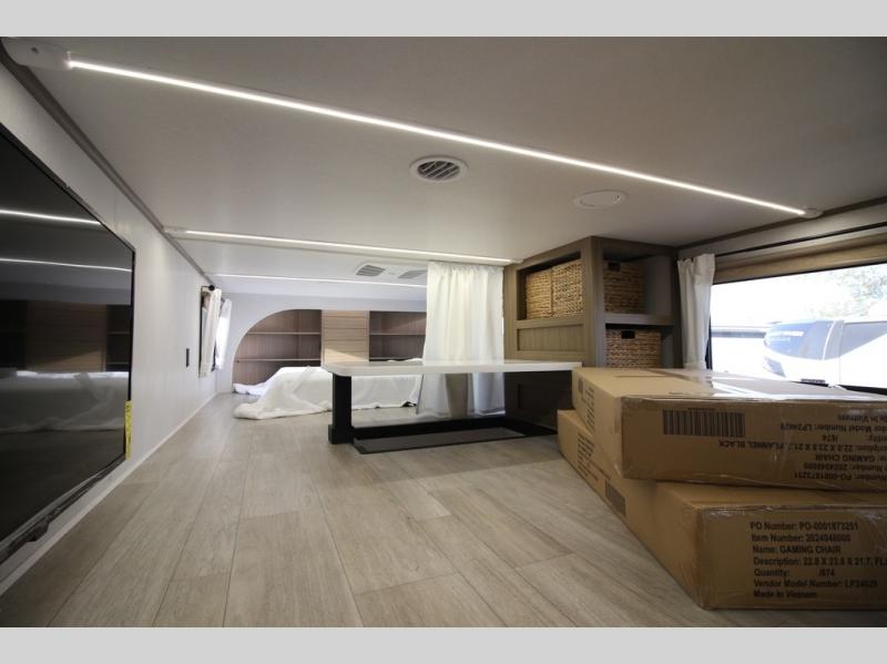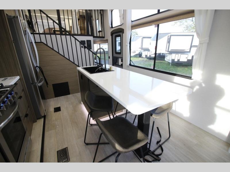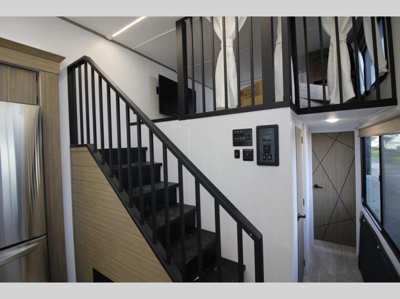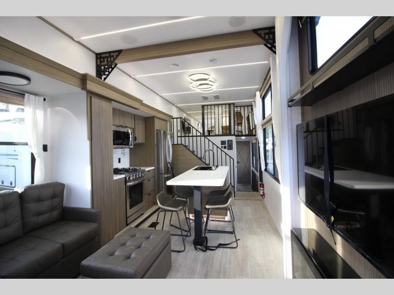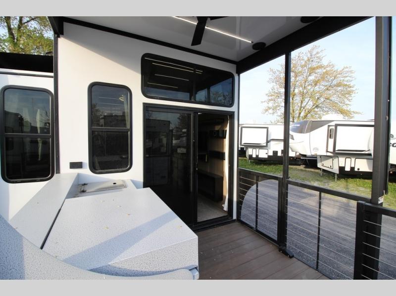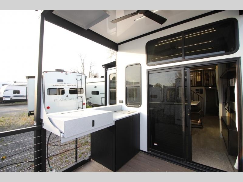 It won't be hard to find comfort in this spacious destination trailer for five to six! The rear covered veranda includes a ceiling fan to keep you cool as you cook on the exterior kitchen! Patio doors here will lead into the main living area that includes an L-shaped sofa with an ottoman plus an entertainment center with a fireplace for cooler evenings. A full kitchen is complete with all the appliances to make meals each day, a kitchen island with four chairs, plus a refrigerator and pantry for food storage. There is a front bedroom with a Versa-Tilt custom king bed slide out, a dresser and wardrobe plus a second wardrobe with washer and dryer prep if you choose to add those appliances. Your guests can make themselves at home in the loft that includes a queen bed, a cabinet with shelves, and a table with space below for feet if you want to eat up here or play a board game!