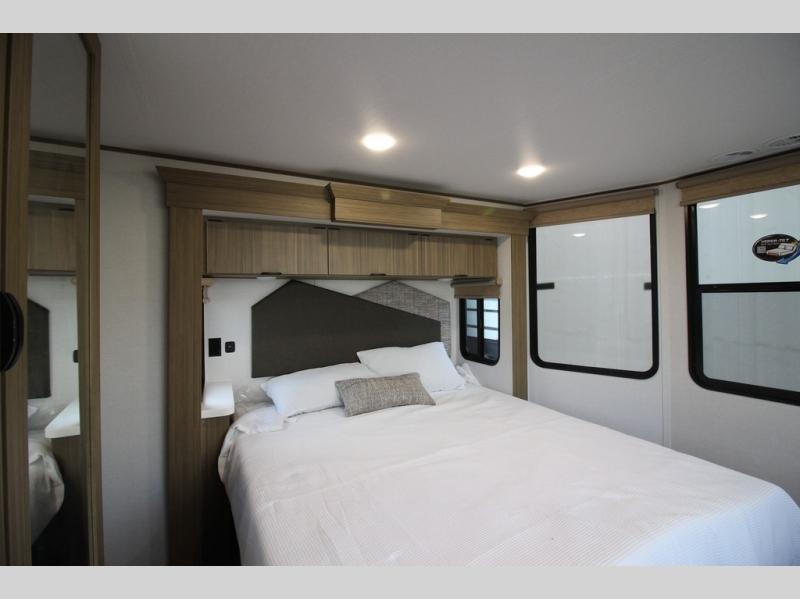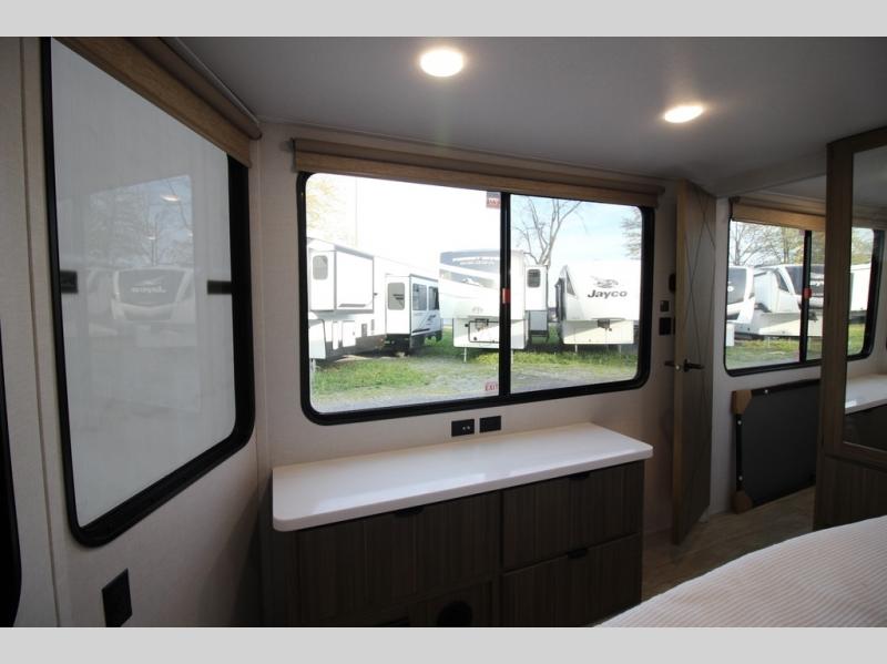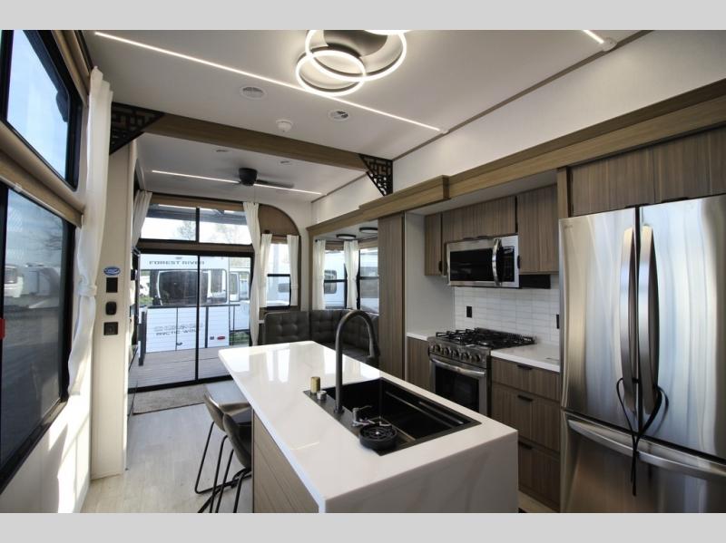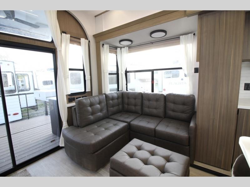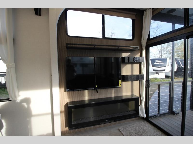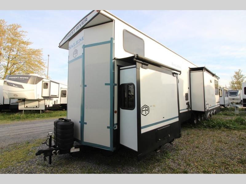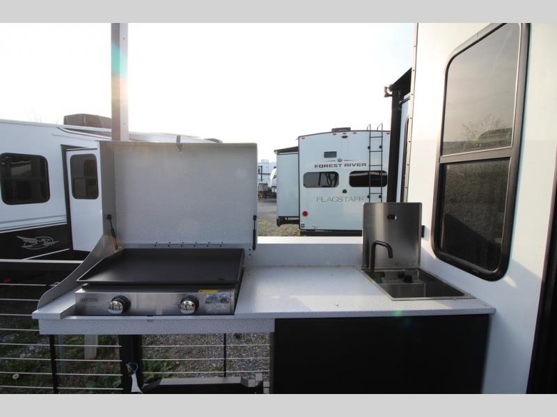 With any Salem Grand Villa destination trailer by Forest River, you can call home wherever you park it! There is a heated and enclosed Accessibelly for added protection in all seasons, LED "Blade Lighting" under the awning, Lippert On-The-Go ladder prep, plus many more exterior conveniences. Elegant curtain rods and curtains will have you feeling right at home, along with stainless steel kitchen appliances, stylish roller shades, and enhanced floating shelves for added storage. Each model includes a central vacuum with a sweep attachment to help keep your space tidy, a 60k on-demand tankless water heater for endless hot showers, a JBL 3-Zone media center, plus available options to further customize your trailer.