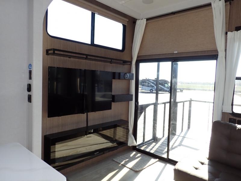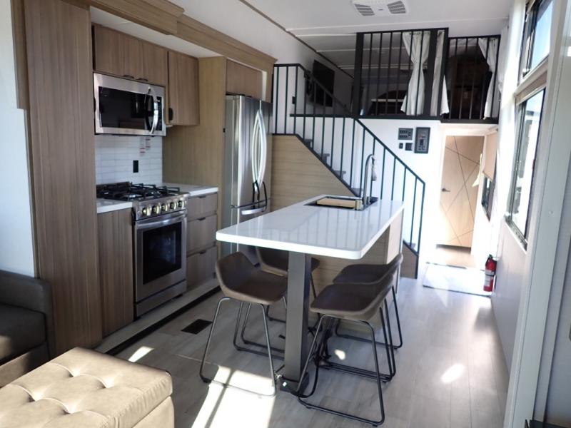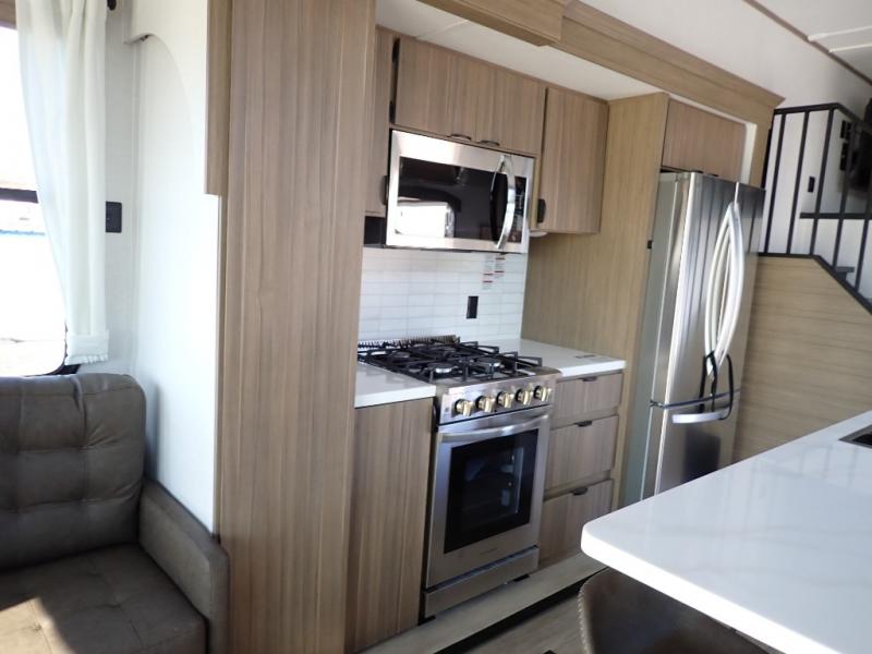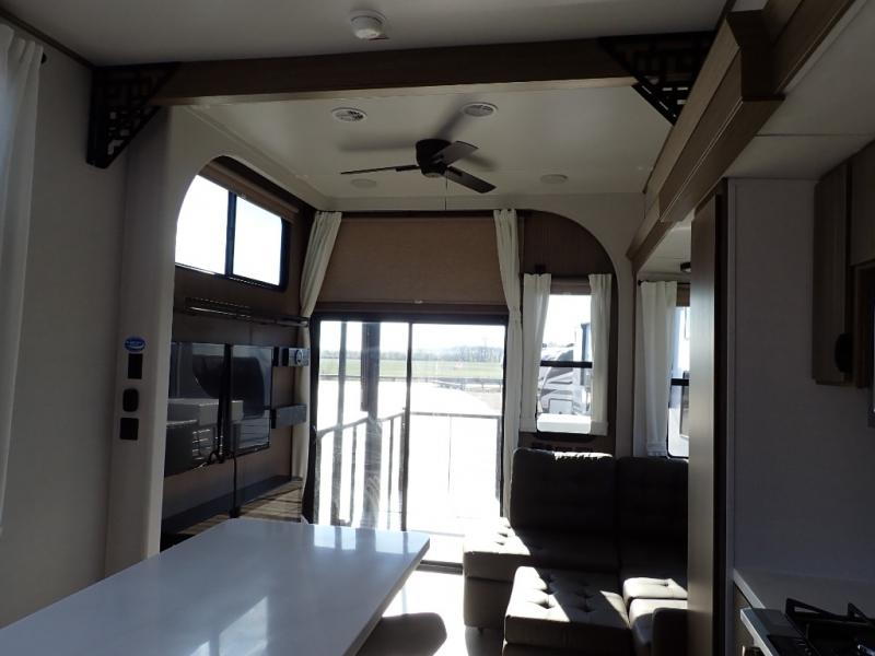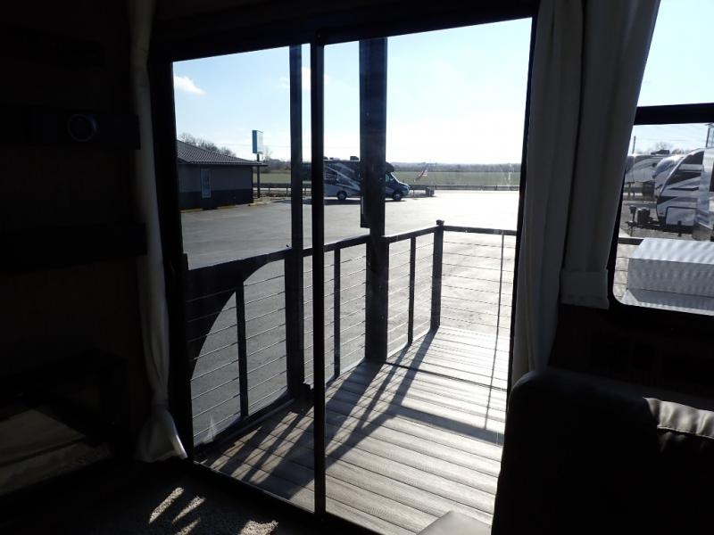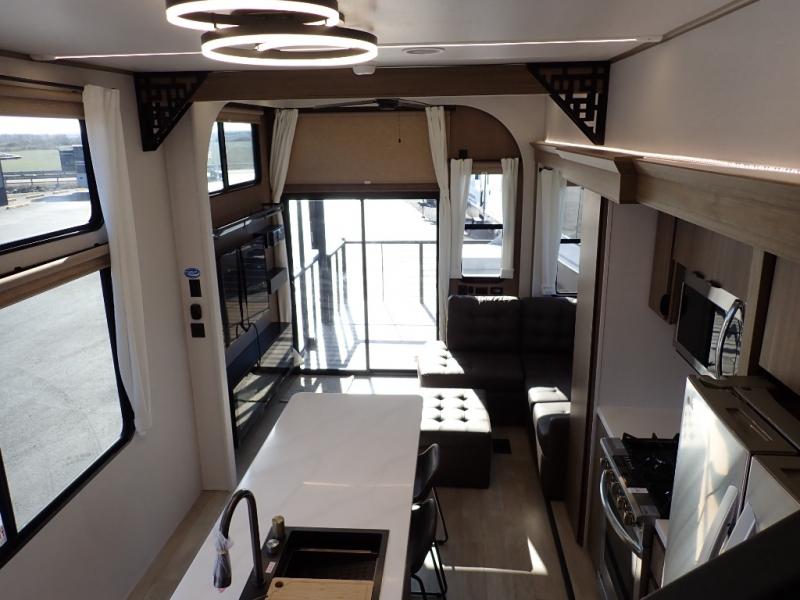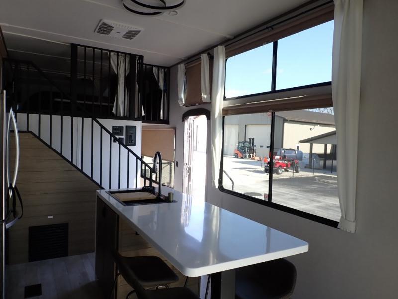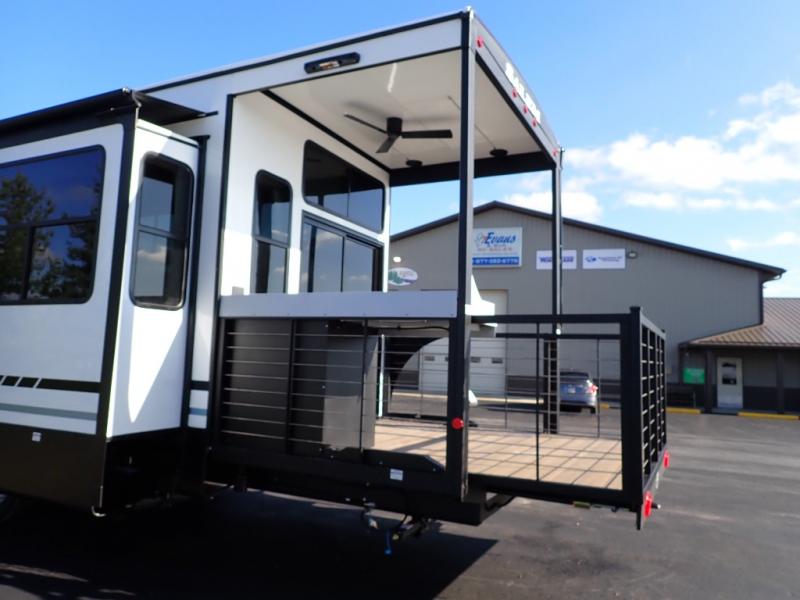 It won't be hard to find comfort in this spacious destination trailer for five to six! The rear covered veranda includes a ceiling fan to keep you cool as you cook on the exterior kitchen! Patio doors here will lead into the main living area that includes an L-shaped sofa with an ottoman plus an entertainment center with a fireplace for cooler evenings. A full kitchen is complete with all the appliances to make meals each day, a kitchen island with four chairs, plus a refrigerator and pantry for food storage. There is a front bedroom with a Versa-Tilt custom king bed slide out, a dresser and wardrobe plus a second wardrobe.Your guests can make themselves at home in the loft that includes a queen bed, a cabinet with shelves, and a table with space below for feet if you want to eat up here or play a board game!