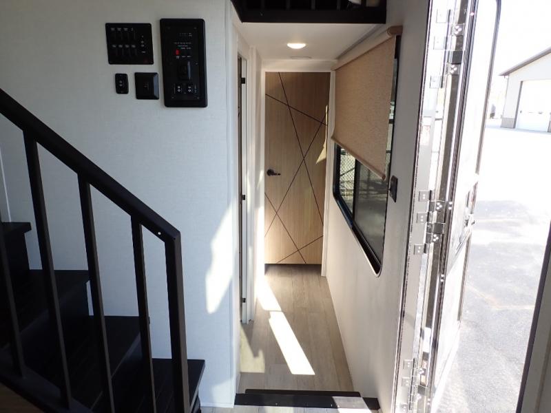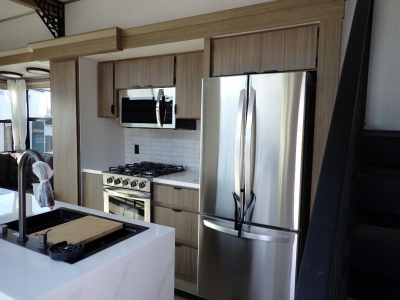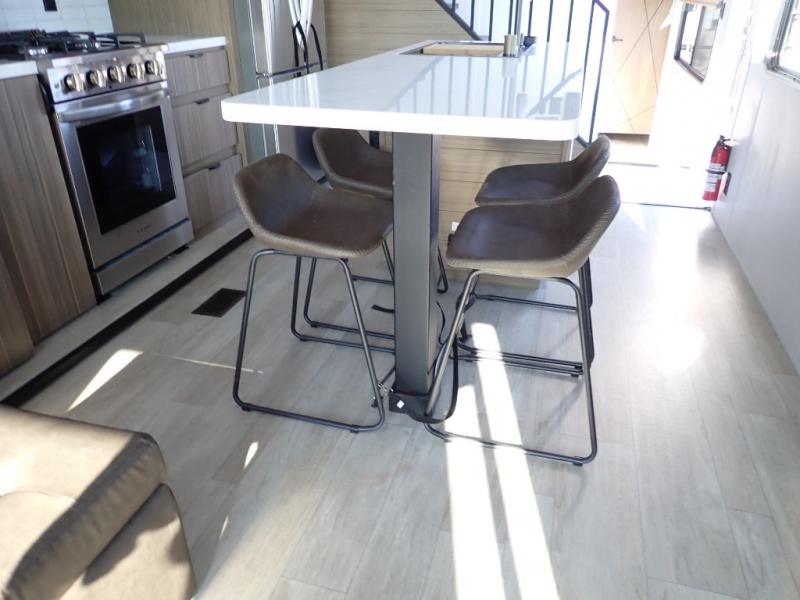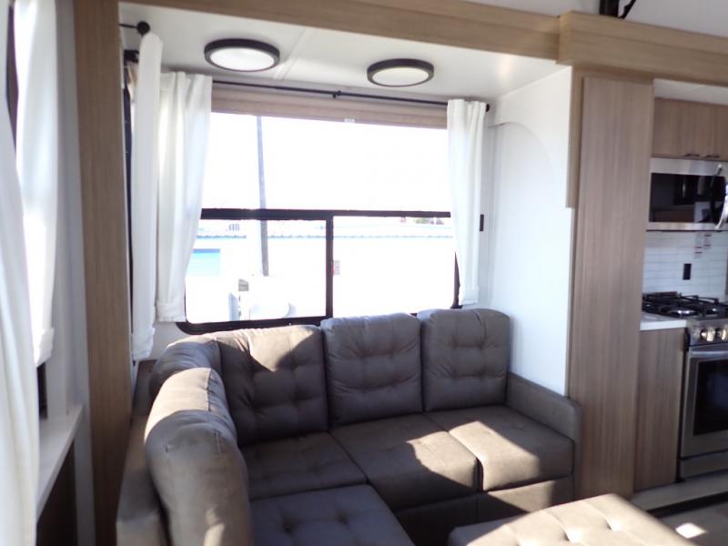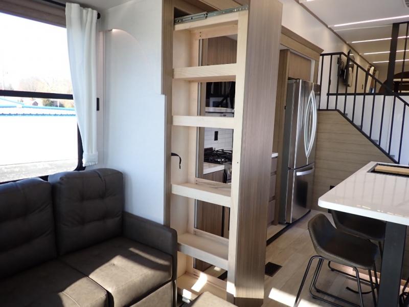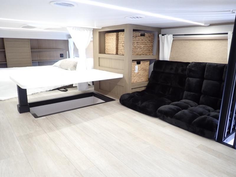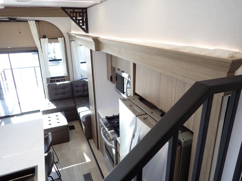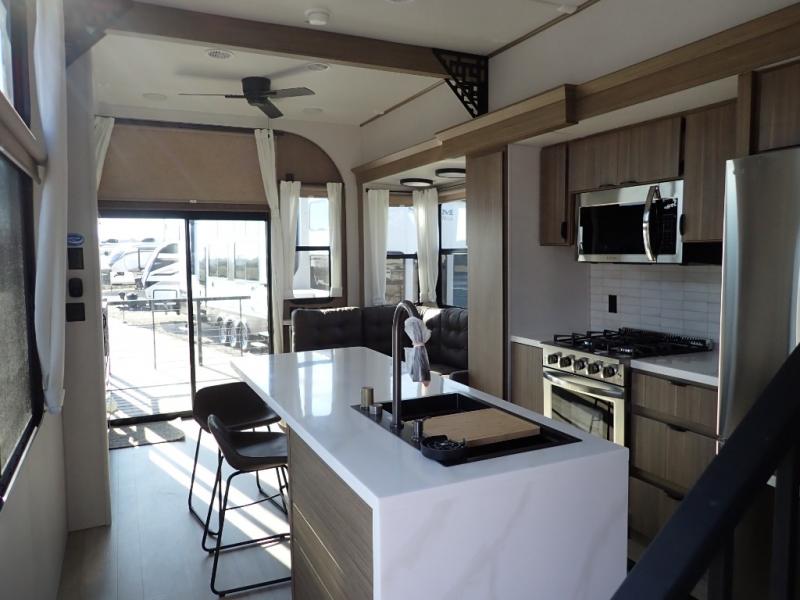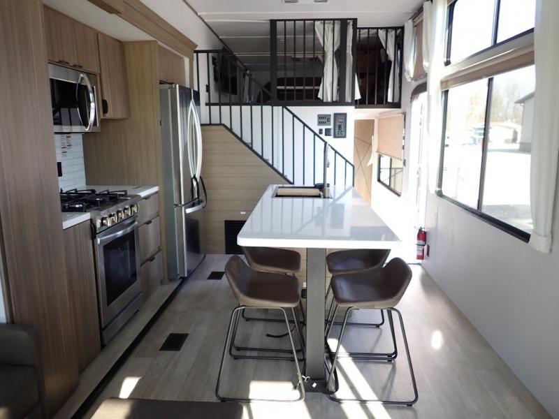 It won't be hard to find comfort in this spacious destination trailer for five to six! The rear covered veranda includes a ceiling fan to keep you cool as you cook on the exterior kitchen! Patio doors here will lead into the main living area that includes an L-shaped sofa with an ottoman plus an entertainment center with a fireplace for cooler evenings. A full kitchen is complete with all the appliances to make meals each day, a kitchen island with four chairs, plus a refrigerator and pantry for food storage. There is a front bedroom with a Versa-Tilt custom king bed slide out, a dresser and wardrobe plus a second wardrobe.Your guests can make themselves at home in the loft that includes a queen bed, a cabinet with shelves, and a table with space below for feet if you want to eat up here or play a board game!