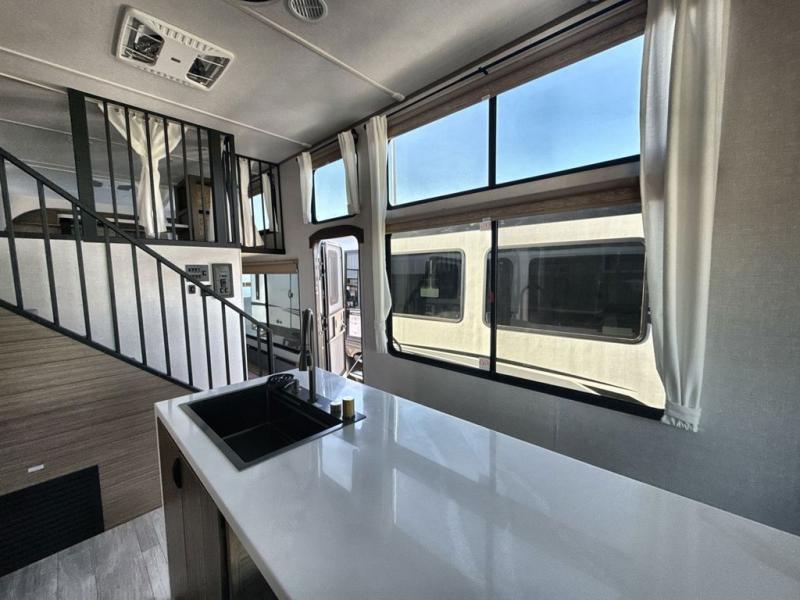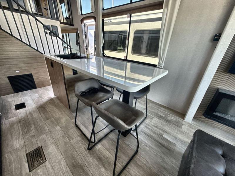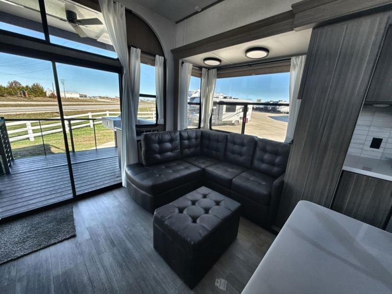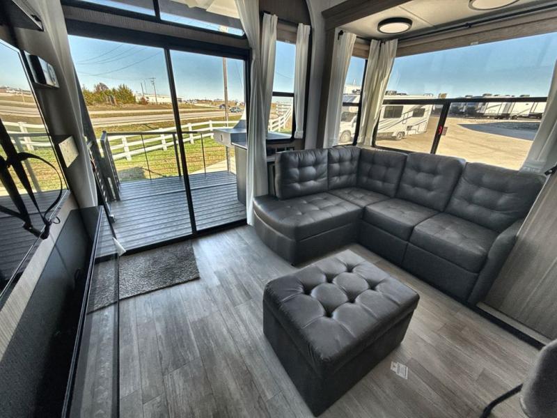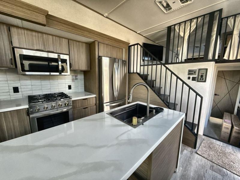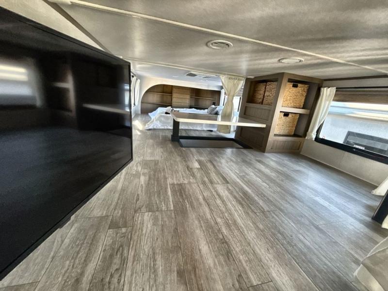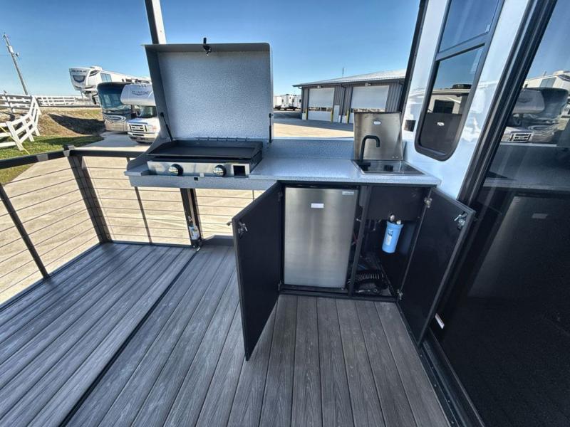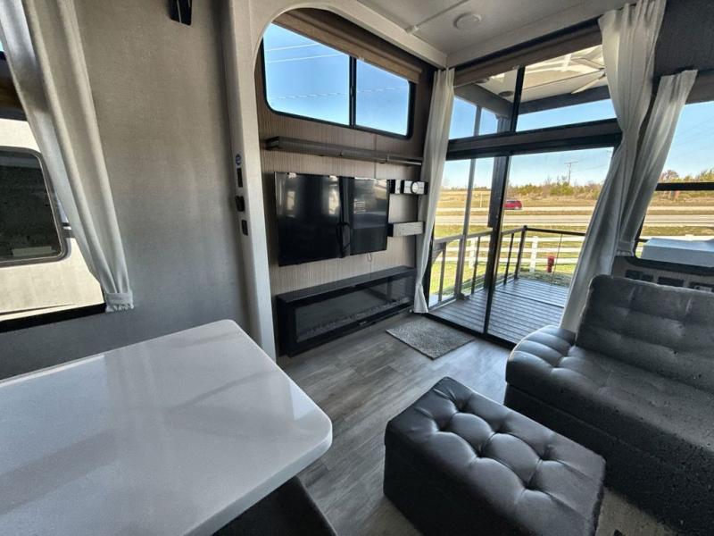 It won't be hard to find comfort in this spacious destination trailer for five to six! The rear covered veranda includes a ceiling fan to keep you cool as you cook on the exterior kitchen! Patio doors here will lead into the main living area that includes an L-shaped sofa with an ottoman plus an entertainment center with a fireplace for cooler evenings. A full kitchen is complete with all the appliances to make meals each day, a kitchen island with four chairs, plus a refrigerator and pantry for food storage. There is a front bedroom with a Versa-Tilt custom king bed slide out, a dresser and wardrobe plus a second wardrobe with washer and dryer prep if you choose to add those appliances. Your guests can make themselves at home in the loft that includes a queen bed, a cabinet with shelves, and a table with space below for feet if you want to eat up here or play a board game!