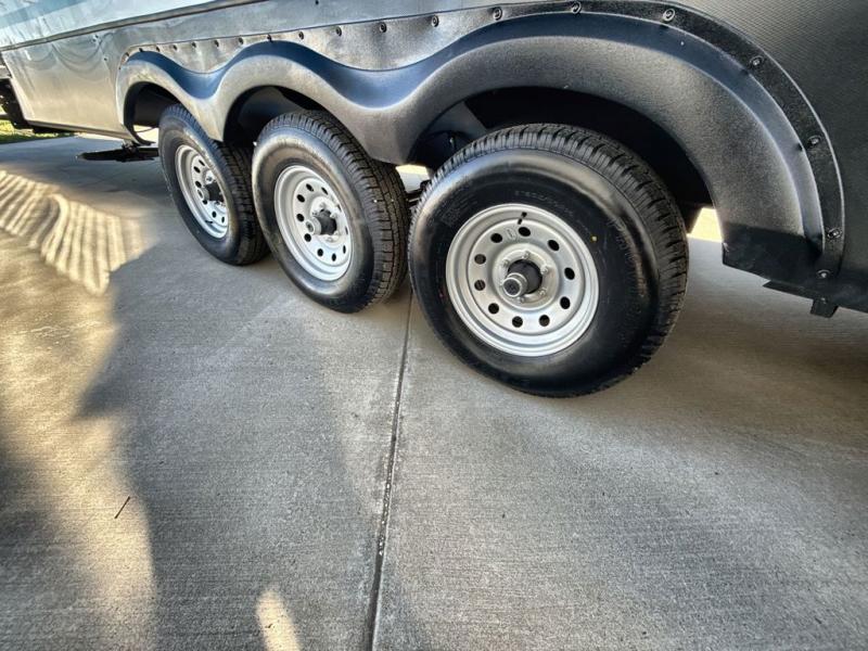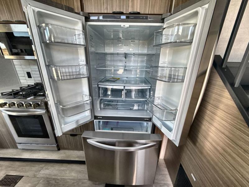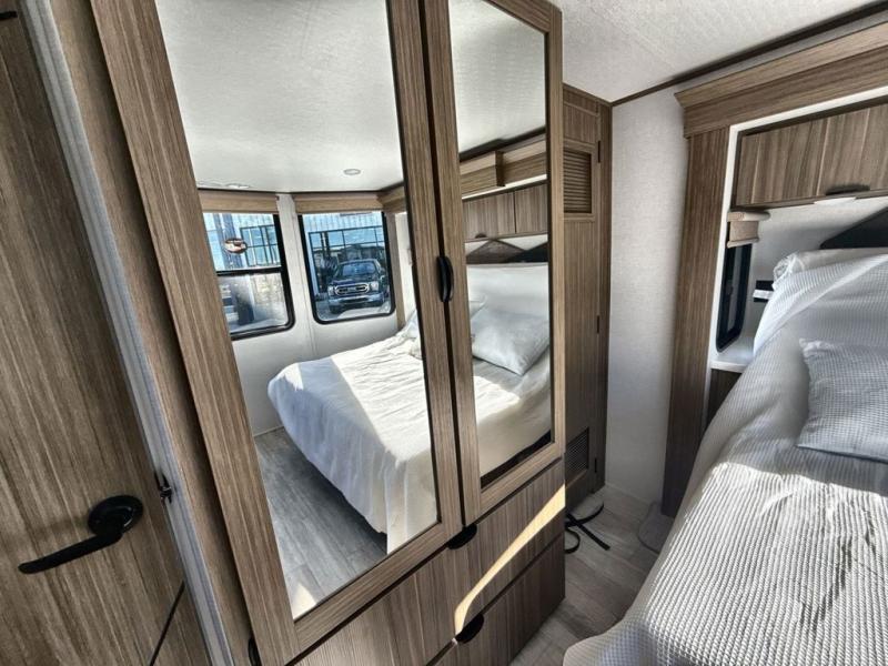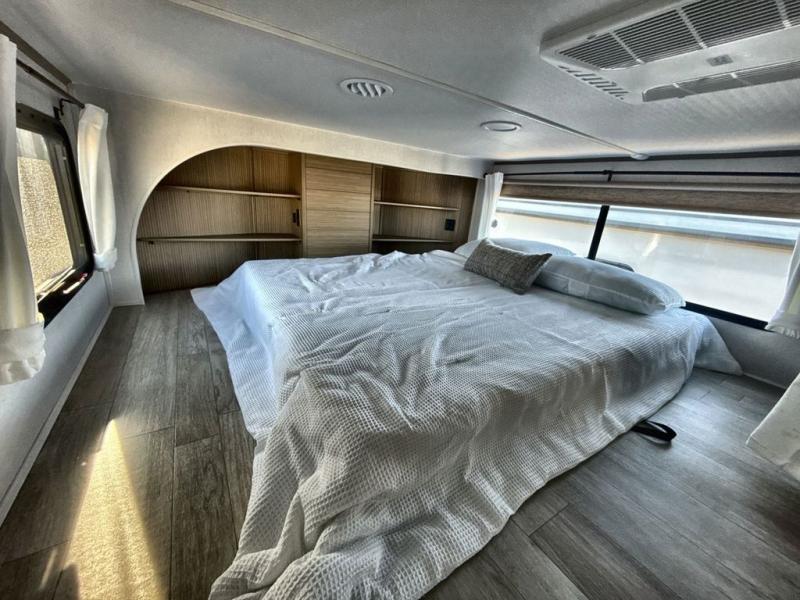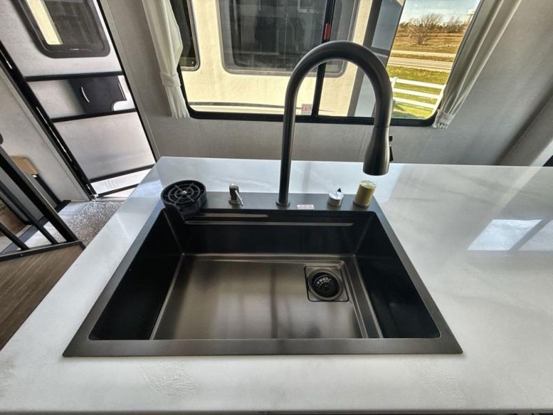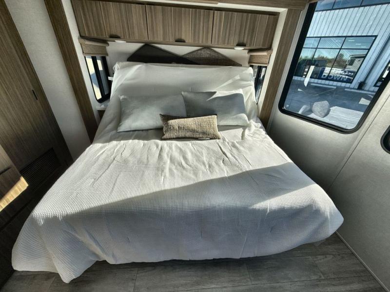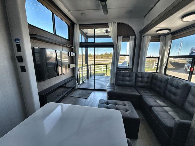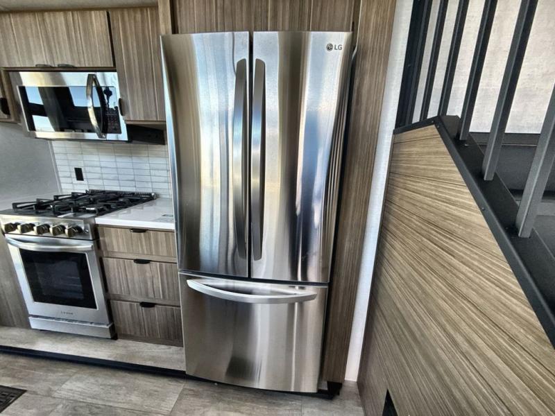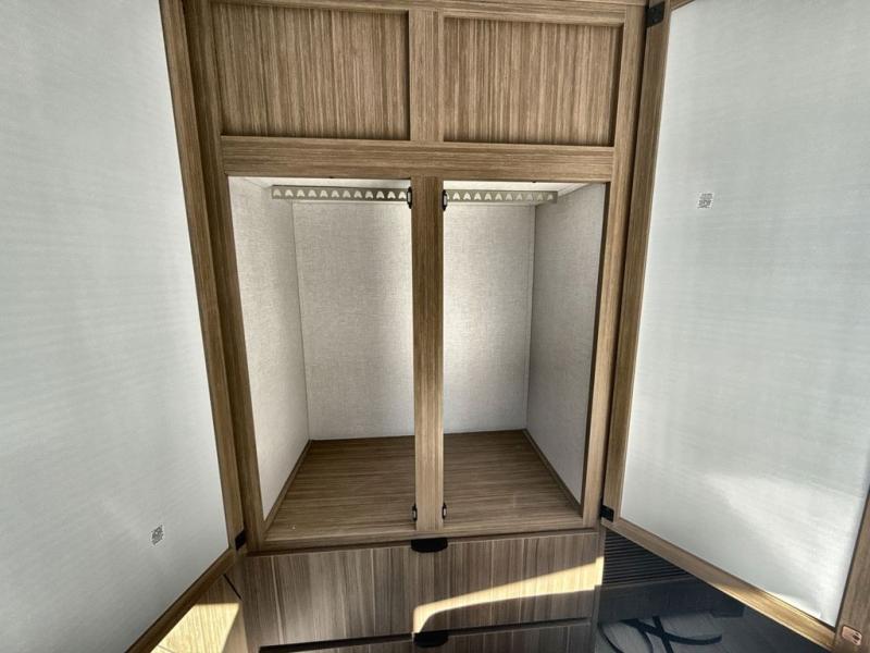 It won't be hard to find comfort in this spacious destination trailer for five to six! The rear covered veranda includes a ceiling fan to keep you cool as you cook on the exterior kitchen! Patio doors here will lead into the main living area that includes an L-shaped sofa with an ottoman plus an entertainment center with a fireplace for cooler evenings. A full kitchen is complete with all the appliances to make meals each day, a kitchen island with four chairs, plus a refrigerator and pantry for food storage. There is a front bedroom with a Versa-Tilt custom king bed slide out, a dresser and wardrobe plus a second wardrobe with washer and dryer prep if you choose to add those appliances. Your guests can make themselves at home in the loft that includes a queen bed, a cabinet with shelves, and a table with space below for feet if you want to eat up here or play a board game!