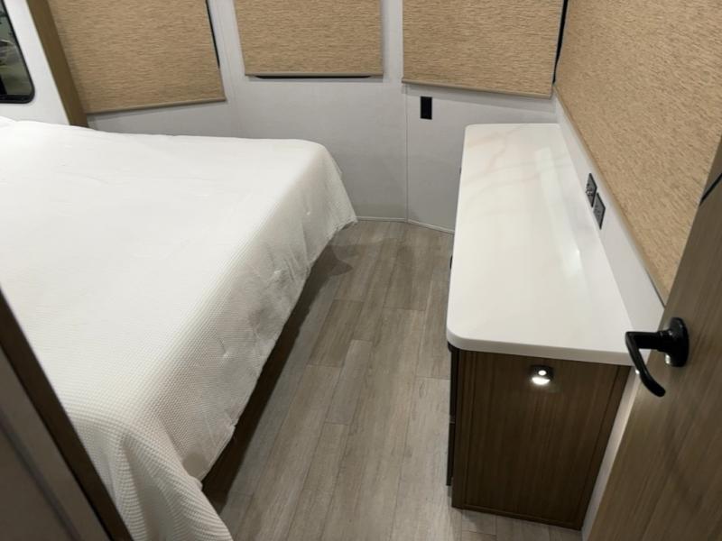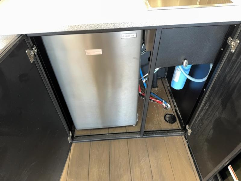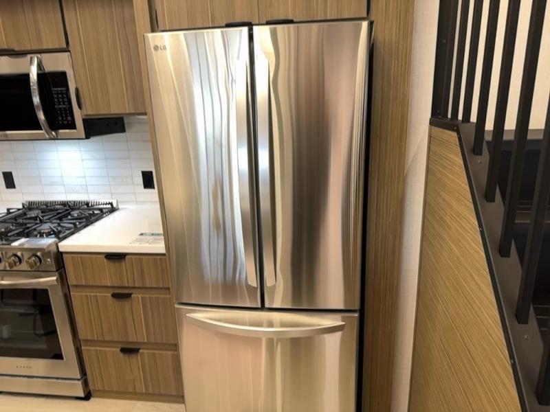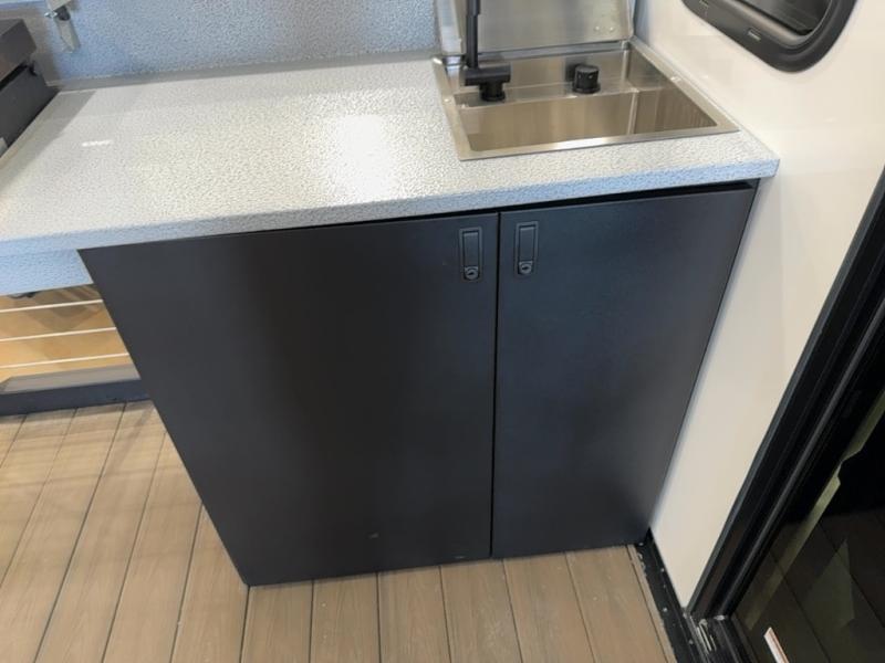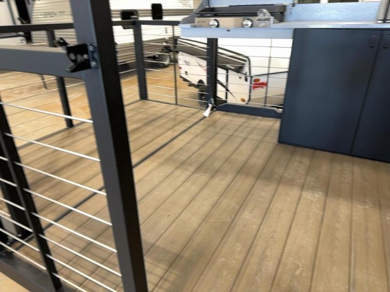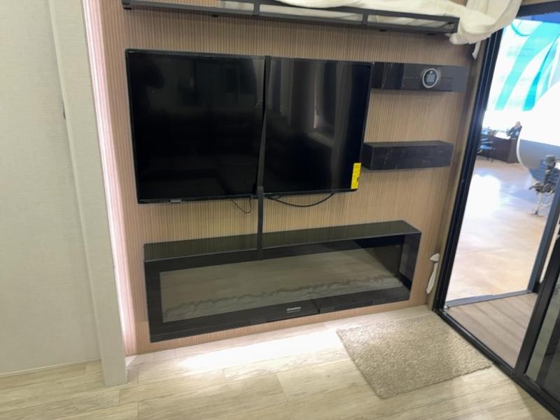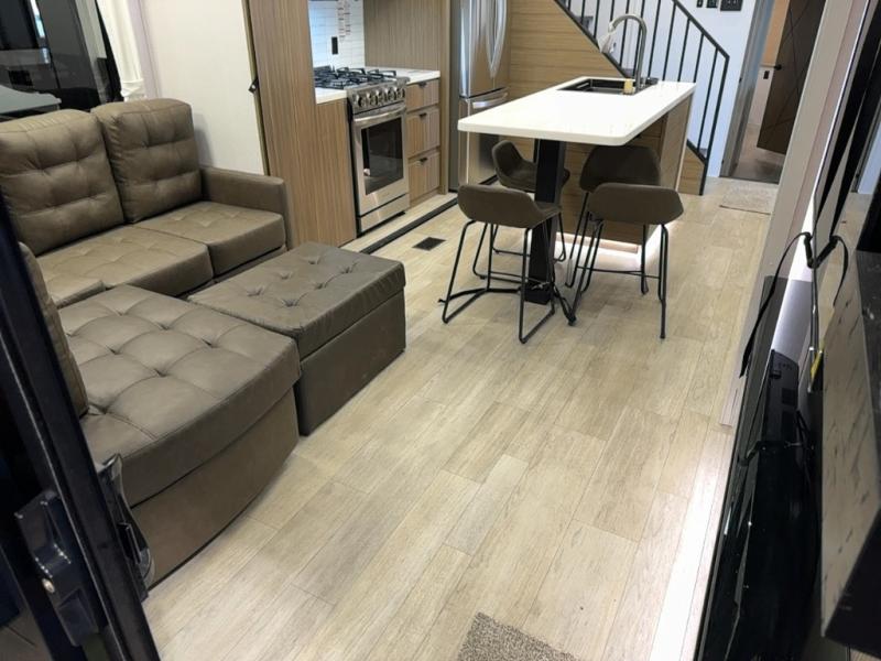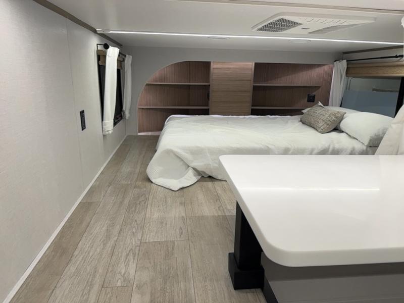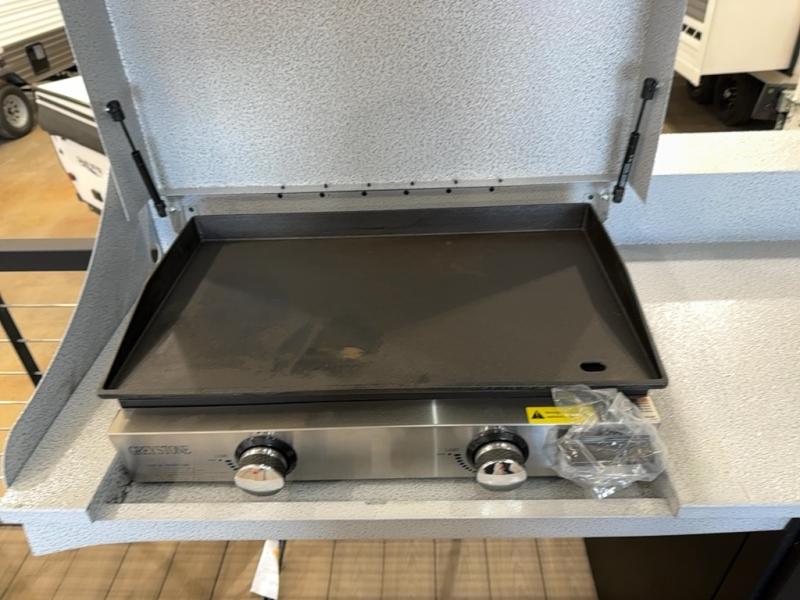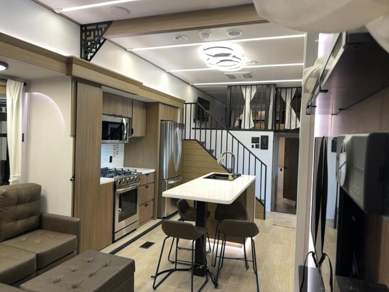 It won't be hard to find comfort in this spacious destination trailer for five to six! The rear covered veranda includes a ceiling fan to keep you cool as you cook on the exterior kitchen! Patio doors here will lead into the main living area that includes an L-shaped sofa with an ottoman plus an entertainment center with a fireplace for cooler evenings. A full kitchen is complete with all the appliances to make meals each day, a kitchen island with four chairs, plus a refrigerator and pantry for food storage. There is a front bedroom with a Versa-Tilt custom king bed slide out, a dresser and wardrobe plus a second wardrobe with washer and dryer prep if you choose to add those appliances. Your guests can make themselves at home in the loft that includes a queen bed, a cabinet with shelves, and a table with space below for feet if you want to eat up here or play a board game!