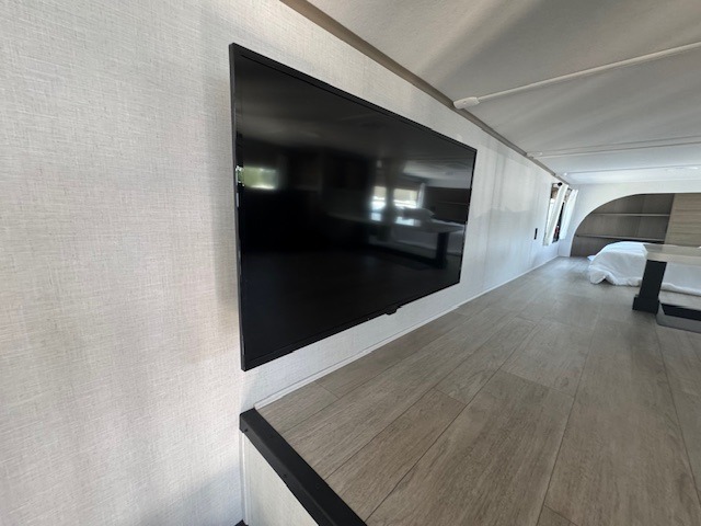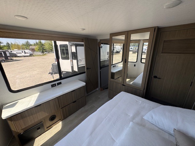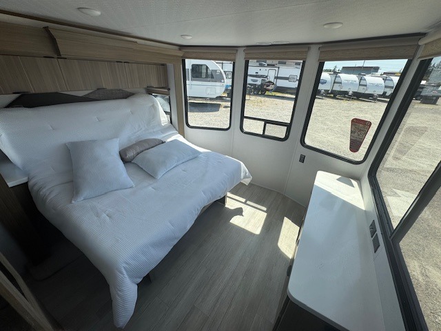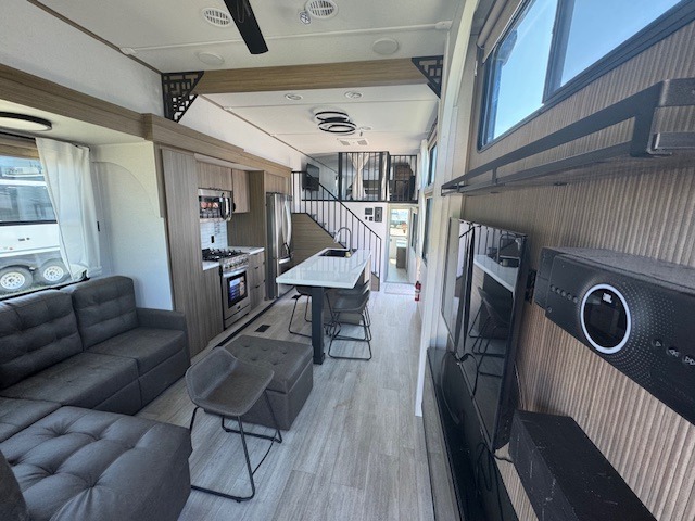 The full kitchen features a center island with four chairs, pantry, and residential appliances. Sleep soundly in the front bedroom with a Versa-Tilt custom king bed, ample storage, and washer/dryer prep. Guests will love the loft with queen bed, storage, and even space to play games or dine.
