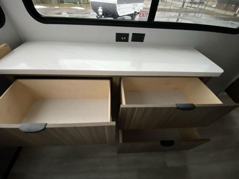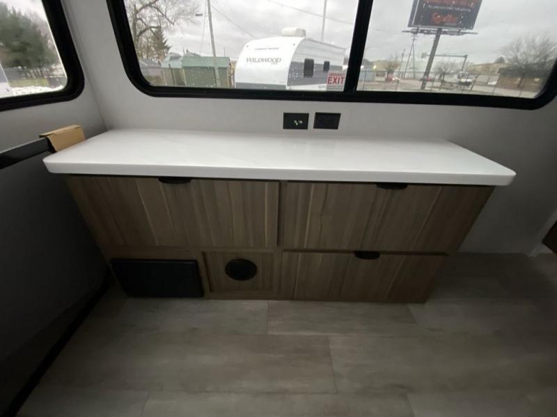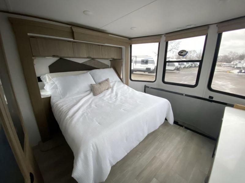 It won't be hard to find comfort in this spacious destination trailer for five to six! The rear covered veranda includes a ceiling fan to keep you cool as you cook on the exterior kitchen! Patio doors here will lead into the main living area that includes an L-shaped sofa with an ottoman plus an entertainment center with a fireplace for cooler evenings. A full kitchen is complete with all the appliances to make meals each day, a kitchen island with four chairs, plus a refrigerator and pantry for food storage. There is a front bedroom with a Versa-Tilt custom king bed slide out, a dresser and wardrobe plus a second wardrobe with washer and dryer prep if you choose to add those appliances. Your guests can make themselves at home in the loft that includes a queen bed, a cabinet with shelves, and a table with space below for feet if you want to eat up here or play a board game!