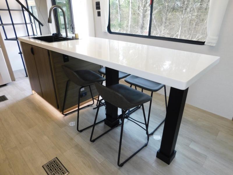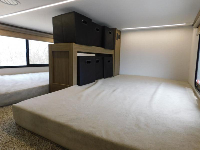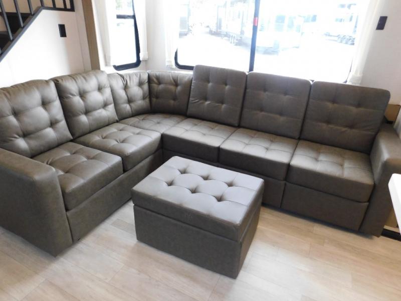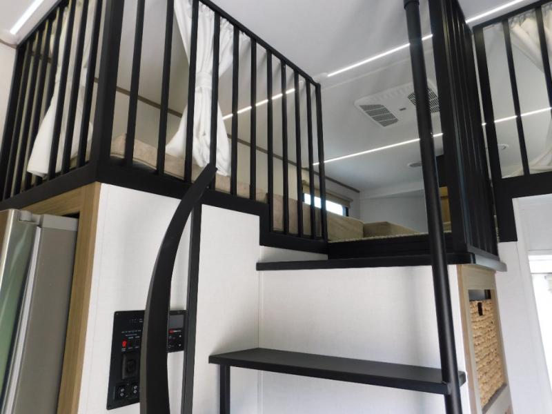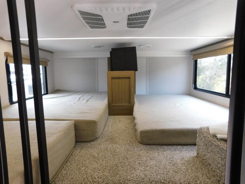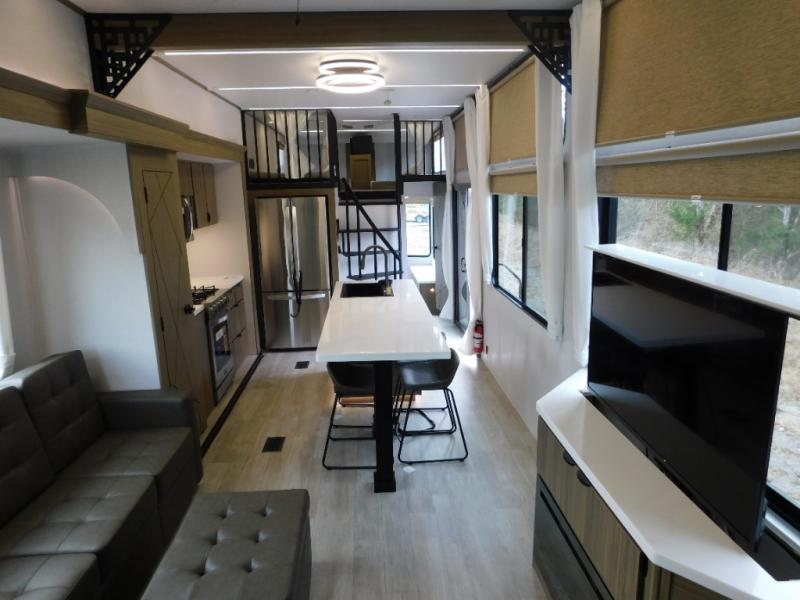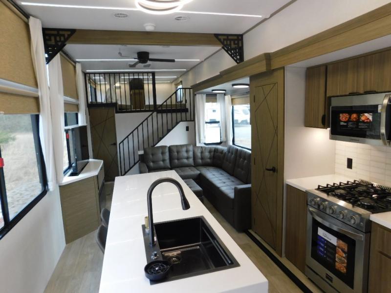You will feel right at home in this destination trailer! It has not only has one loft in the rear with two 42" x 74" bunk mats, but also a second loft in the front with spiral steps leading up to two bunk mats. The front private bedroom features a king bed slide with Versa-Tilt to lay your head on at night with front windows to let in lots of natural lighting and sunshine in the morning. Relax in true comfort at night on the L-shaped sectional sofa across from the entertainment center with a fireplace. The kitchen island provides extra space to prepare delicious meals and comes with four bar stools to enjoy your breakfast each morning. Everyone will stay fresh and clean with a walk-in shower in the rear private bedroom, plus there is washer and dryer prep if you choose to add those appliances. Head outside through either the patio door or the second entry/exit door each day!