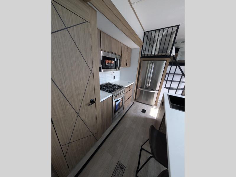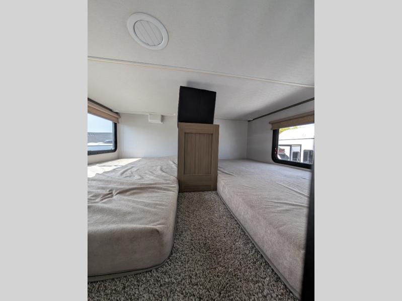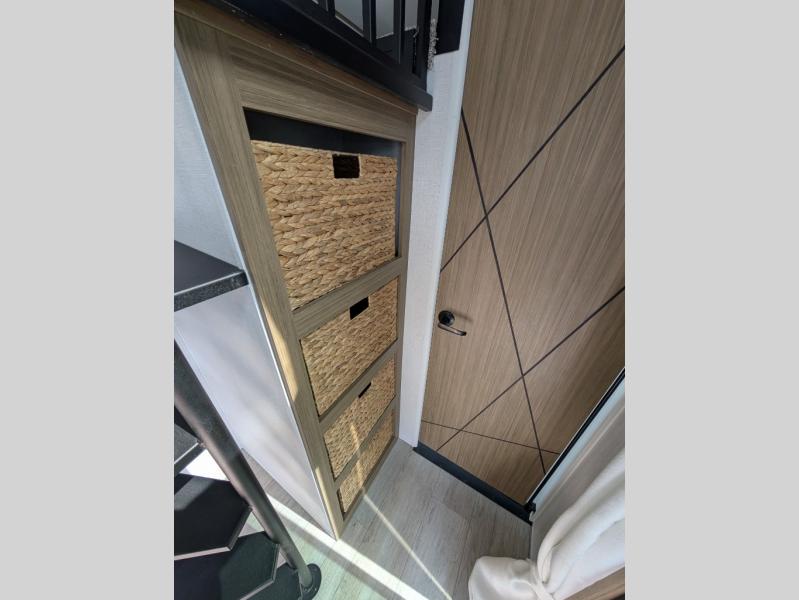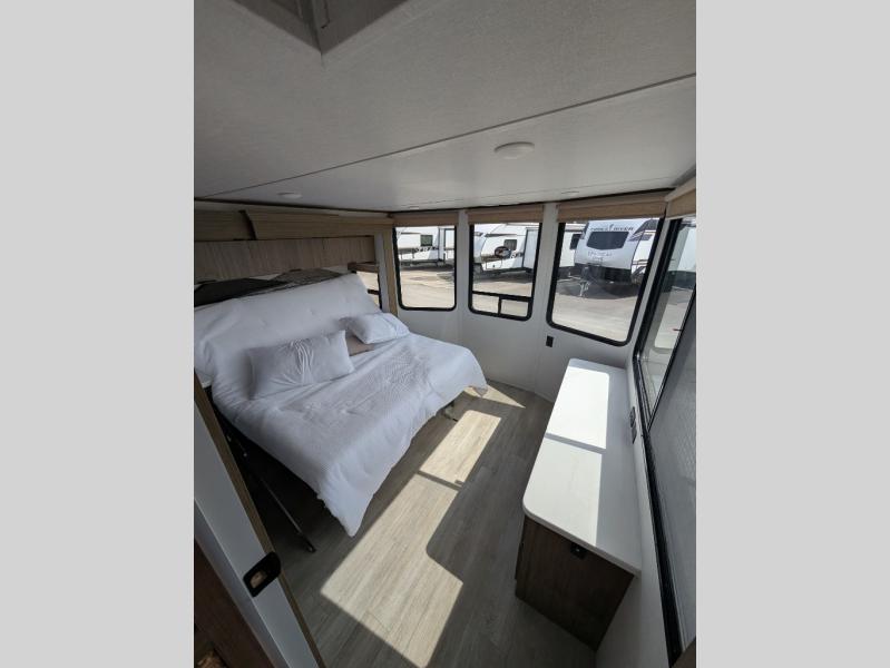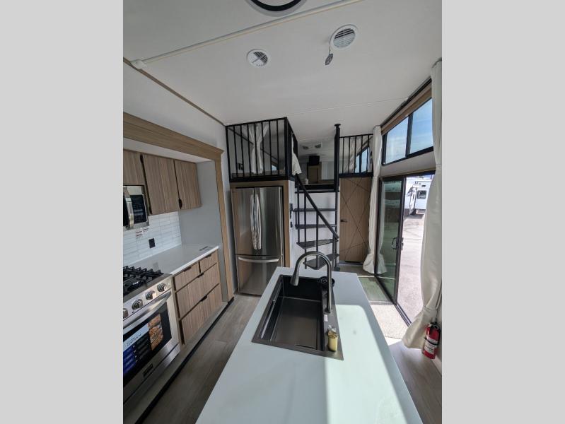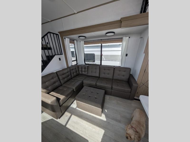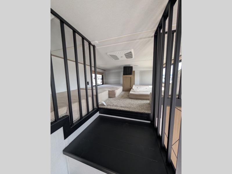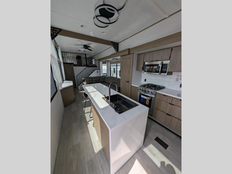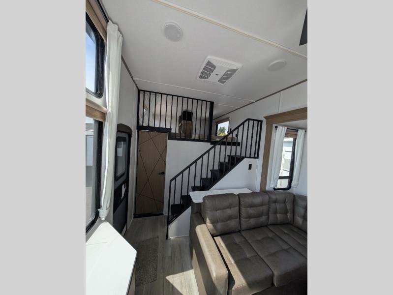 You will feel right at home in this destination trailer! It has not only has one loft in the rear with two 42" x 74" bunk mats, but also a second loft in the front with spiral steps leading up to two bunk mats. The front private bedroom features a king bed slide with Versa-Tilt to lay your head on at night with front windows to let in lots of natural lighting and sunshine in the morning. Relax in true comfort at night on the L-shaped sectional sofa across from the entertainment center with a fireplace. The kitchen island provides extra space to prepare delicious meals and comes with four bar stools to enjoy your breakfast each morning. Everyone will stay fresh and clean with a walk-in shower in the rear private bedroom, plus there is washer and dryer prep if you choose to add those appliances. Head outside through either the patio door or the second entry/exit door each day!