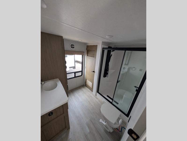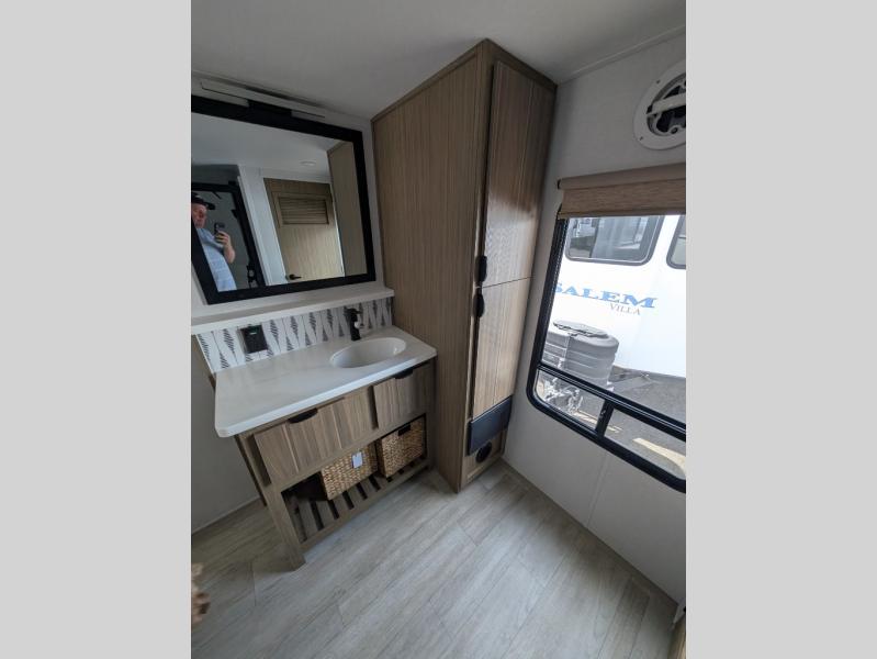 With any Salem Grand Villa destination trailer by Forest River, you can call home wherever you park it! There is a heated and enclosed Accessibelly for added protection in all seasons, LED "Blade Lighting" under the awning, Lippert On-The-Go ladder prep, plus many more exterior conveniences. Elegant curtain rods and curtains will have you feeling right at home, along with stainless steel kitchen appliances, stylish roller shades, and enhanced floating shelves for added storage. Each model includes a central vacuum with a sweep attachment to help keep your space tidy, a 60k on-demand tankless water heater for endless hot showers, a JBL 3-Zone media center, plus available options to further customize your trailer.