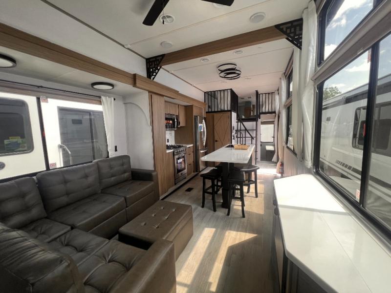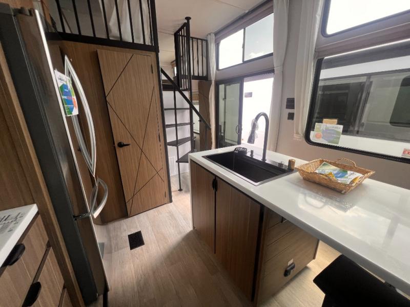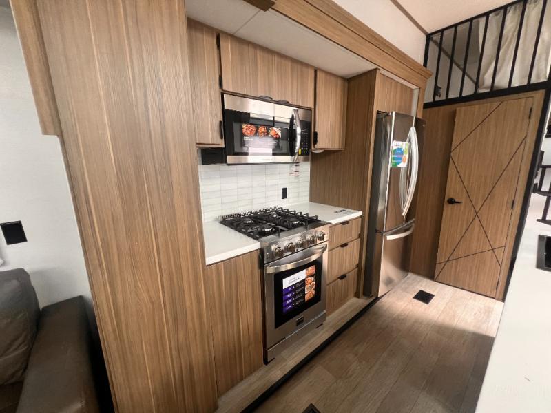 You will feel like you are home when you step inside! Not only will you be impressed with the large slide in the main combined kitchen and living area, but check out the island with four seats! The main entry closest to the front features a step up to a private bedroom featuring a custom king bed with Versa-Tilt within a slide, plus a fireplace, wardrobe, and a dress for your belongings. Just outside this door is a half bath around the corner and a spiral staircase to the front loft with two 42" x 74" bunk mats above. The kitchen is fully equipped for you to provide the best home cooked meals with a roll-out pantry, range and microwave, plus side-by-side refrigerator all part of the large slide that also houses an L-shaped sectional sofa with ottoman so everyone can have a seat! Opposite the sectional find an entertainment center with pop-up TV and fireplace. A second set of stairs leads up to the rear loft featuring a 62" x 74" Versa Queen mattress and a dresser. Back down in the very back of the unit, there is a large bathroom with a walk-in shower, linen cabinet, toilet, and vanity with a sink. There is also a space that has washer/dryer prep to add even more convenience. Outside, a 26' awning for outdoor living, and double entry doors to make it easy to move in and out.
