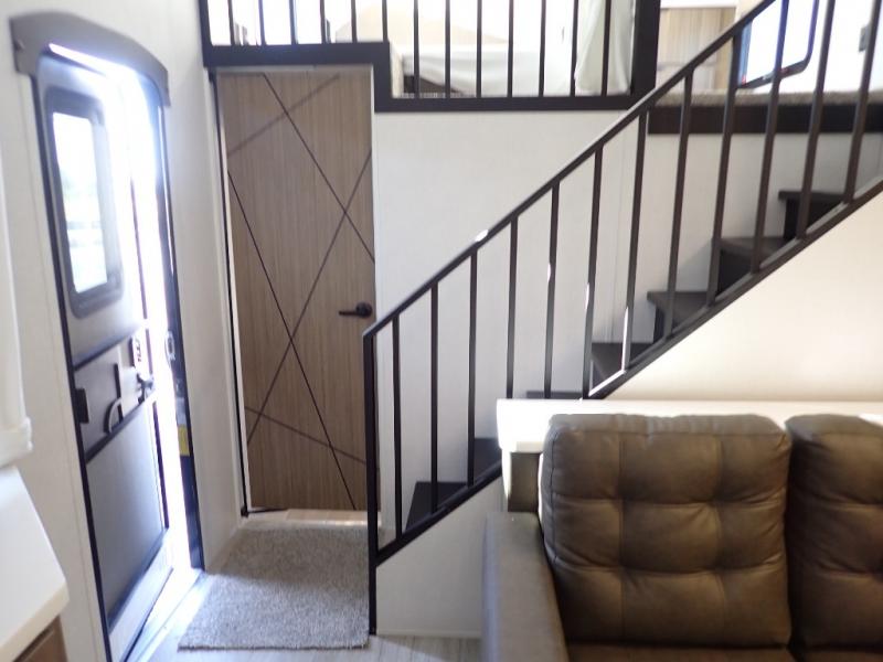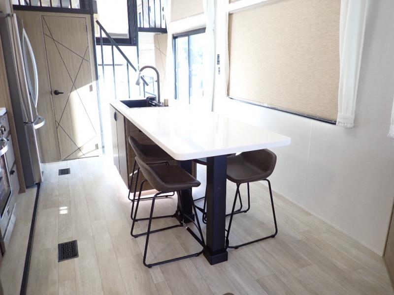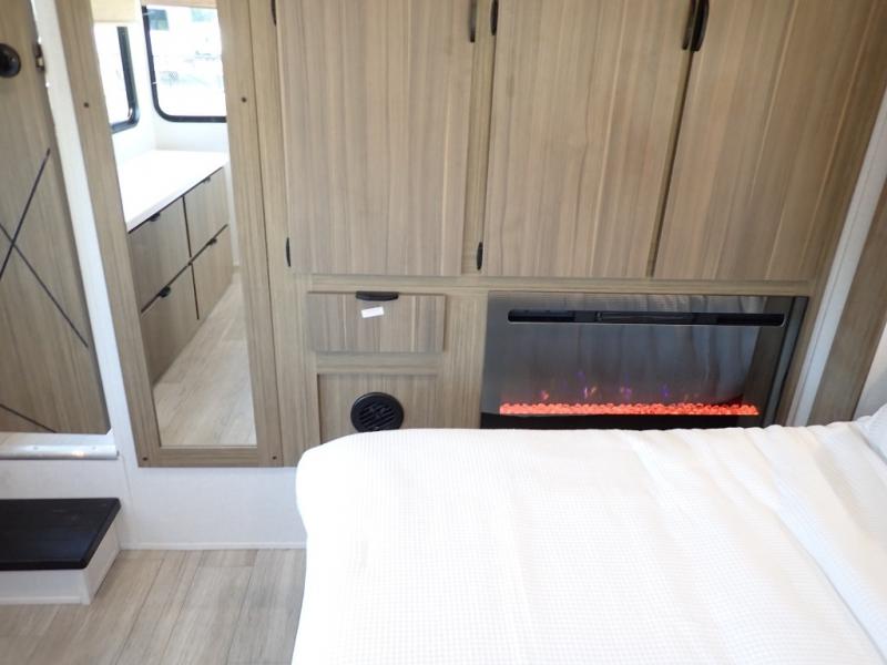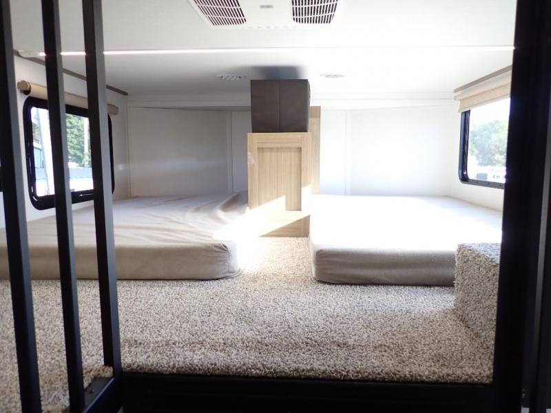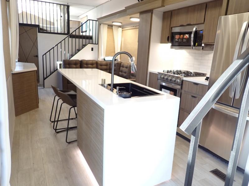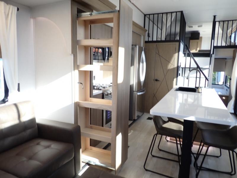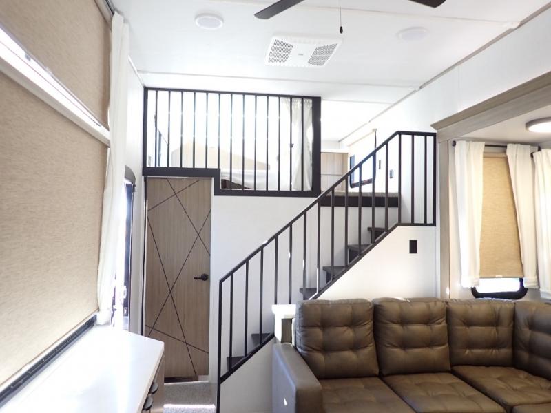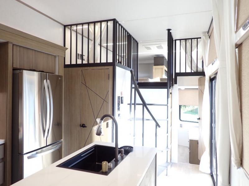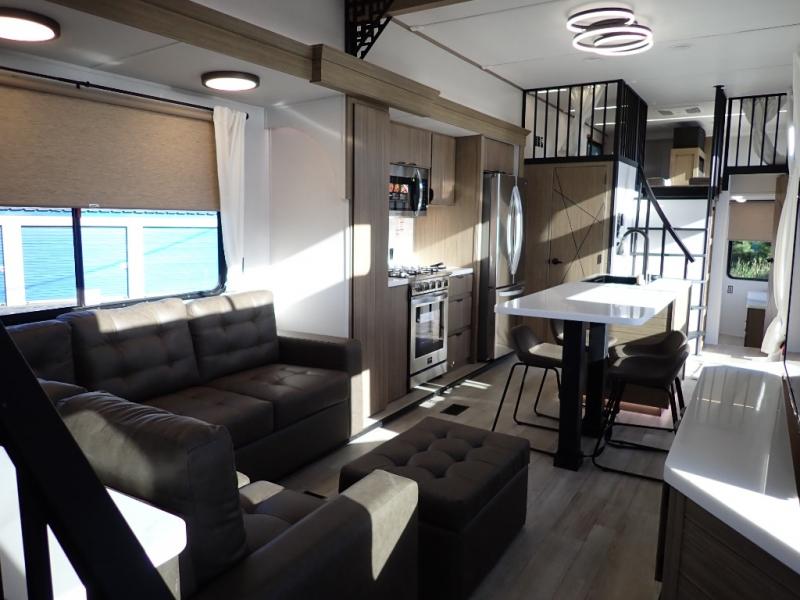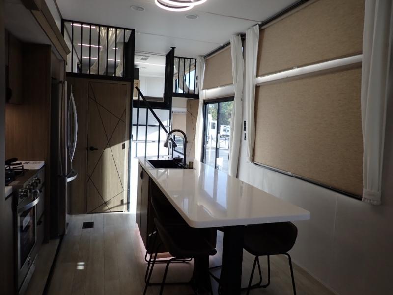 You will feel like you are home when you step inside! Not only will you be impressed with the large slide in the main combined kitchen and living area, but check out the island with four seats! The main entry closest to the front features a step up to a private bedroom featuring a custom king bed with Versa-Tilt within a slide, plus a fireplace, wardrobe, and a dress for your belongings. Just outside this door is a half bath around the corner and a spiral staircase to the front loft with two 42" x 74" bunk mats above. The kitchen is fully equipped for you to provide the best home cooked meals with a roll-out pantry, range and microwave, plus side-by-side refrigerator all part of the large slide that also houses an L-shaped sectional sofa with ottoman so everyone can have a seat! Opposite the sectional find an entertainment center with pop-up TV and fireplace. A second set of stairs leads up to the rear loft featuring a 62" x 74" Versa Queen mattress and a dresser. Back down in the very back of the unit, there is a large bathroom with a walk-in shower, linen cabinet, toilet, and vanity with a sink. There is also a space that has washer/dryer prep to add even more convenience. Outside, a 26' awning for outdoor living, and double entry doors to make it easy to move in and out.