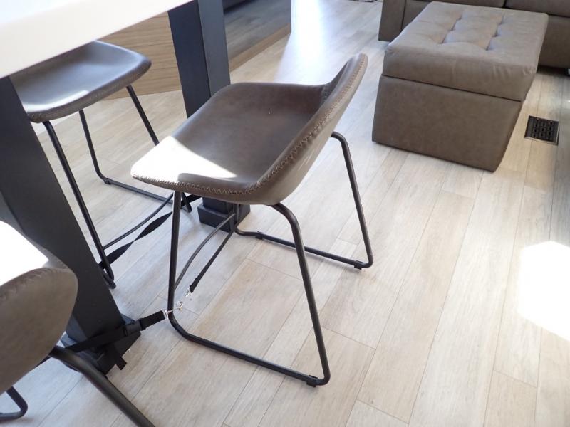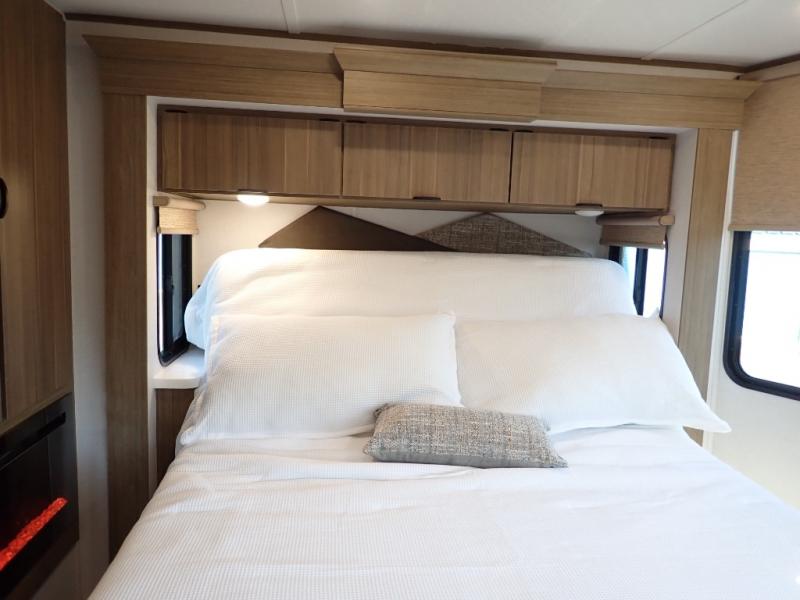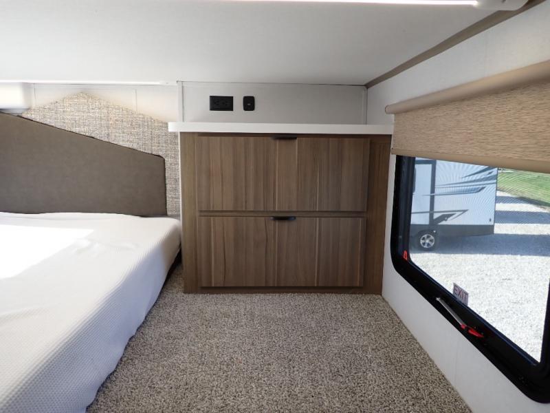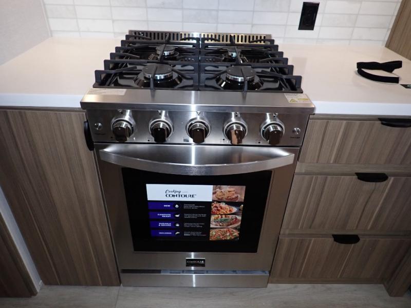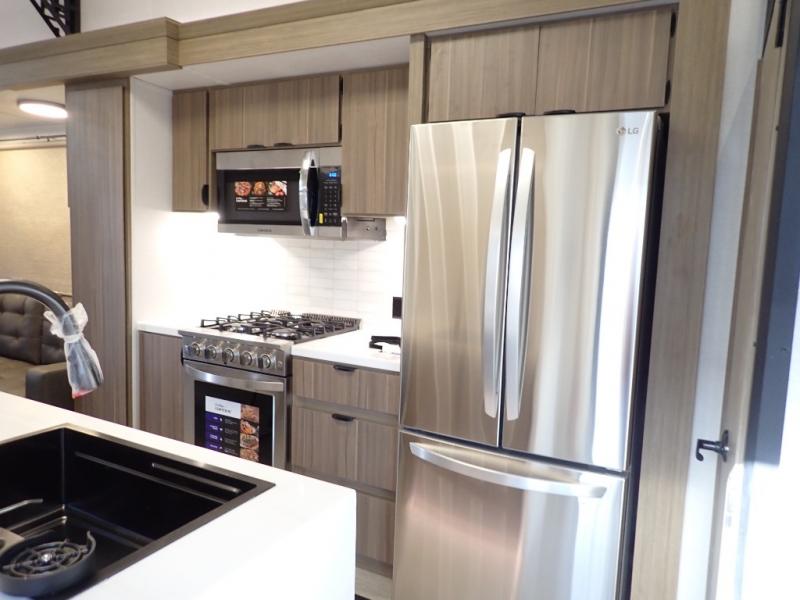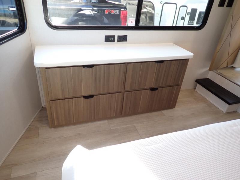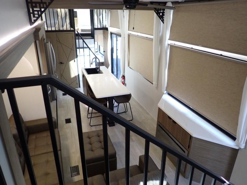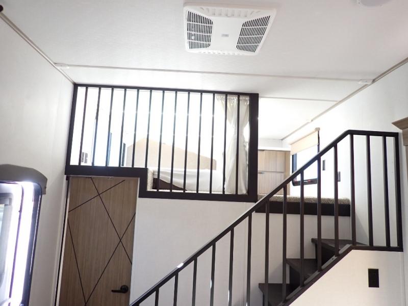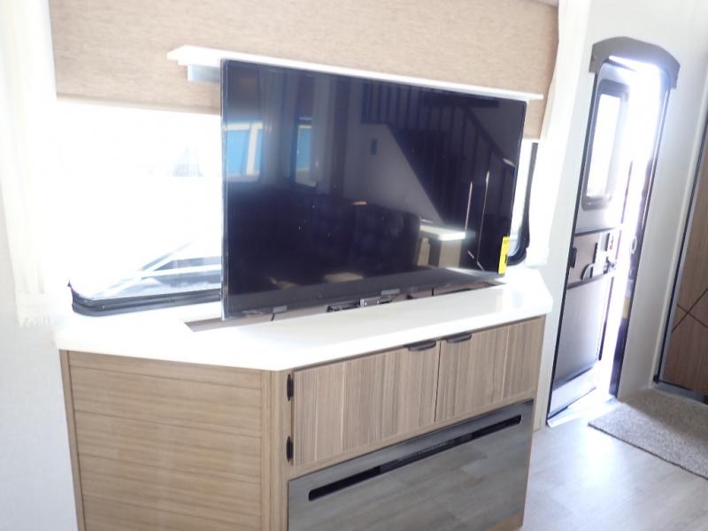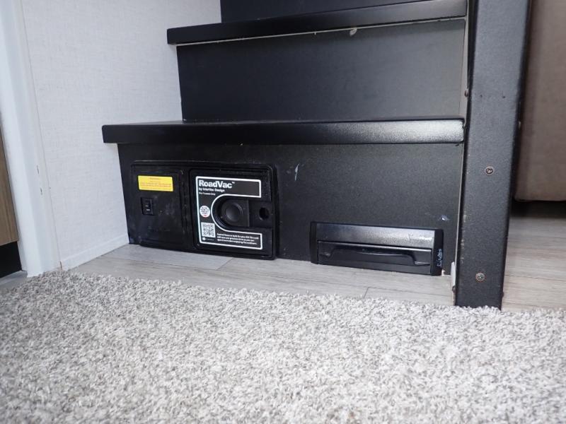 You will feel like you are home when you step inside! Not only will you be impressed with the large slide in the main combined kitchen and living area, but check out the island with four seats! The main entry closest to the front features a step up to a private bedroom featuring a custom king bed with Versa-Tilt within a slide, plus a fireplace, wardrobe, and a dress for your belongings. Just outside this door is a half bath around the corner and a spiral staircase to the front loft with two 42" x 74" bunk mats above. The kitchen is fully equipped for you to provide the best home cooked meals with a roll-out pantry, range and microwave, plus side-by-side refrigerator all part of the large slide that also houses an L-shaped sectional sofa with ottoman so everyone can have a seat! Opposite the sectional find an entertainment center with pop-up TV and fireplace. A second set of stairs leads up to the rear loft featuring a 62" x 74" Versa Queen mattress and a dresser. Back down in the very back of the unit, there is a large bathroom with a walk-in shower, linen cabinet, toilet, and vanity with a sink. There is also a space that has washer/dryer prep to add even more convenience. Outside, a 26' awning for outdoor living, and double entry doors to make it easy to move in and out.