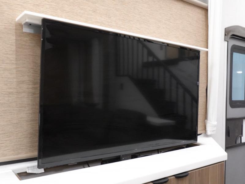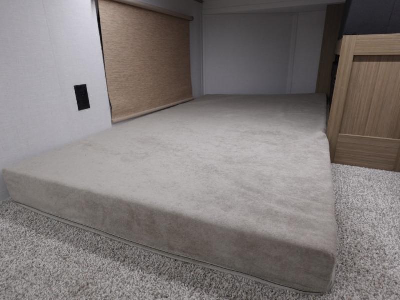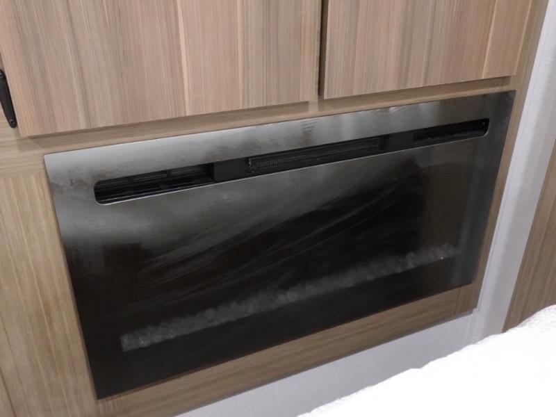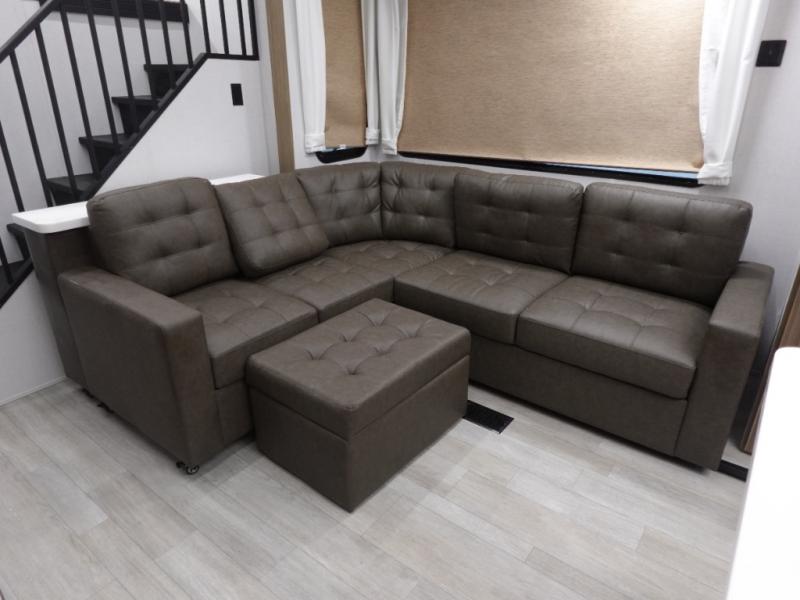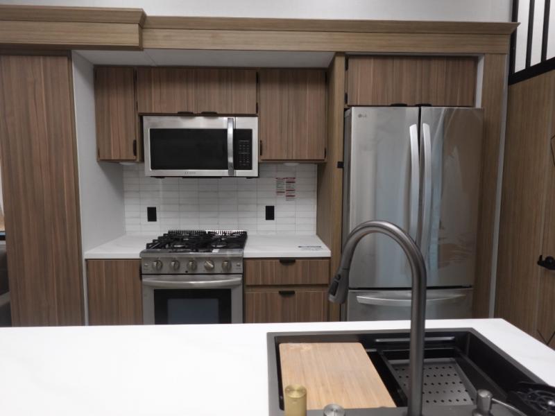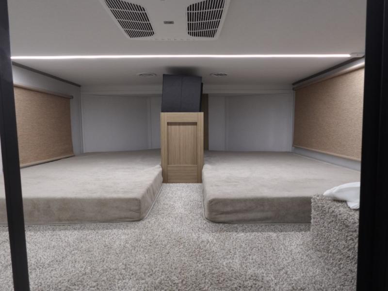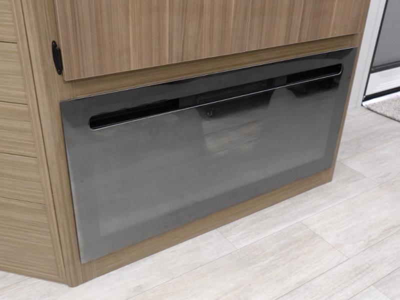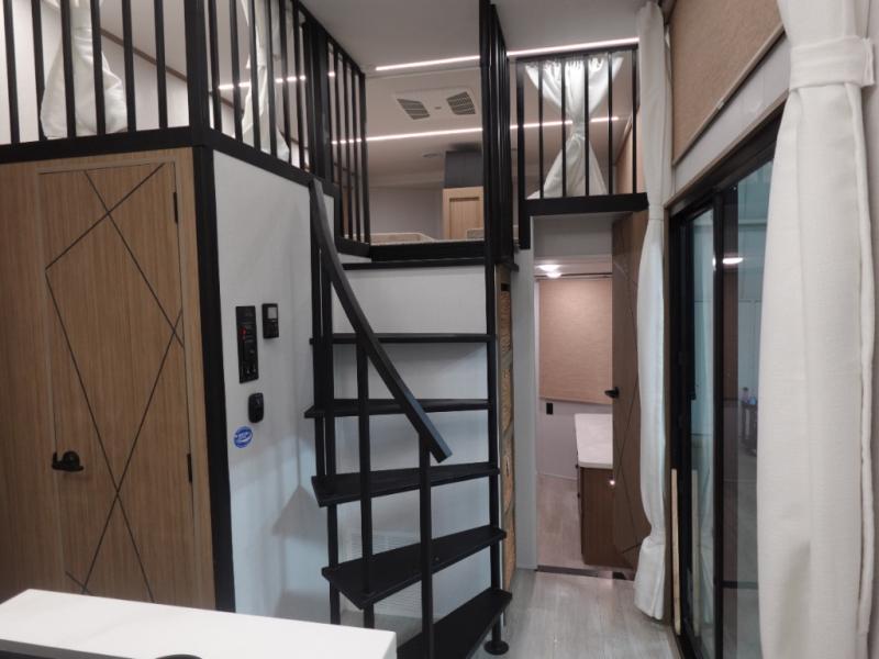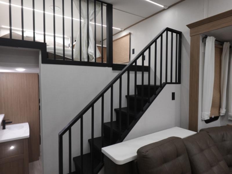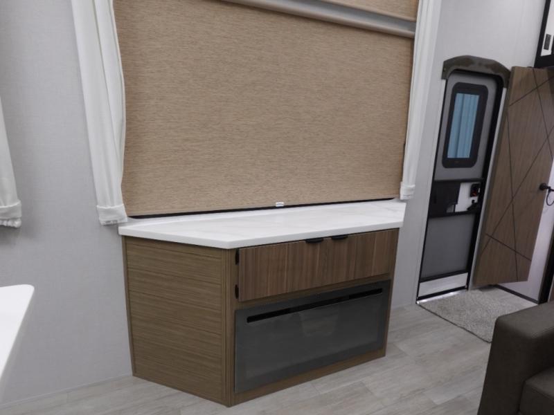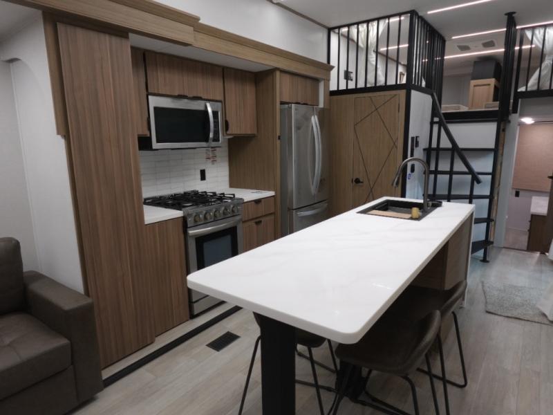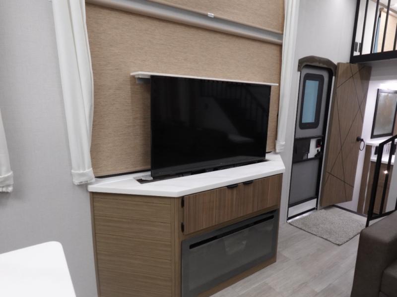 You will feel like you are home when you step inside! Not only will you be impressed with the large slide in the main combined kitchen and living area, but check out the island with four seats! The main entry closest to the front features a step up to a private bedroom featuring a custom king bed with Versa-Tilt within a slide, plus a fireplace, wardrobe, and a dress for your belongings. Just outside this door is a half bath around the corner and a spiral staircase to the front loft with two 42" x 74" bunk mats above. The kitchen is fully equipped for you to provide the best home cooked meals with a roll-out pantry, range and microwave, plus side-by-side refrigerator all part of the large slide that also houses an L-shaped sectional sofa with ottoman so everyone can have a seat! Opposite the sectional find an entertainment center with pop-up TV and fireplace. A second set of stairs leads up to the rear loft featuring a 62" x 74" Versa Queen mattress and a dresser. Back down in the very back of the unit, there is a large bathroom with a walk-in shower, linen cabinet, toilet, and vanity with a sink. There is also a space that has washer/dryer prep to add even more convenience. Outside, a 26' awning for outdoor living, and double entry doors to make it easy to move in and out.