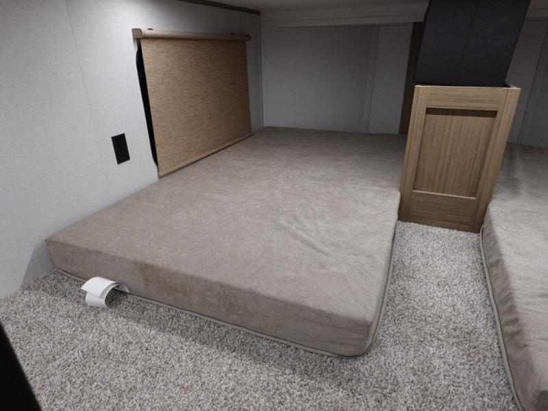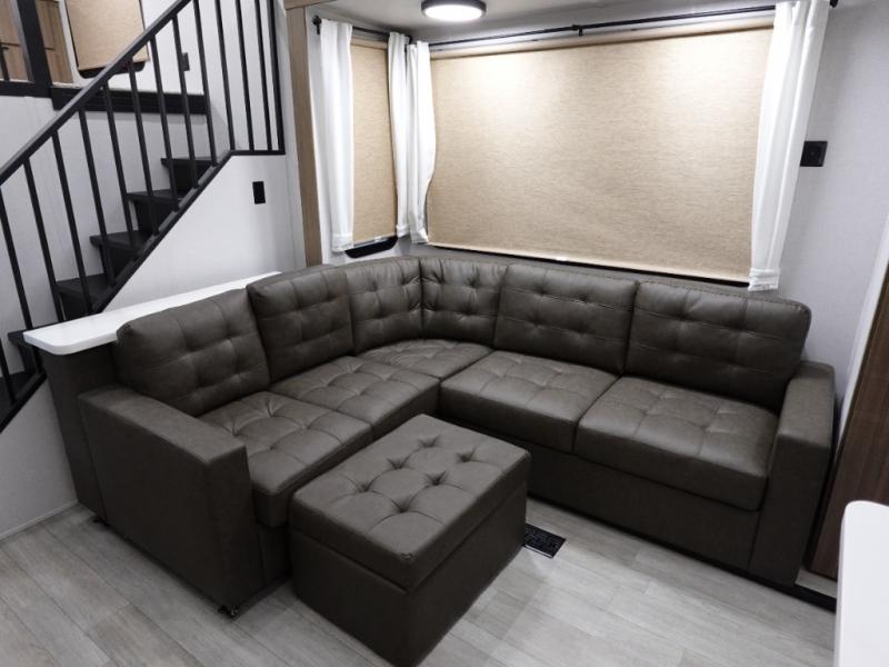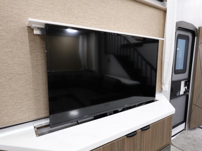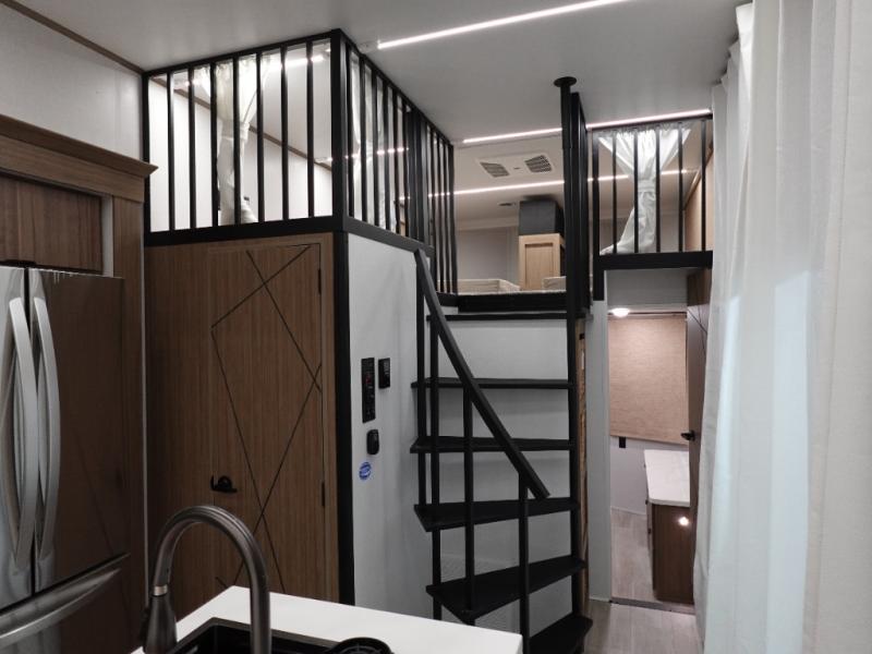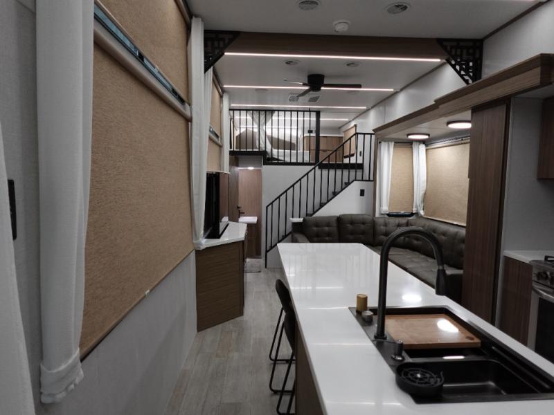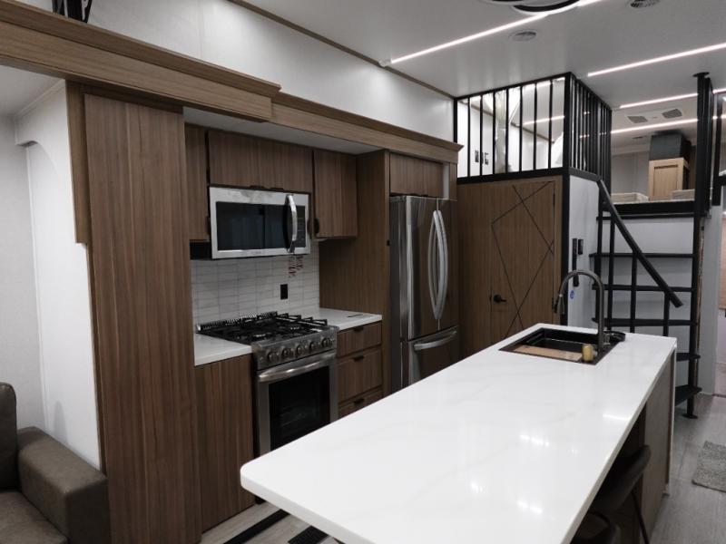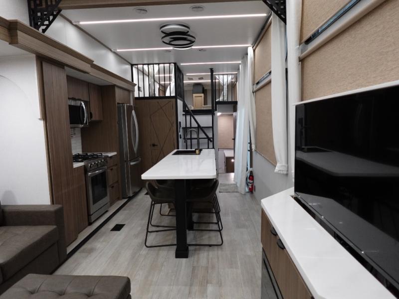 You will feel like you are home when you step inside! Not only will you be impressed with the super large slide in the main combined kitchen and living area, but check out the island with five counter height seats! The main entry closest to the front features a step up to a private bedroom featuring a custom king bed with Versa-Tilt within a slide, plus a fireplace, wardrobe, and drawers for your belongings. Just outside this door, a half bath around the corner and a spiral staircase to the front loft with two 42" x 74" bunk mats above. The kitchen is fully equipped for you to provide the best home cooked meals with a roll-out pantry, range and microwave, plus side-by-side refrigerator all part of the large slide that also houses an L-shaped sectional sofa with ottoman so everyone can have a seat! Opposite the sectional find an entertainment center with pop-up TV and fireplace. A second set of stairs leads up to the rear loft featuring a 62" x 74" Versa Queen mattress and dresser. Back down in the very back of the unit a large bathroom with walk-in shower, linen cabinet, toilet, and vanity with sink. There is also a space that has washer/dryer prep to add even more convenience. Outside, a 26' awning for outdoor living, and double entry doors to make it easy to move in and out.