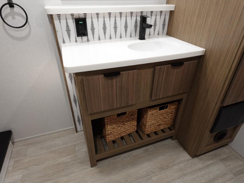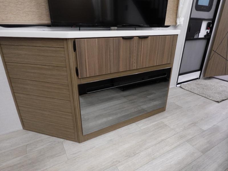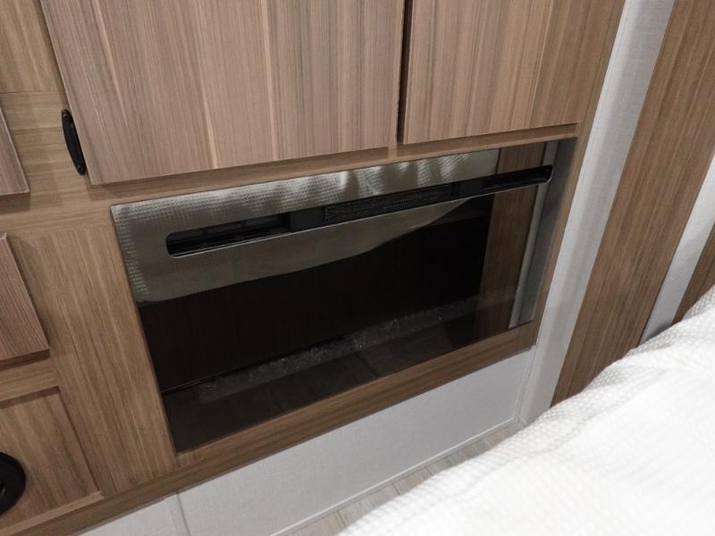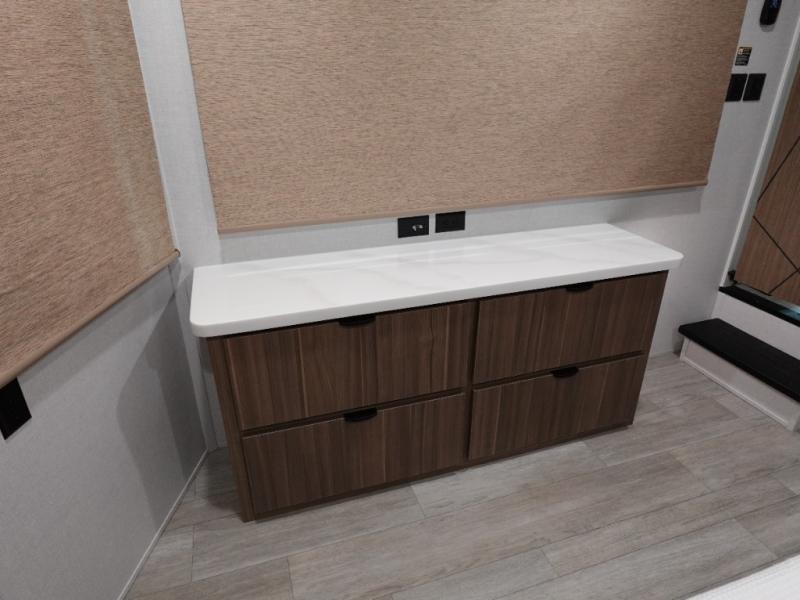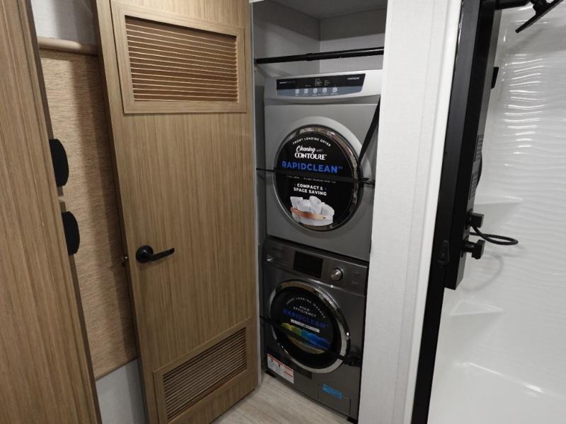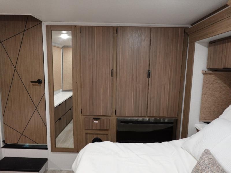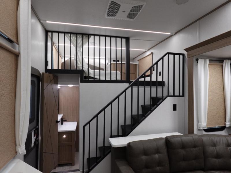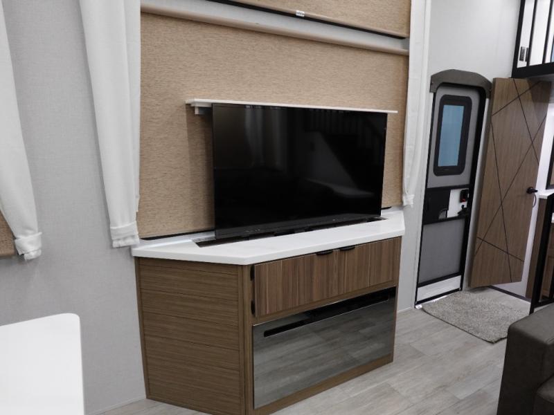 You will feel like you are home when you step inside! Not only will you be impressed with the super large slide in the main combined kitchen and living area, but check out the island with five counter height seats! The main entry closest to the front features a step up to a private bedroom featuring a custom king bed with Versa-Tilt within a slide, plus a fireplace, wardrobe, and drawers for your belongings. Just outside this door, a half bath around the corner and a spiral staircase to the front loft with two 42" x 74" bunk mats above. The kitchen is fully equipped for you to provide the best home cooked meals with a roll-out pantry, range and microwave, plus side-by-side refrigerator all part of the large slide that also houses an L-shaped sectional sofa with ottoman so everyone can have a seat! Opposite the sectional find an entertainment center with pop-up TV and fireplace. A second set of stairs leads up to the rear loft featuring a 62" x 74" Versa Queen mattress and dresser. Back down in the very back of the unit a large bathroom with walk-in shower, linen cabinet, toilet, and vanity with sink. There is also a space that has washer/dryer prep to add even more convenience. Outside, a 26' awning for outdoor living, and double entry doors to make it easy to move in and out.