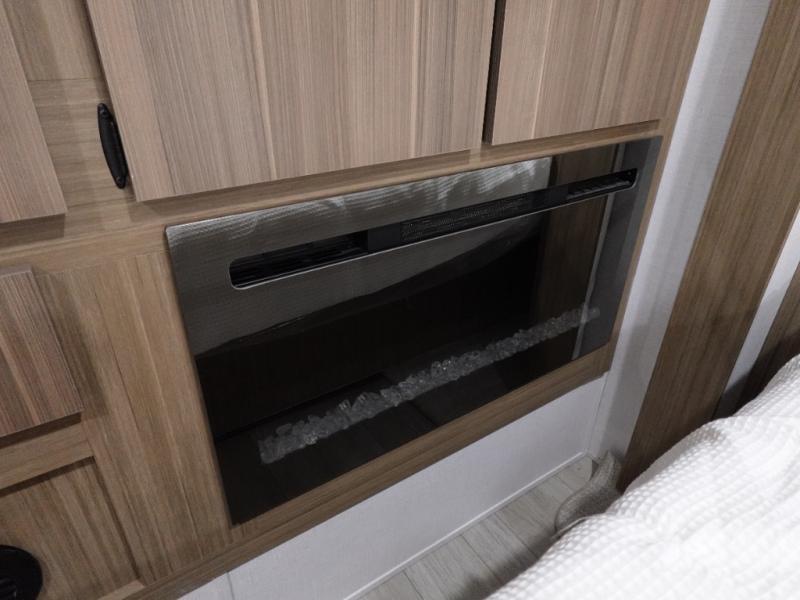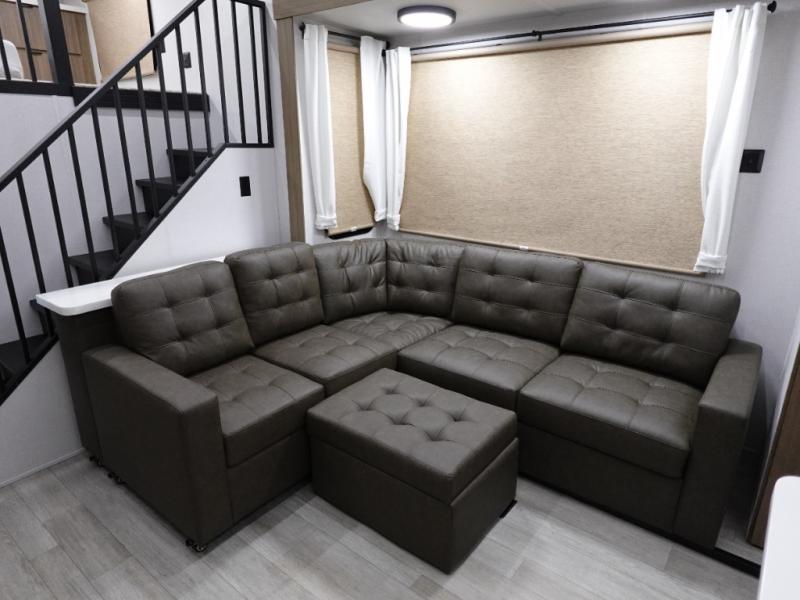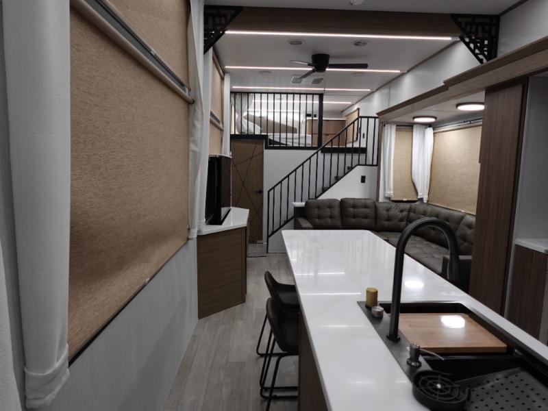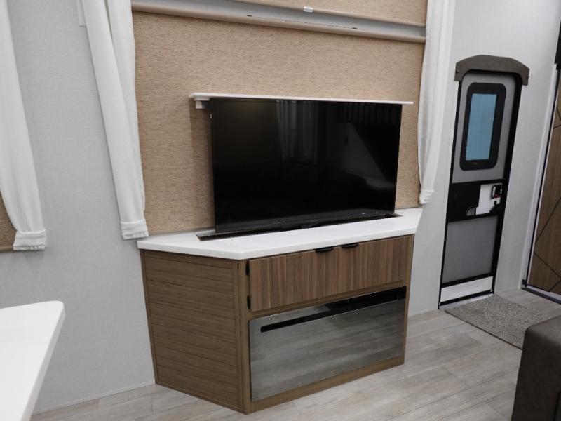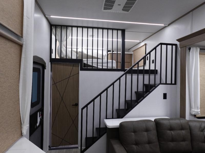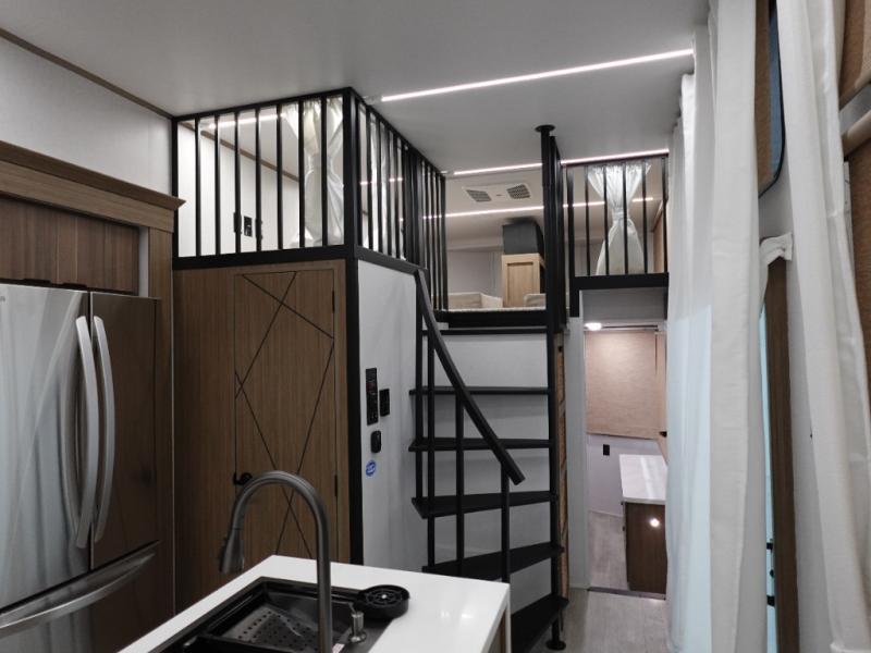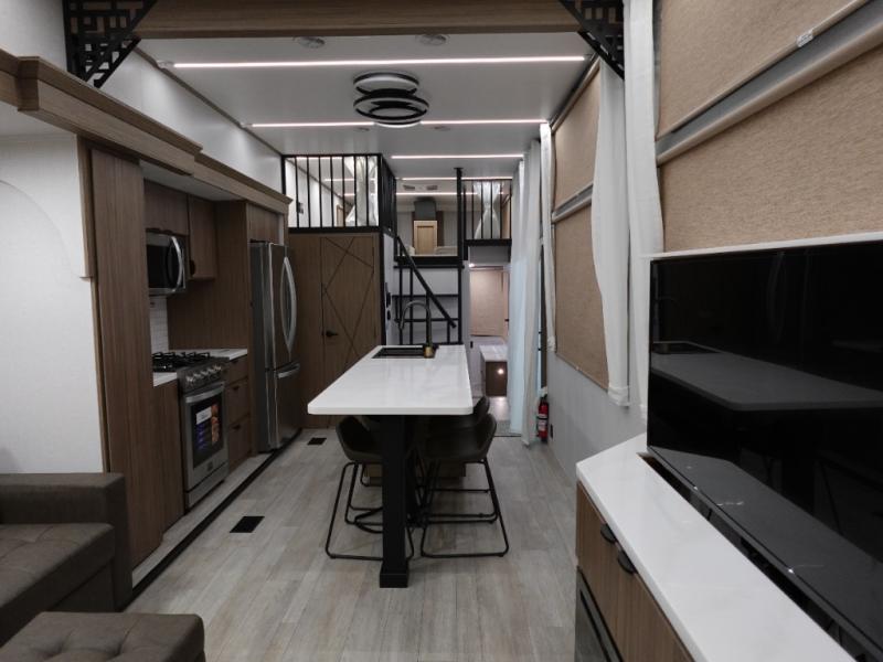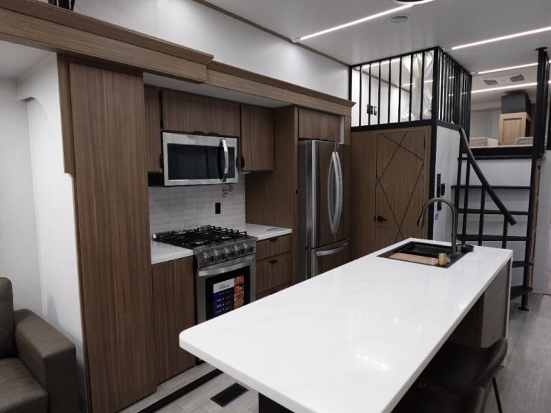 You will feel like you are home when you step inside! Not only will you be impressed with the large slide in the main combined kitchen and living area, but check out the island with four seats! The main entry closest to the front features a step up to a private bedroom featuring a custom king bed with Versa-Tilt within a slide, plus a fireplace, wardrobe, and a dress for your belongings. Just outside this door is a half bath around the corner and a spiral staircase to the front loft with two 42" x 74" bunk mats above. The kitchen is fully equipped for you to provide the best home cooked meals with a roll-out pantry, range and microwave, plus side-by-side refrigerator all part of the large slide that also houses an L-shaped sectional sofa with ottoman so everyone can have a seat! Opposite the sectional find an entertainment center with pop-up TV and fireplace. A second set of stairs leads up to the rear loft featuring a 62" x 74" Versa Queen mattress and a dresser. Back down in the very back of the unit, there is a large bathroom with a walk-in shower, linen cabinet, toilet, and vanity with a sink. There is also a space that has washer/dryer prep to add even more convenience. Outside, a 26' awning for outdoor living, and double entry doors to make it easy to move in and out.