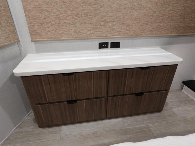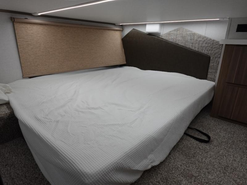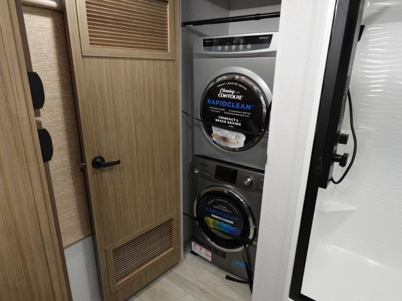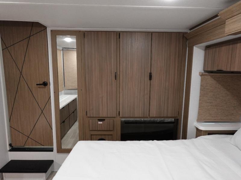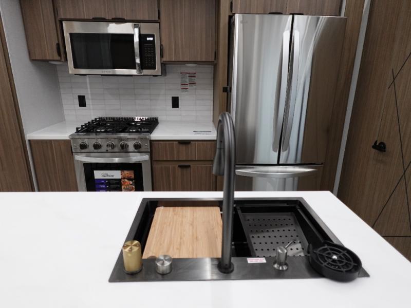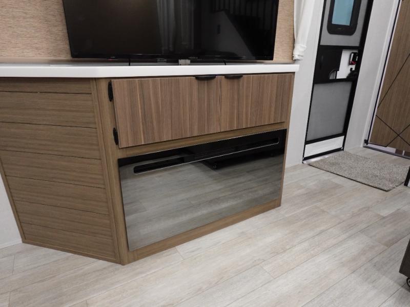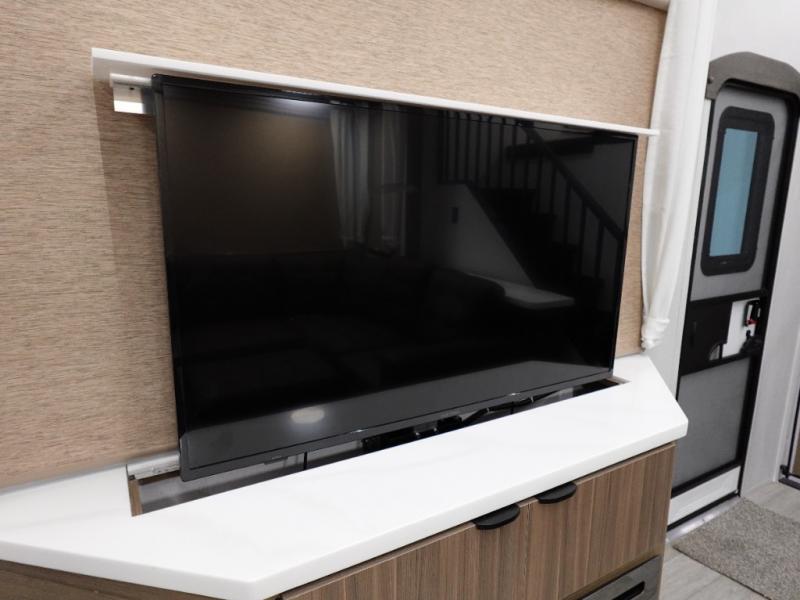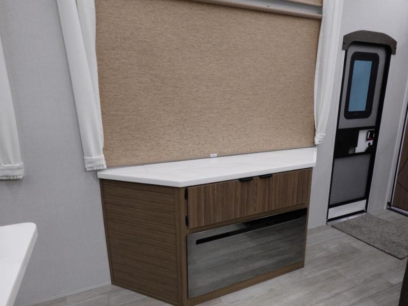You will feel like you are home when you step inside! Not only will you be impressed with the large slide in the main combined kitchen and living area, but check out the island with four seats! The main entry closest to the front features a step up to a private bedroom featuring a custom king bed with Versa-Tilt within a slide, plus a fireplace, wardrobe, and a dress for your belongings. Just outside this door is a half bath around the corner and a spiral staircase to the front loft with two 42" x 74" bunk mats above. The kitchen is fully equipped for you to provide the best home cooked meals with a roll-out pantry, range and microwave, plus side-by-side refrigerator all part of the large slide that also houses an L-shaped sectional sofa with ottoman so everyone can have a seat! Opposite the sectional find an entertainment center with pop-up TV and fireplace. A second set of stairs leads up to the rear loft featuring a 62" x 74" Versa Queen mattress and a dresser. Back down in the very back of the unit, there is a large bathroom with a walk-in shower, linen cabinet, toilet, and vanity with a sink. There is also a space that has washer/dryer prep to add even more convenience. Outside, a 26' awning for outdoor living, and double entry doors to make it easy to move in and out.