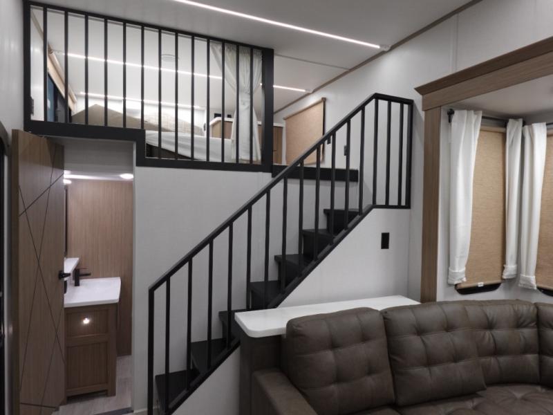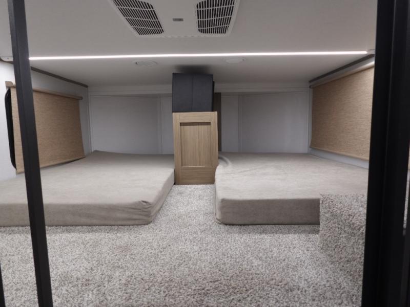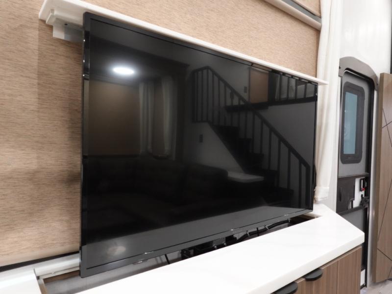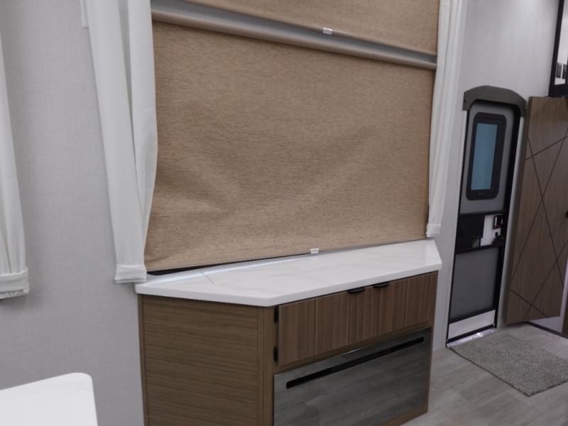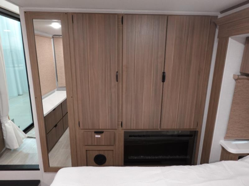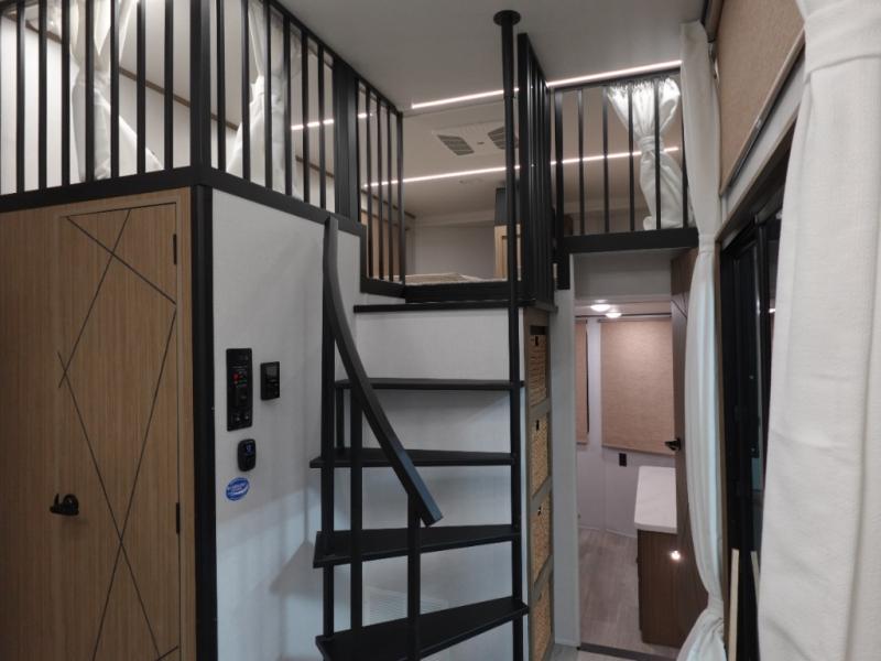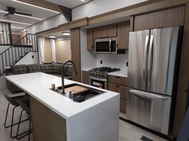 You will feel like you are home when you step inside! Not only will you be impressed with the large slide in the main combined kitchen and living area, but check out the island with four seats! The main entry closest to the front features a step up to a private bedroom featuring a custom king bed with Versa-Tilt within a slide, plus a fireplace, wardrobe, and a dress for your belongings. Just outside this door is a half bath around the corner and a spiral staircase to the front loft with two 42" x 74" bunk mats above. The kitchen is fully equipped for you to provide the best home cooked meals with a roll-out pantry, range and microwave, plus side-by-side refrigerator all part of the large slide that also houses an L-shaped sectional sofa with ottoman so everyone can have a seat! Opposite the sectional find an entertainment center with pop-up TV and fireplace. A second set of stairs leads up to the rear loft featuring a 62" x 74" Versa Queen mattress and a dresser. Back down in the very back of the unit, there is a large bathroom with a walk-in shower, linen cabinet, toilet, and vanity with a sink. There is also a space that has washer/dryer prep to add even more convenience. Outside, a 26' awning for outdoor living, and double entry doors to make it easy to move in and out.