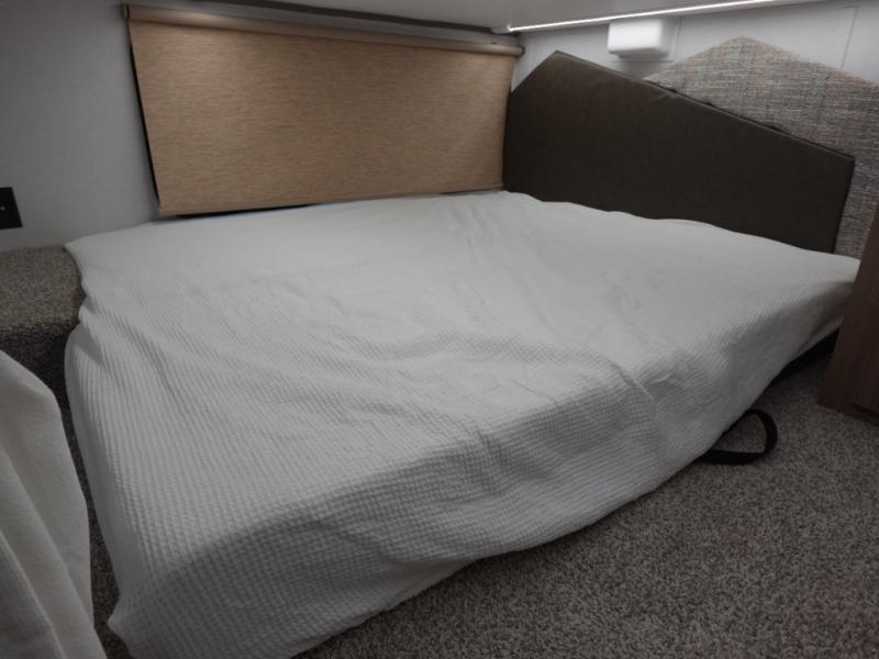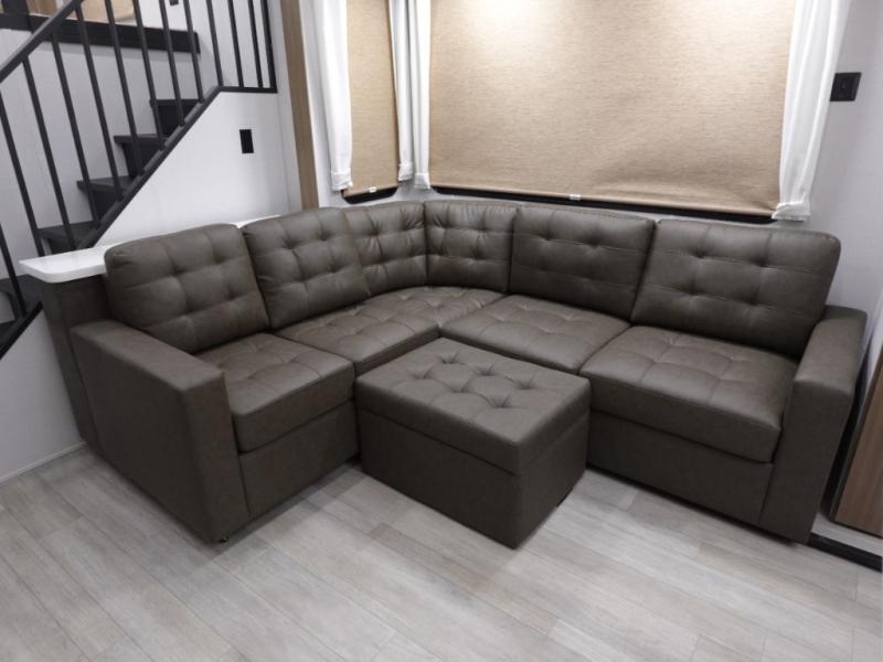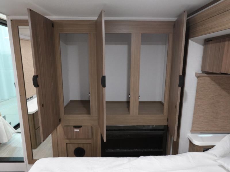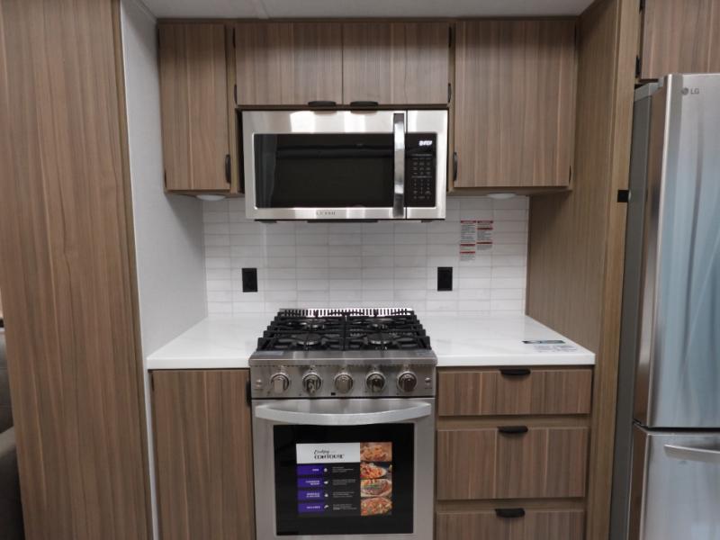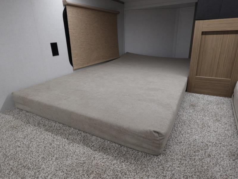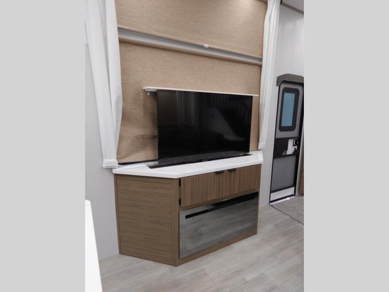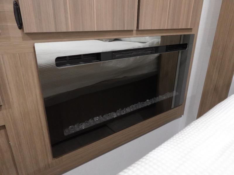 You will feel like you are home when you step inside! Not only will you be impressed with the large slide in the main combined kitchen and living area, but check out the island with four seats! The main entry closest to the front features a step up to a private bedroom featuring a custom king bed with Versa-Tilt within a slide, plus a fireplace, wardrobe, and a dress for your belongings. Just outside this door is a half bath around the corner and a spiral staircase to the front loft with two 42" x 74" bunk mats above. The kitchen is fully equipped for you to provide the best home cooked meals with a roll-out pantry, range and microwave, plus side-by-side refrigerator all part of the large slide that also houses an L-shaped sectional sofa with ottoman so everyone can have a seat! Opposite the sectional find an entertainment center with pop-up TV and fireplace. A second set of stairs leads up to the rear loft featuring a 62" x 74" Versa Queen mattress and a dresser. Back down in the very back of the unit, there is a large bathroom with a walk-in shower, linen cabinet, toilet, and vanity with a sink. There is also a space that has washer/dryer prep to add even more convenience. Outside, a 26' awning for outdoor living, and double entry doors to make it easy to move in and out.