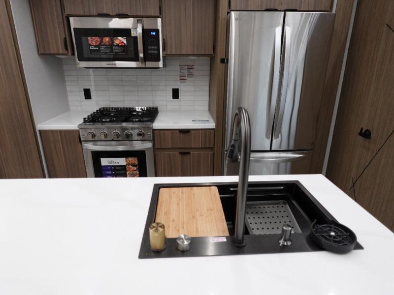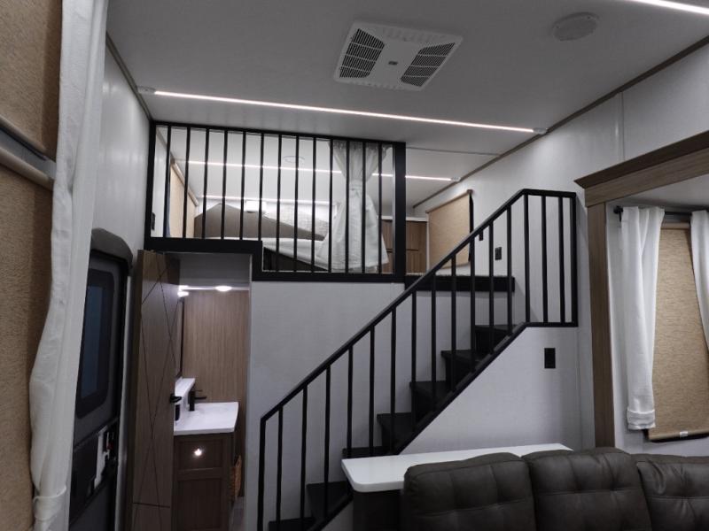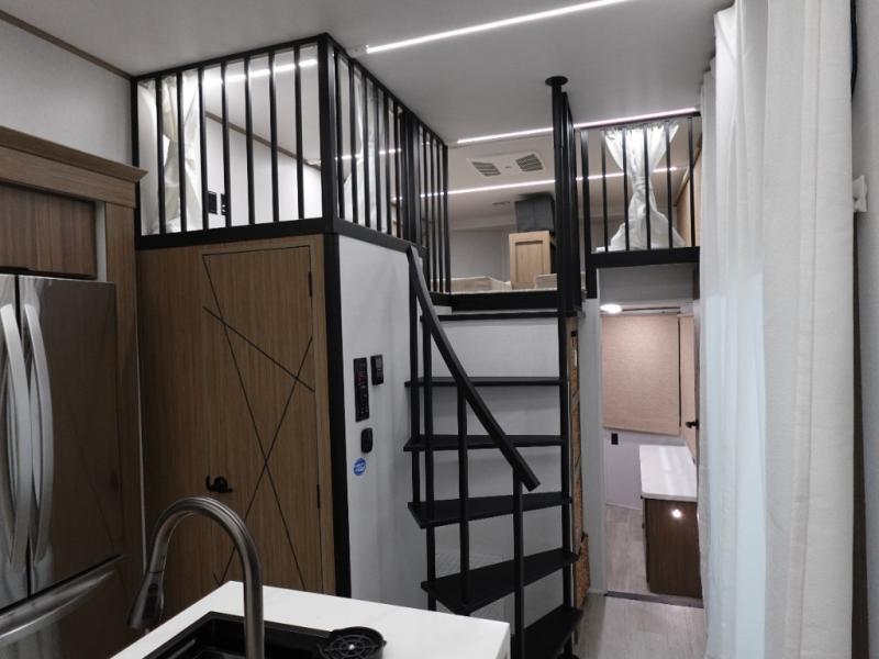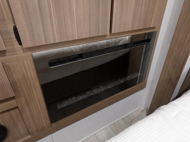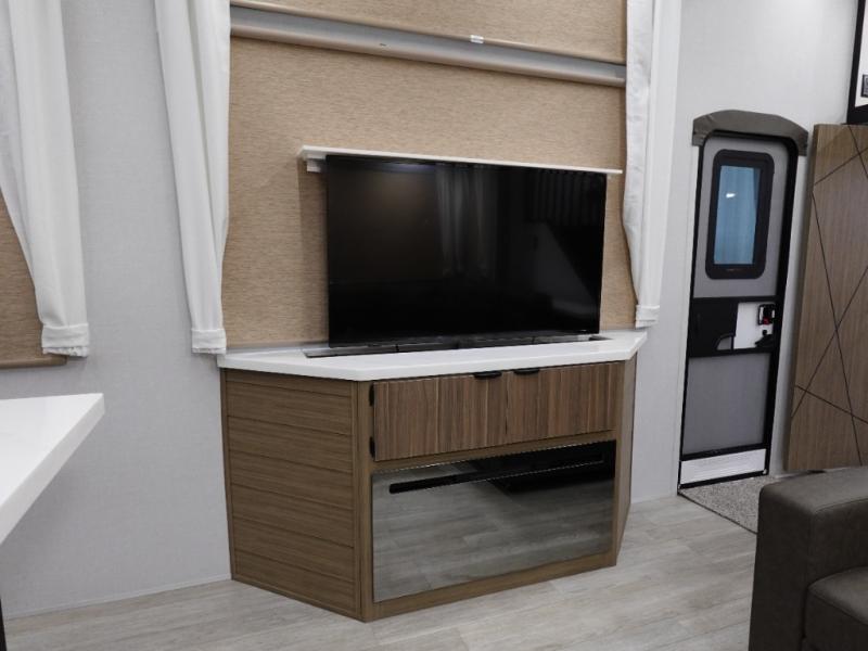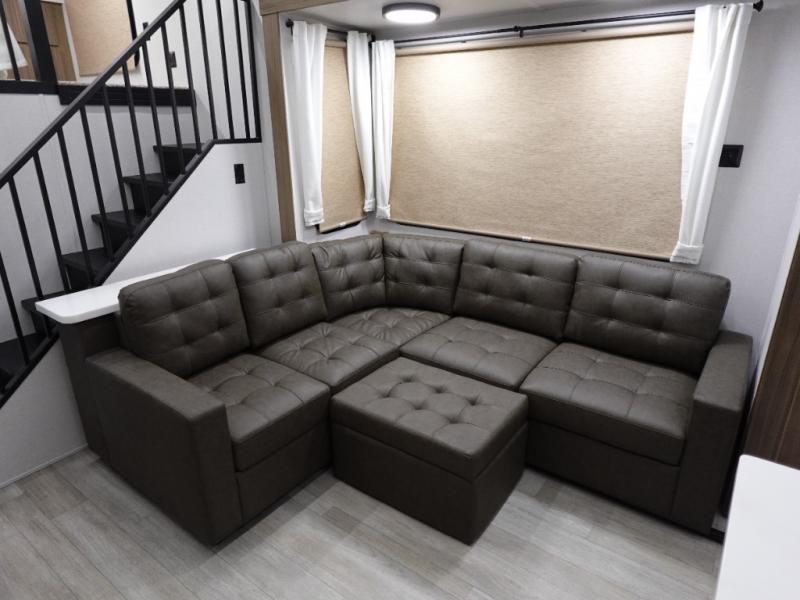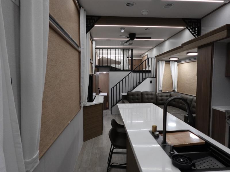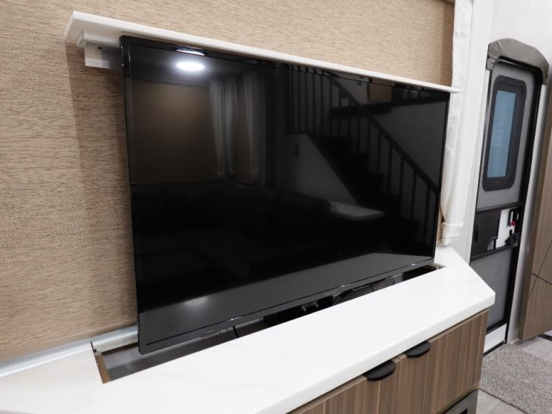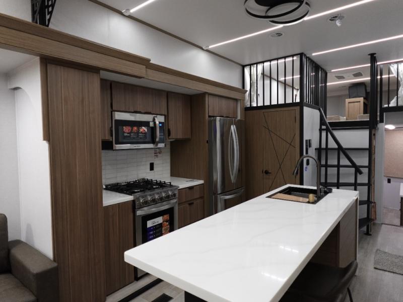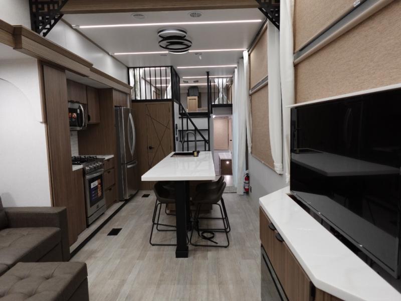 You will feel like you are home when you step inside! Not only will you be impressed with the super large slide in the main combined kitchen and living area, but check out the island with five counter height seats! The main entry closest to the front features a step up to a private bedroom featuring a custom king bed with Versa-Tilt within a slide, plus a fireplace, wardrobe, and drawers for your belongings. Just outside this door, a half bath around the corner and a spiral staircase to the front loft with two 42" x 74" bunk mats above. The kitchen is fully equipped for you to provide the best home cooked meals with a roll-out pantry, range and microwave, plus side-by-side refrigerator all part of the large slide that also houses an L-shaped sectional sofa with ottoman so everyone can have a seat! Opposite the sectional find an entertainment center with pop-up TV and fireplace. A second set of stairs leads up to the rear loft featuring a 62" x 74" Versa Queen mattress and dresser. Back down in the very back of the unit a large bathroom with walk-in shower, linen cabinet, toilet, and vanity with sink. There is also a space that has washer/dryer prep to add even more convenience. Outside, a 26' awning for outdoor living, and double entry doors to make it easy to move in and out.