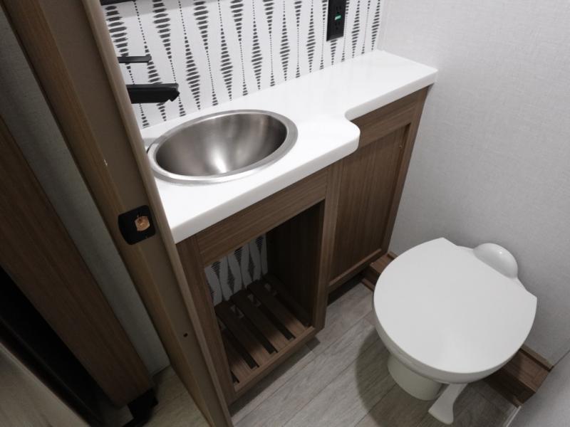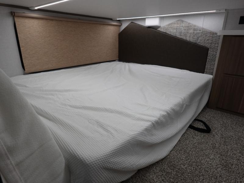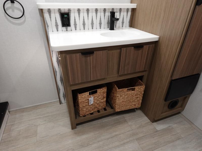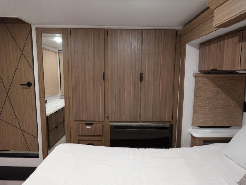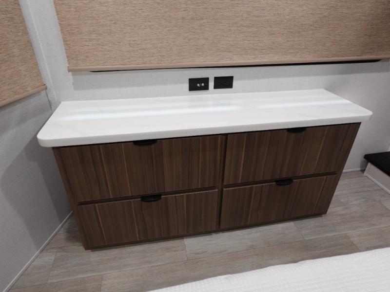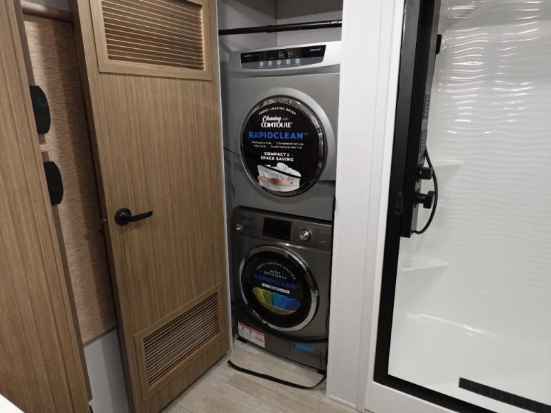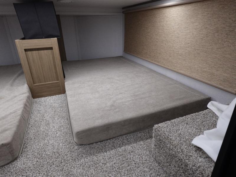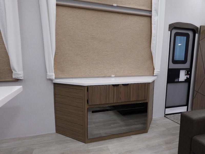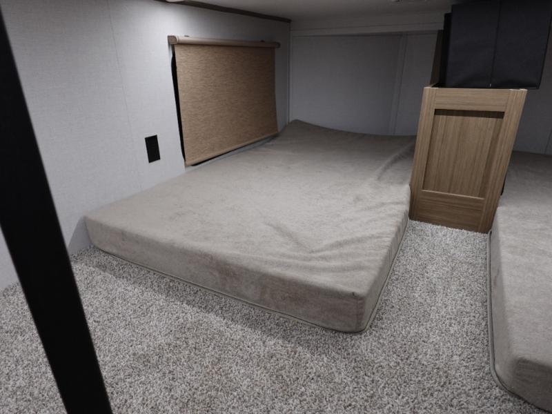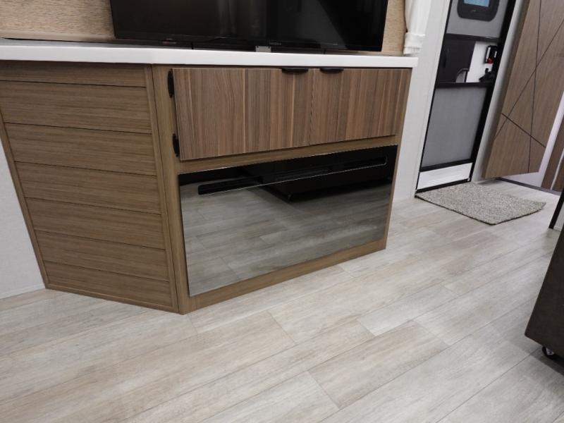 You will feel like you are home when you step inside! Not only will you be impressed with the super large slide in the main combined kitchen and living area, but check out the island with five counter height seats! The main entry closest to the front features a step up to a private bedroom featuring a custom king bed with Versa-Tilt within a slide, plus a fireplace, wardrobe, and drawers for your belongings. Just outside this door, a half bath around the corner and a spiral staircase to the front loft with two 42" x 74" bunk mats above. The kitchen is fully equipped for you to provide the best home cooked meals with a roll-out pantry, range and microwave, plus side-by-side refrigerator all part of the large slide that also houses an L-shaped sectional sofa with ottoman so everyone can have a seat! Opposite the sectional find an entertainment center with pop-up TV and fireplace. A second set of stairs leads up to the rear loft featuring a 62" x 74" Versa Queen mattress and dresser. Back down in the very back of the unit a large bathroom with walk-in shower, linen cabinet, toilet, and vanity with sink. There is also a space that has washer/dryer prep to add even more convenience. Outside, a 26' awning for outdoor living, and double entry doors to make it easy to move in and out.
