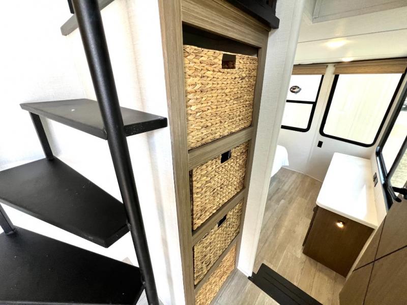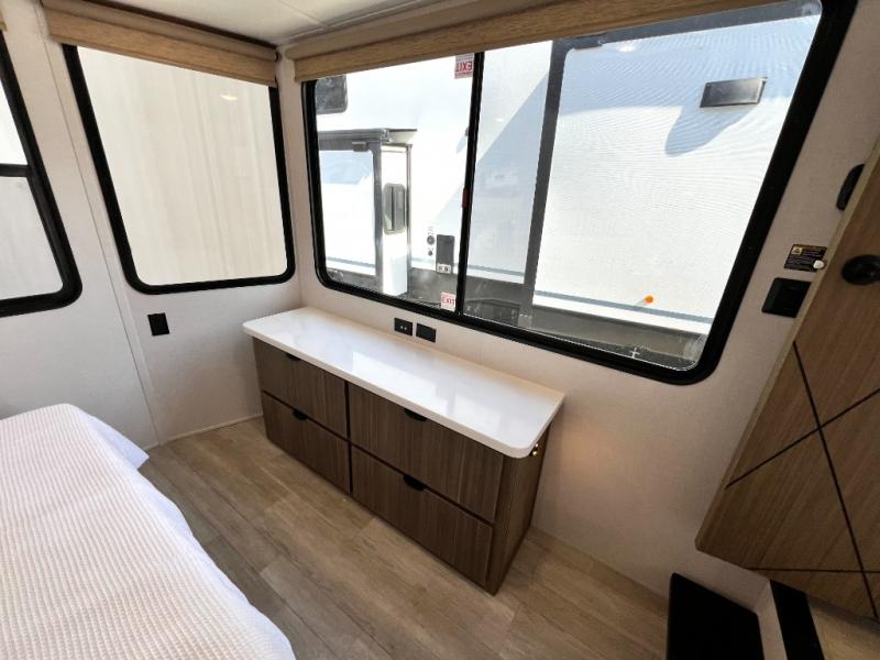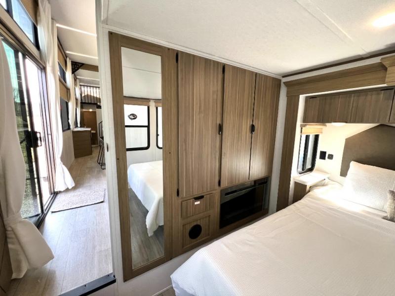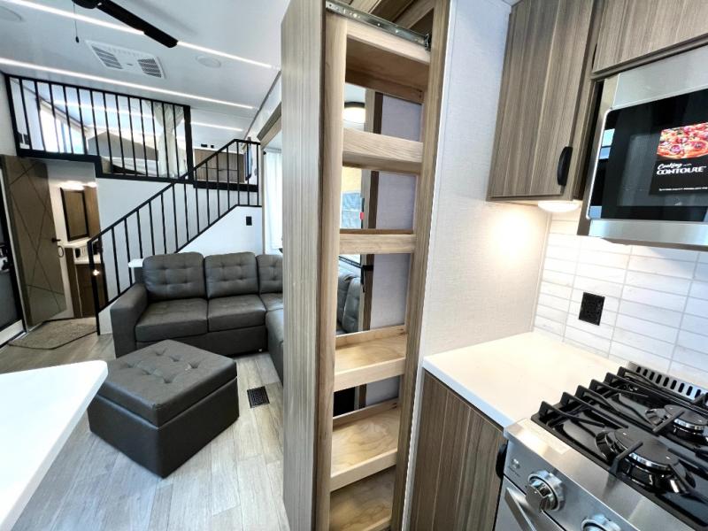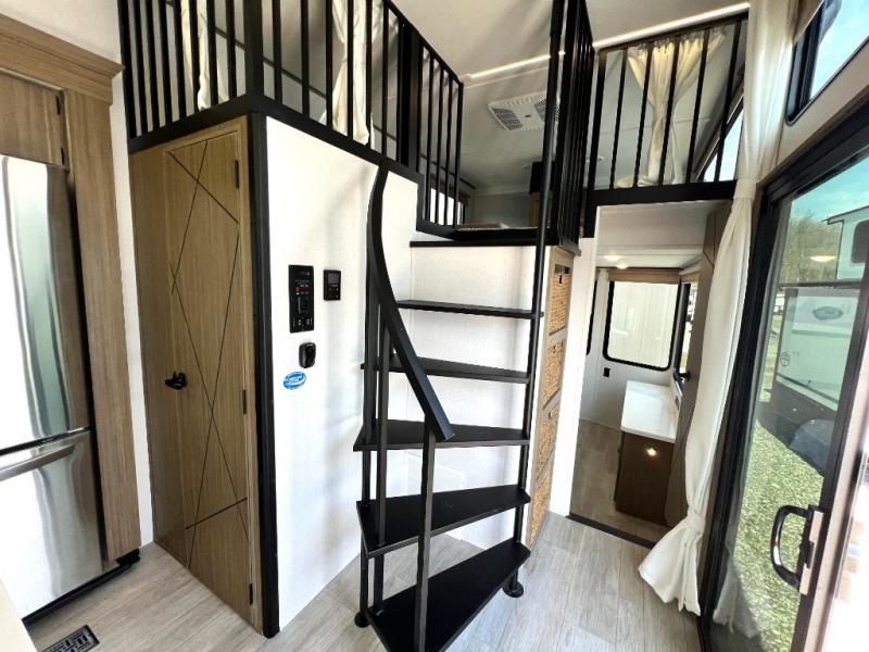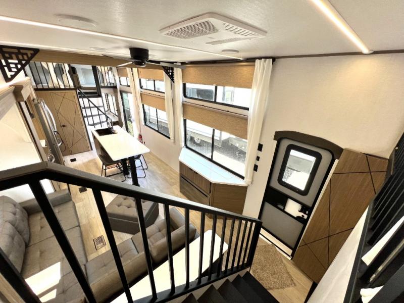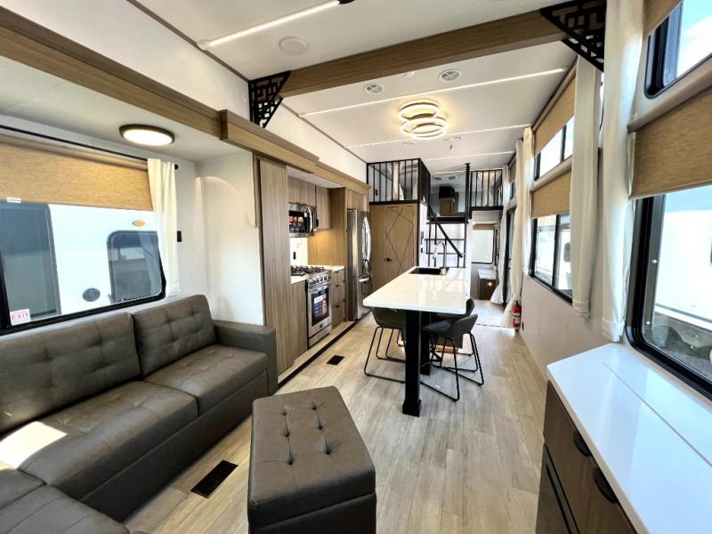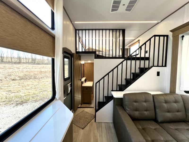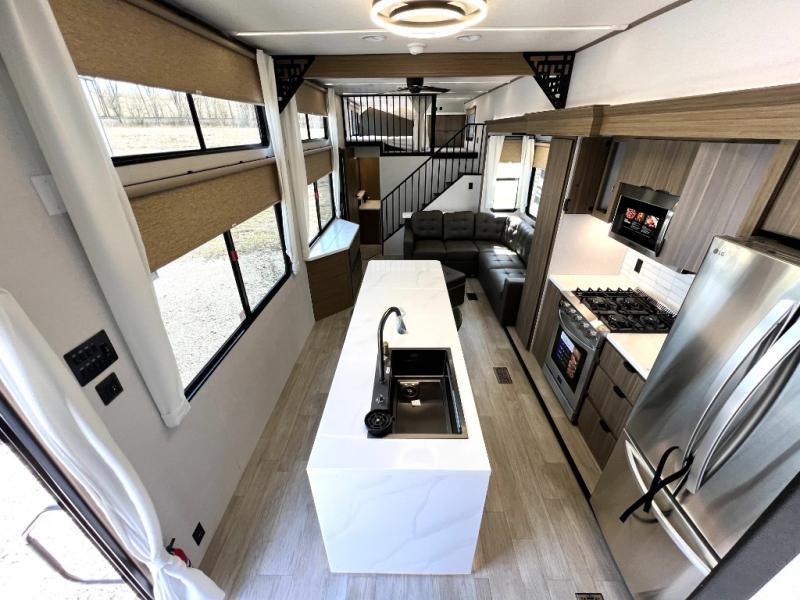 You will feel like you are home when you step inside! Not only will you be impressed with the large slide in the main combined kitchen and living area, but check out the island with four seats! The main entry closest to the front features a step up to a private bedroom featuring a custom king bed with Versa-Tilt within a slide, plus a fireplace, wardrobe, and a dress for your belongings. Just outside this door is a half bath around the corner and a spiral staircase to the front loft with two 42" x 74" bunk mats above. The kitchen is fully equipped for you to provide the best home cooked meals with a roll-out pantry, range and microwave, plus side-by-side refrigerator all part of the large slide that also houses an L-shaped sectional sofa with ottoman so everyone can have a seat! Opposite the sectional find an entertainment center with pop-up TV and fireplace. A second set of stairs leads up to the rear loft featuring a 62" x 74" Versa Queen mattress and a dresser. Back down in the very back of the unit, there is a large bathroom with a walk-in shower, linen cabinet, toilet, and vanity with a sink. There is also a space that has washer/dryer prep to add even more convenience. Outside, a 26' awning for outdoor living, and double entry doors to make it easy to move in and out.