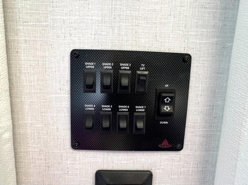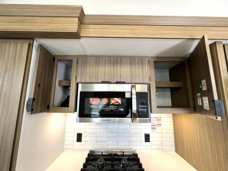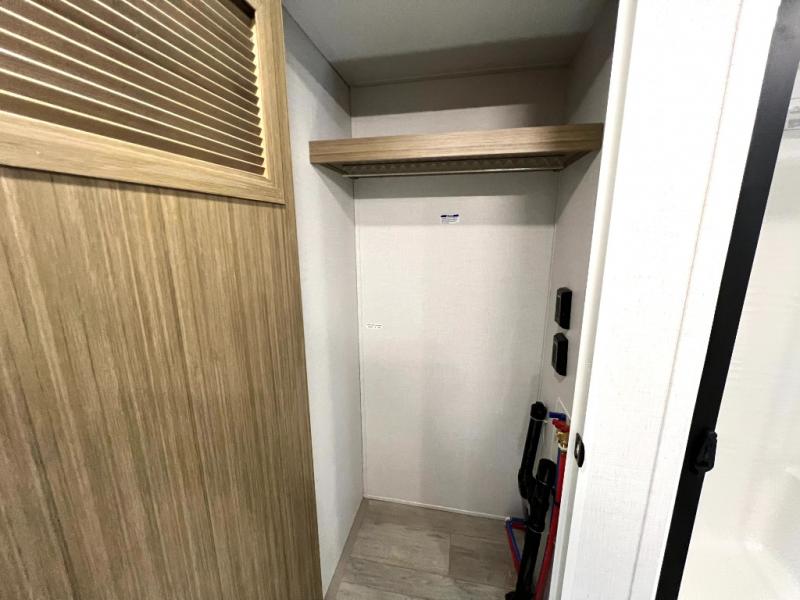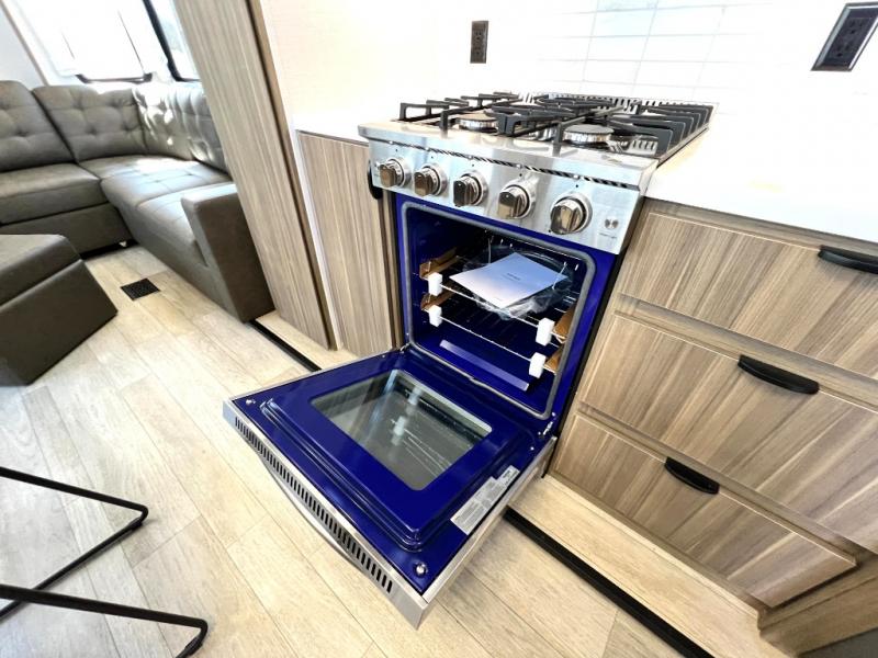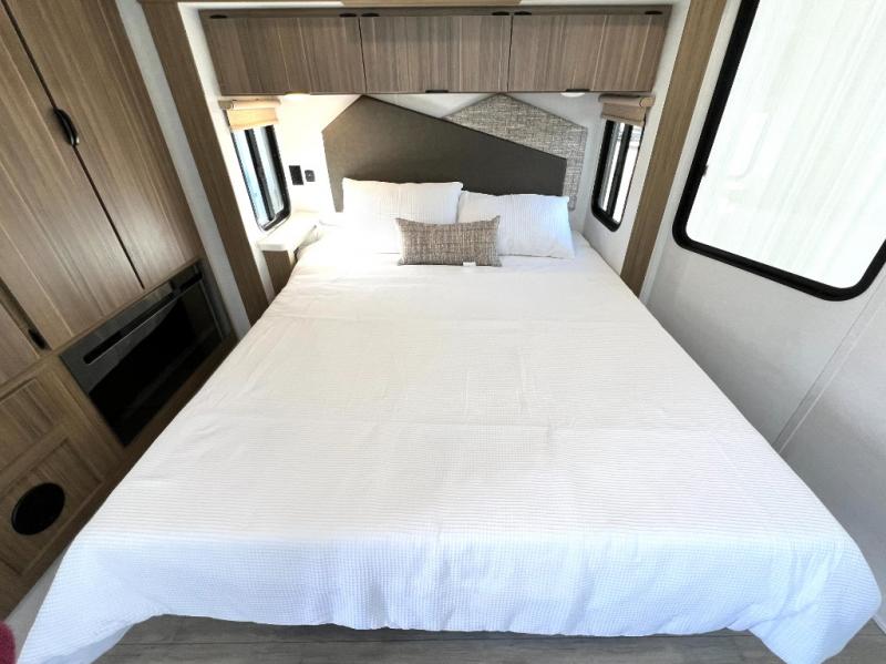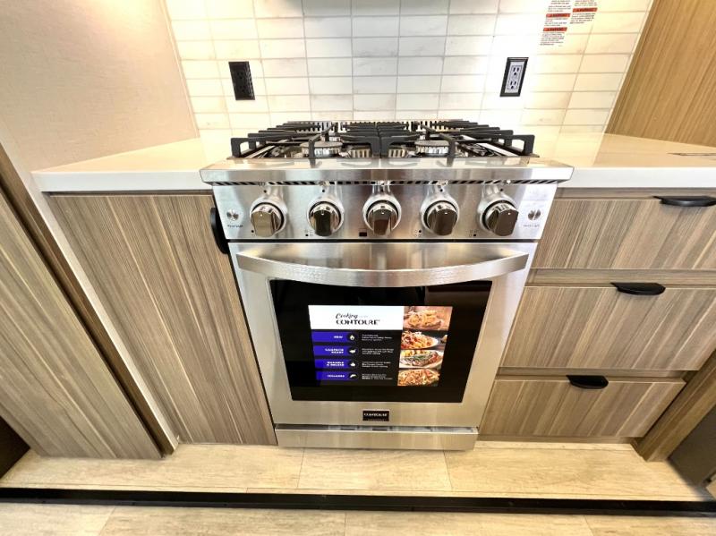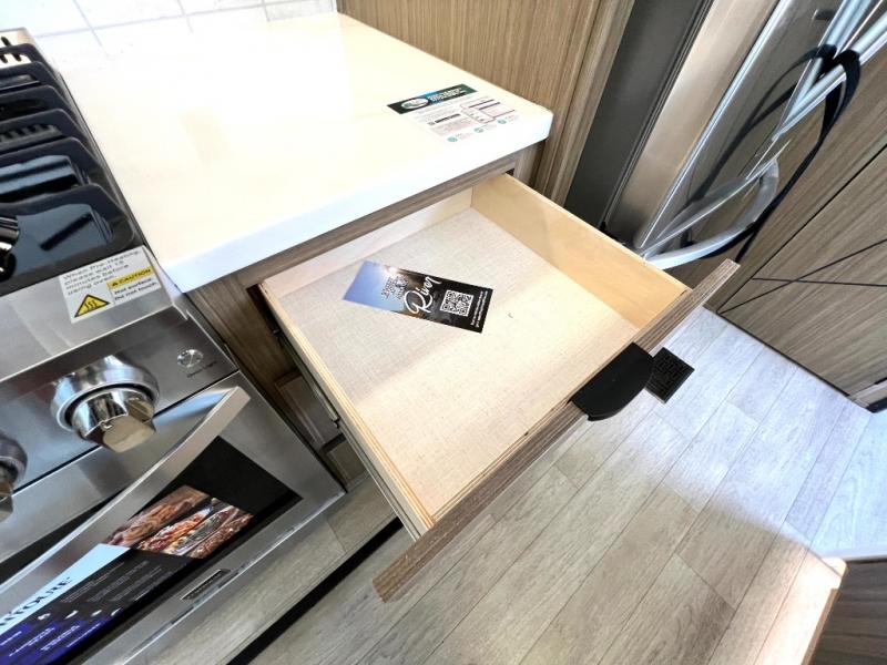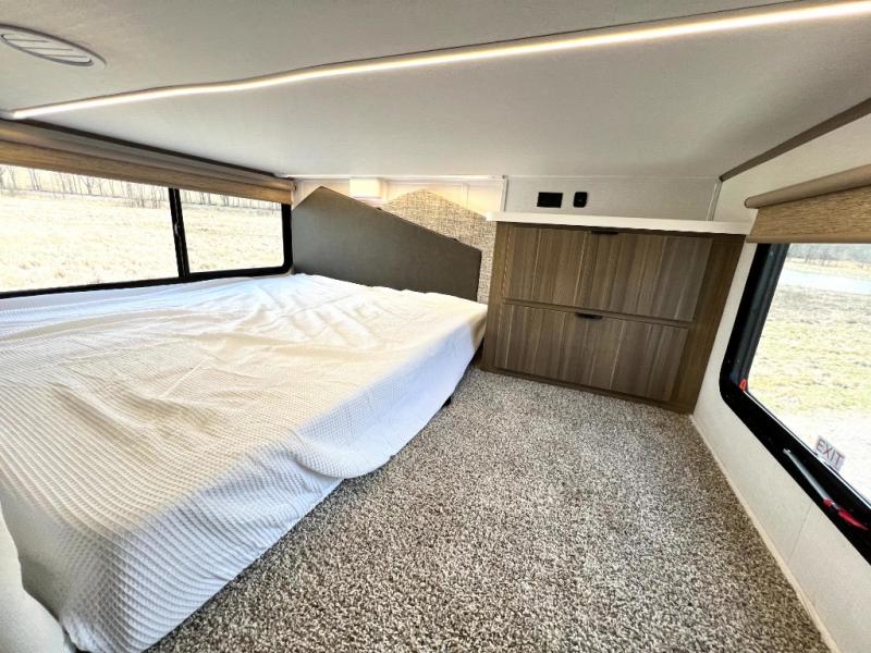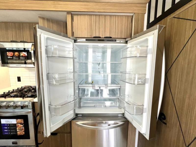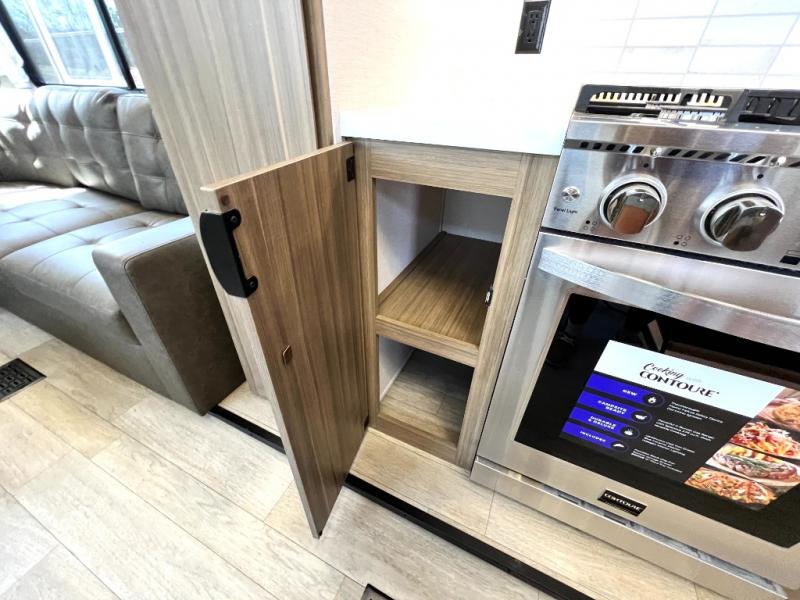 You will feel like you are home when you step inside! Not only will you be impressed with the large slide in the main combined kitchen and living area, but check out the island with four seats! The main entry closest to the front features a step up to a private bedroom featuring a custom king bed with Versa-Tilt within a slide, plus a fireplace, wardrobe, and a dress for your belongings. Just outside this door is a half bath around the corner and a spiral staircase to the front loft with two 42" x 74" bunk mats above. The kitchen is fully equipped for you to provide the best home cooked meals with a roll-out pantry, range and microwave, plus side-by-side refrigerator all part of the large slide that also houses an L-shaped sectional sofa with ottoman so everyone can have a seat! Opposite the sectional find an entertainment center with pop-up TV and fireplace. A second set of stairs leads up to the rear loft featuring a 62" x 74" Versa Queen mattress and a dresser. Back down in the very back of the unit, there is a large bathroom with a walk-in shower, linen cabinet, toilet, and vanity with a sink. There is also a space that has washer/dryer prep to add even more convenience. Outside, a 26' awning for outdoor living, and double entry doors to make it easy to move in and out.