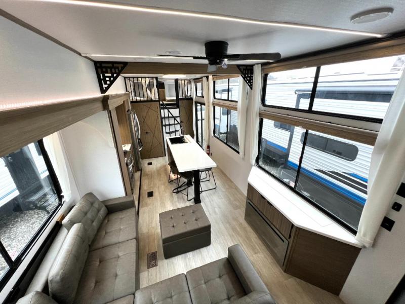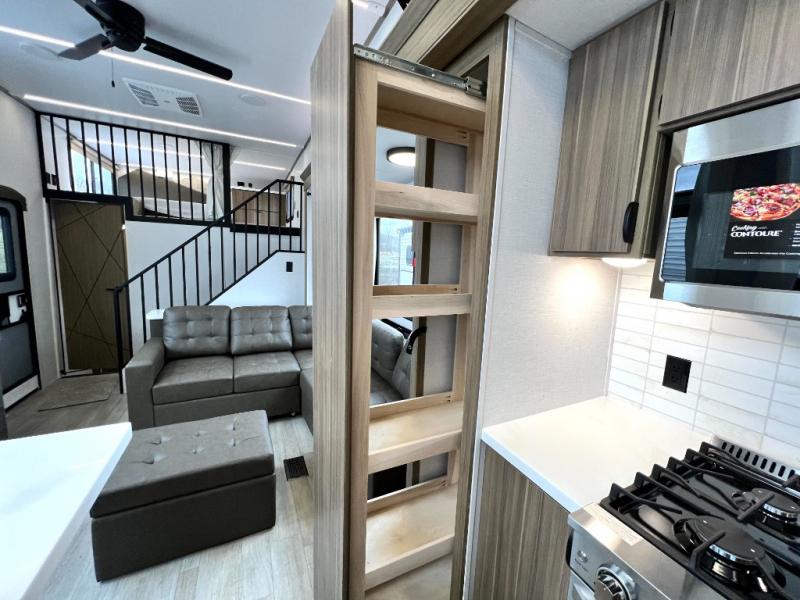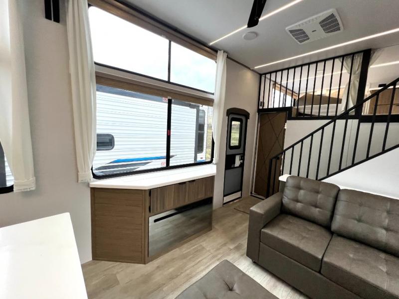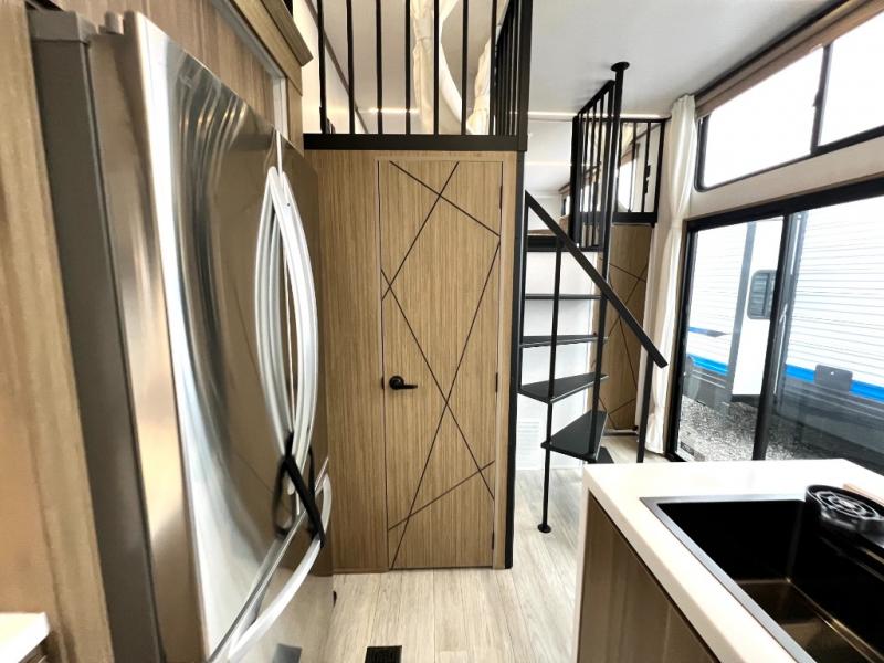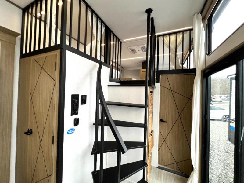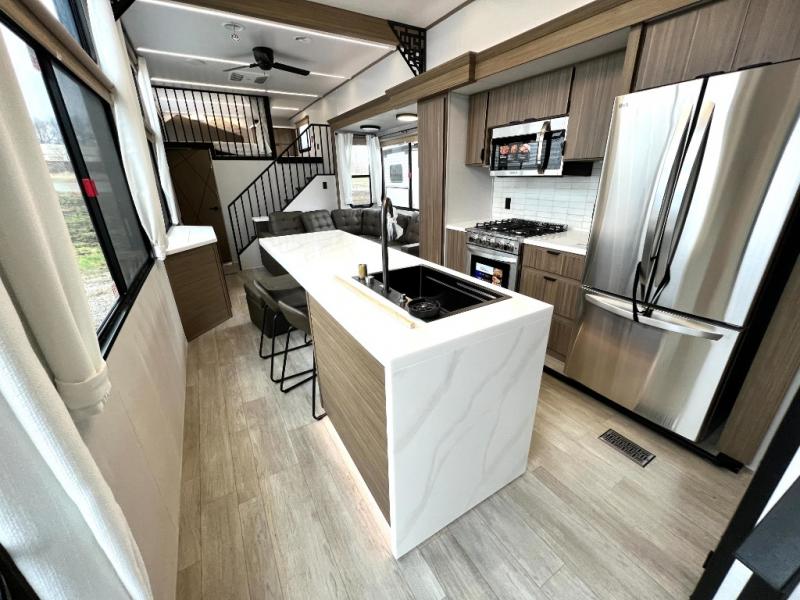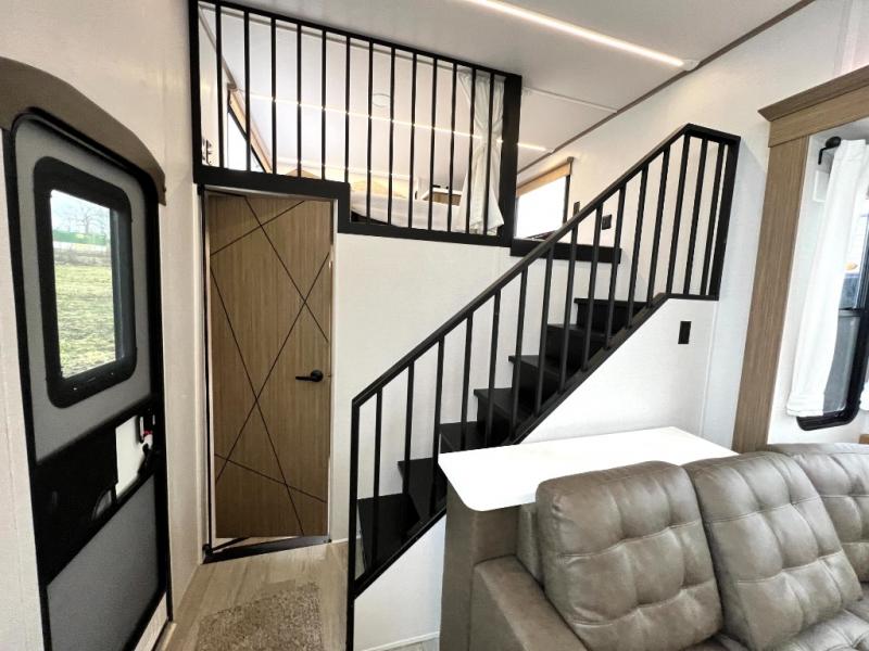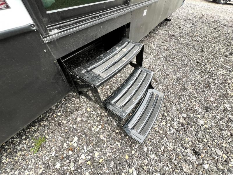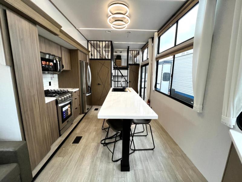 You will feel like you are home when you step inside! Not only will you be impressed with the large slide in the main combined kitchen and living area, but check out the island with four seats! The main entry closest to the front features a step up to a private bedroom featuring a custom king bed with Versa-Tilt within a slide, plus a fireplace, wardrobe, and a dress for your belongings. Just outside this door is a half bath around the corner and a spiral staircase to the front loft with two 42" x 74" bunk mats above. The kitchen is fully equipped for you to provide the best home cooked meals with a roll-out pantry, range and microwave, plus side-by-side refrigerator all part of the large slide that also houses an L-shaped sectional sofa with ottoman so everyone can have a seat! Opposite the sectional find an entertainment center with pop-up TV and fireplace. A second set of stairs leads up to the rear loft featuring a 62" x 74" Versa Queen mattress and a dresser. Back down in the very back of the unit, there is a large bathroom with a walk-in shower, linen cabinet, toilet, and vanity with a sink. There is also a space that has washer/dryer prep to add even more convenience. Outside, a 26' awning for outdoor living, and double entry doors to make it easy to move in and out.