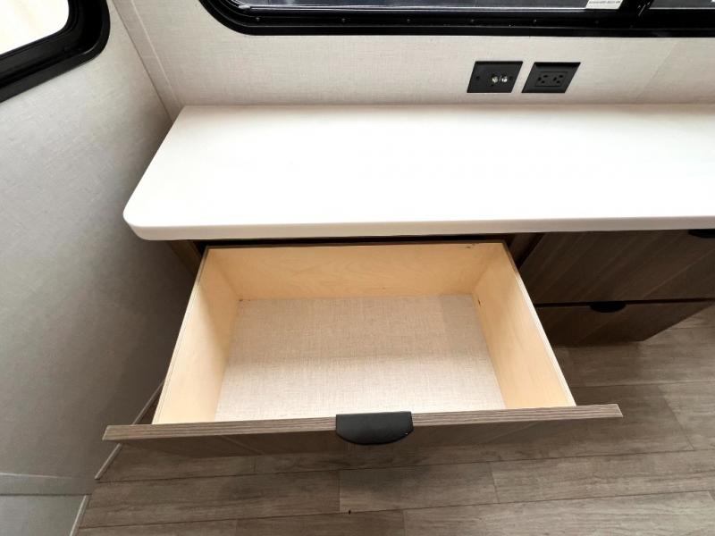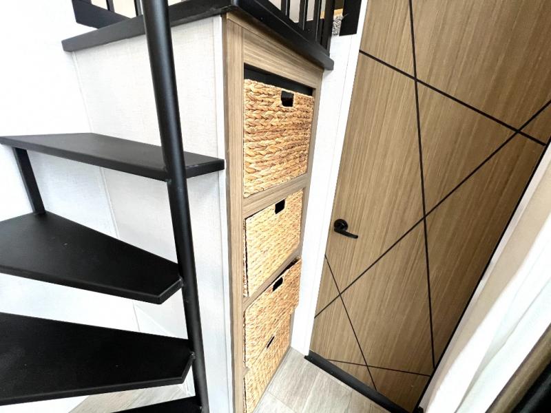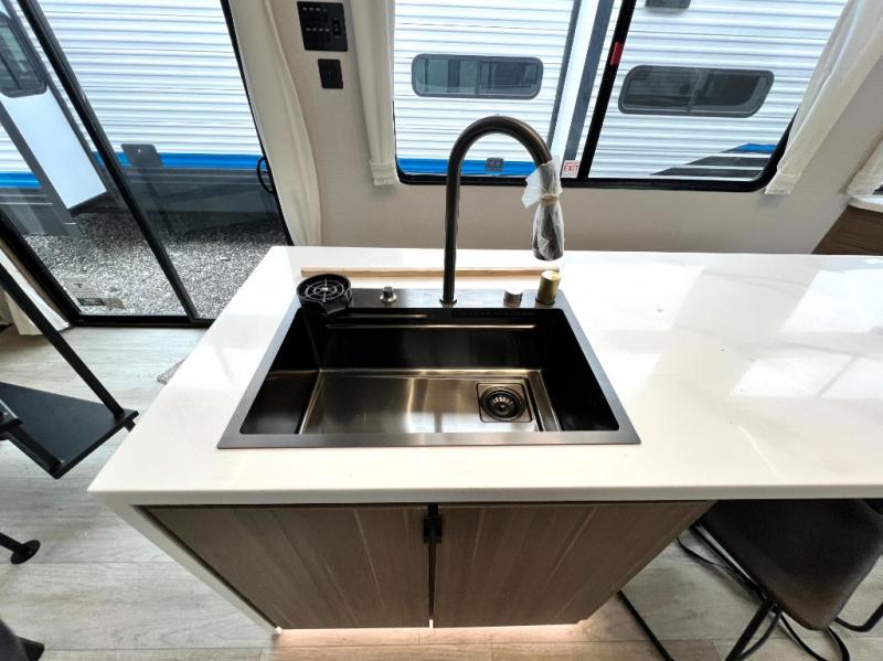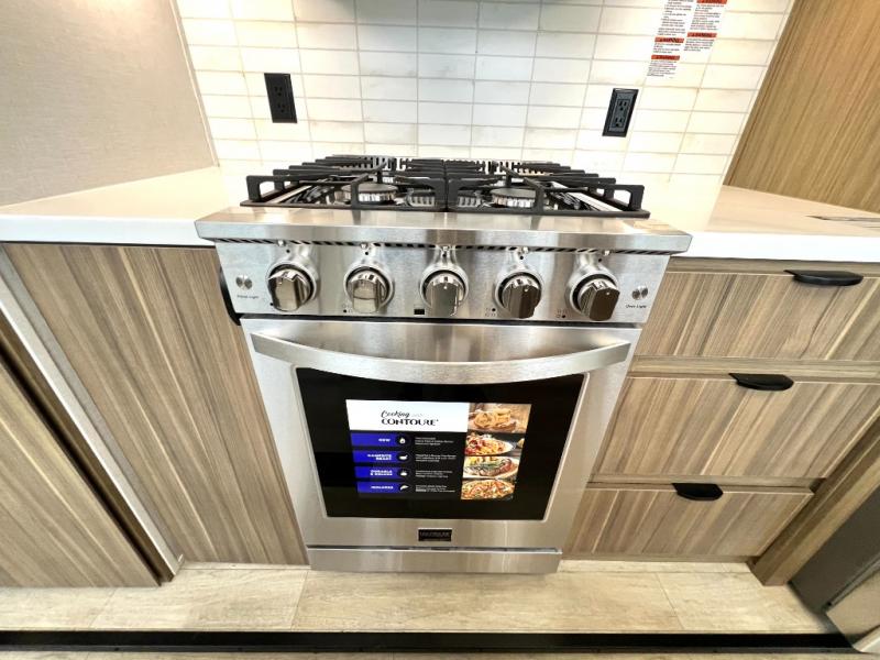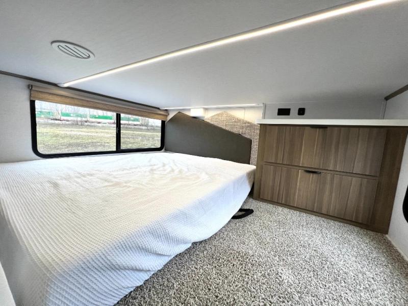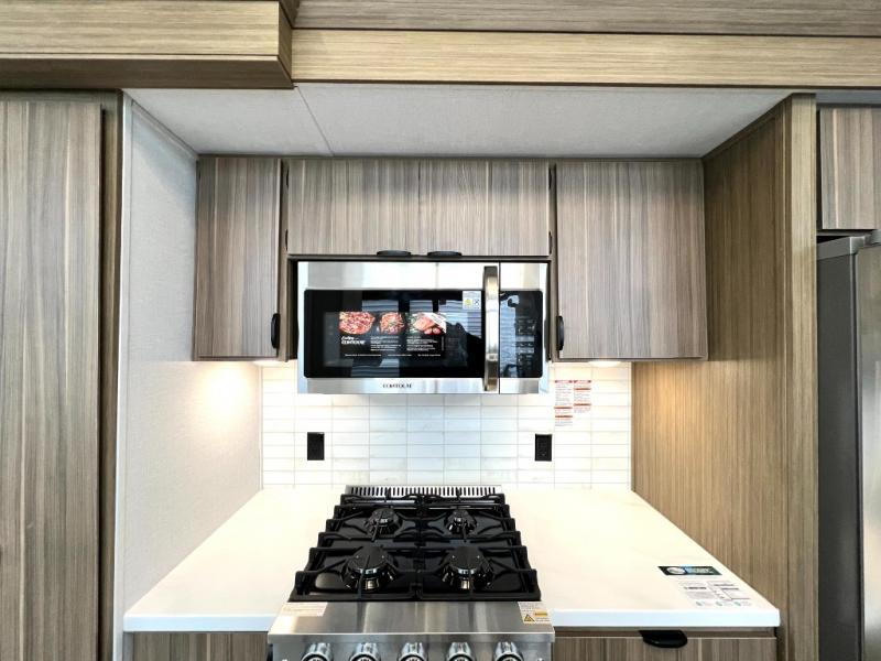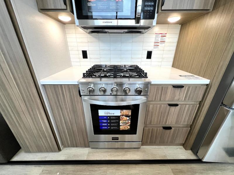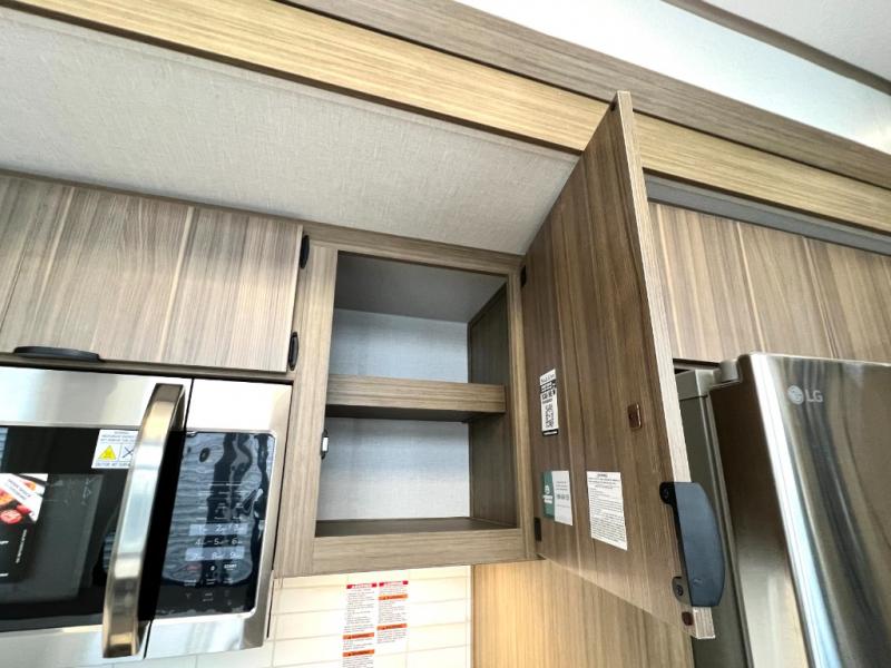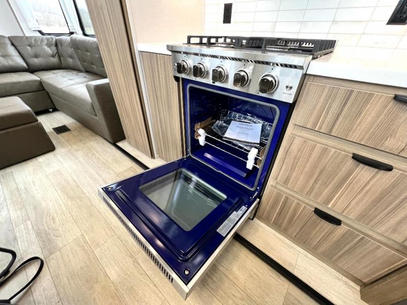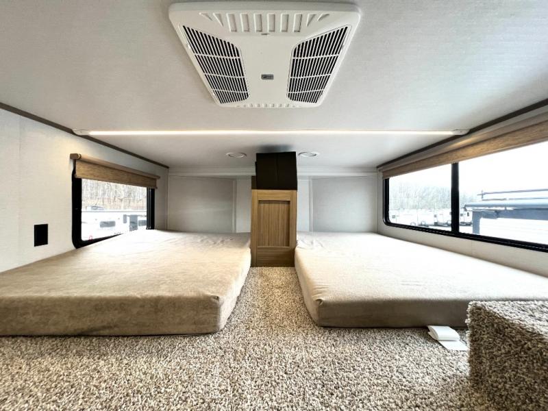 You will feel like you are home when you step inside! Not only will you be impressed with the large slide in the main combined kitchen and living area, but check out the island with four seats! The main entry closest to the front features a step up to a private bedroom featuring a custom king bed with Versa-Tilt within a slide, plus a fireplace, wardrobe, and a dress for your belongings. Just outside this door is a half bath around the corner and a spiral staircase to the front loft with two 42" x 74" bunk mats above. The kitchen is fully equipped for you to provide the best home cooked meals with a roll-out pantry, range and microwave, plus side-by-side refrigerator all part of the large slide that also houses an L-shaped sectional sofa with ottoman so everyone can have a seat! Opposite the sectional find an entertainment center with pop-up TV and fireplace. A second set of stairs leads up to the rear loft featuring a 62" x 74" Versa Queen mattress and a dresser. Back down in the very back of the unit, there is a large bathroom with a walk-in shower, linen cabinet, toilet, and vanity with a sink. There is also a space that has washer/dryer prep to add even more convenience. Outside, a 26' awning for outdoor living, and double entry doors to make it easy to move in and out.