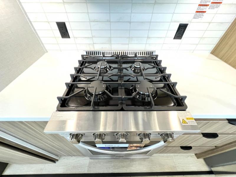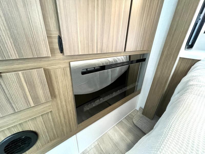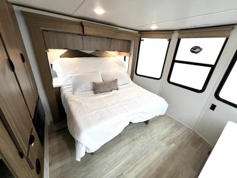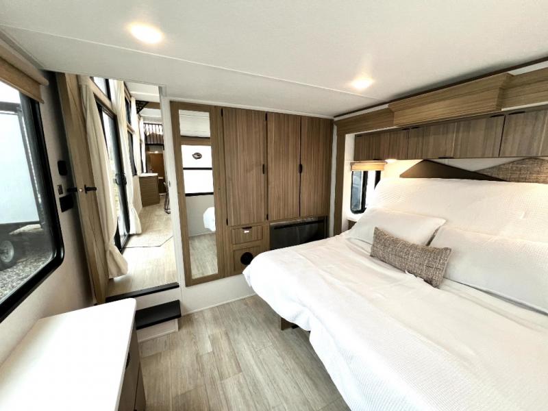 Residential kitchen, king bed, and fireplace — full-time living. Tour today at Zoomers RV Indiana