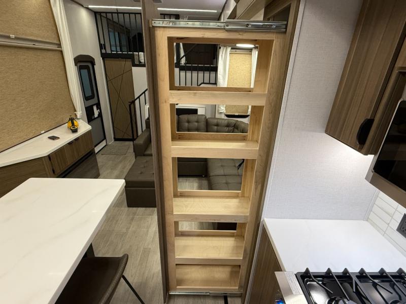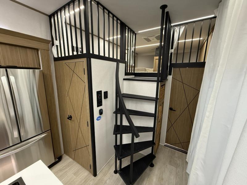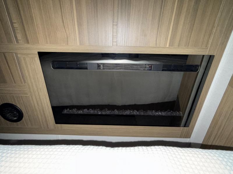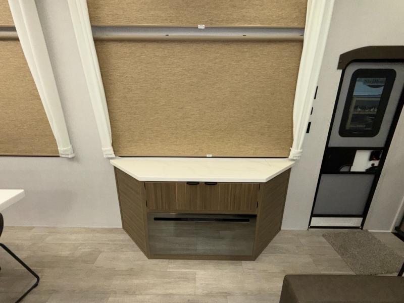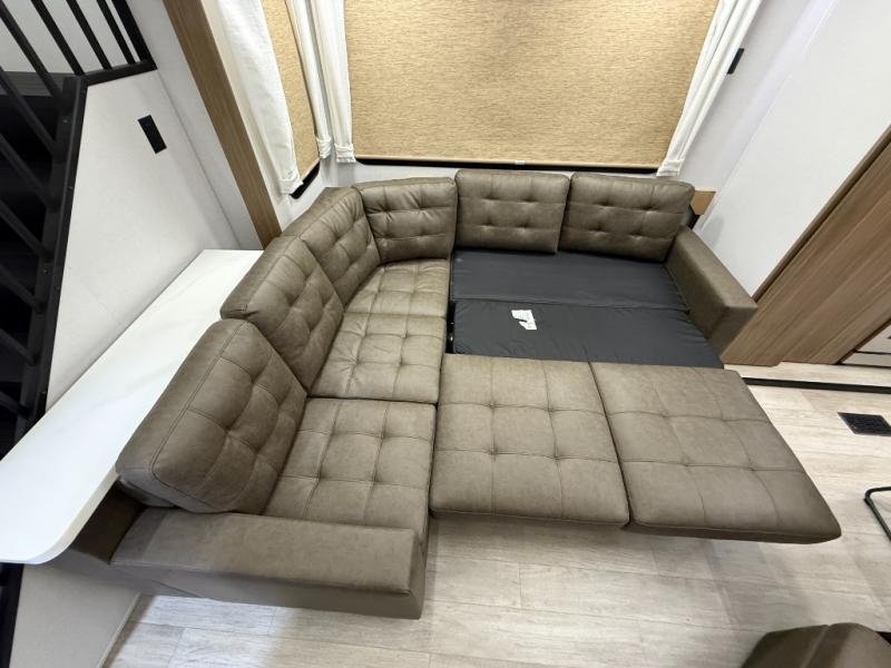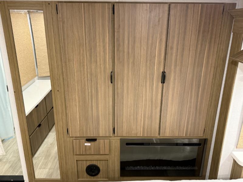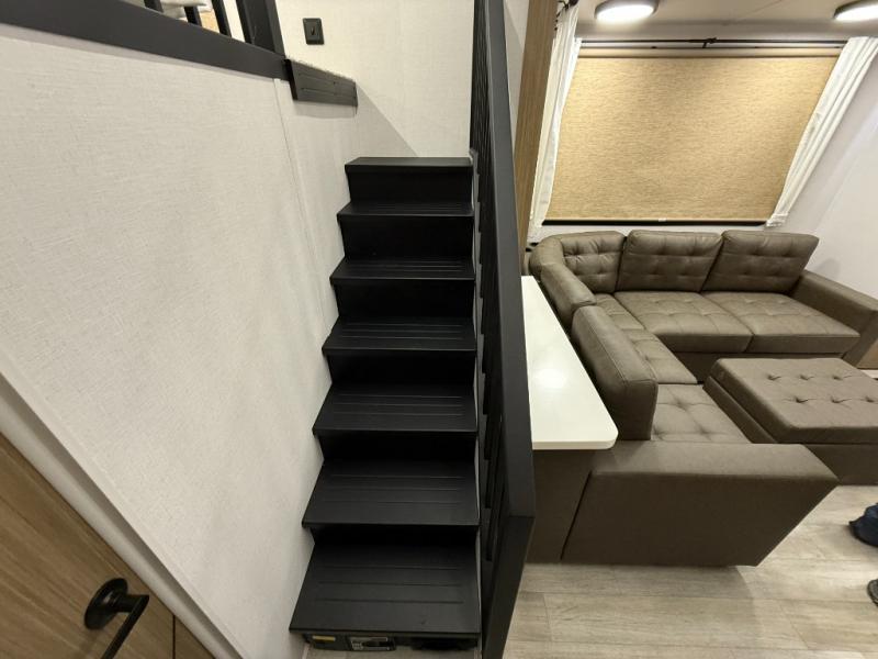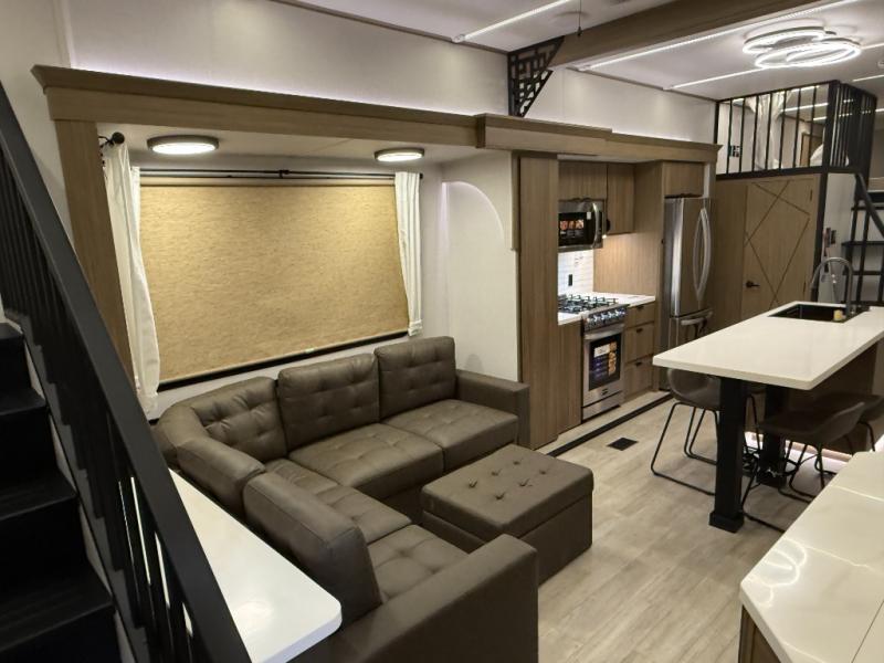 You will feel like you are home when you step inside! Not only will you be impressed with the large slide in the main combined kitchen and living area, but check out the island with four seats! The main entry closest to the front features a step up to a private bedroom featuring a custom king bed with Versa-Tilt within a slide, plus a fireplace, wardrobe, and a dress for your belongings. Just outside this door is a half bath around the corner and a spiral staircase to the front loft with two 42" x 74" bunk mats above. The kitchen is fully equipped for you to provide the best home cooked meals with a roll-out pantry, range and microwave, plus side-by-side refrigerator all part of the large slide that also houses an L-shaped sectional sofa with ottoman so everyone can have a seat! Opposite the sectional find an entertainment center with pop-up TV and fireplace. A second set of stairs leads up to the rear loft featuring a 62" x 74" Versa Queen mattress and a dresser. Back down in the very back of the unit, there is a large bathroom with a walk-in shower, linen cabinet, toilet, and vanity with a sink. There is also a space that has washer/dryer prep to add even more convenience. Outside, a 26' awning for outdoor living, and double entry doors to make it easy to move in and out.