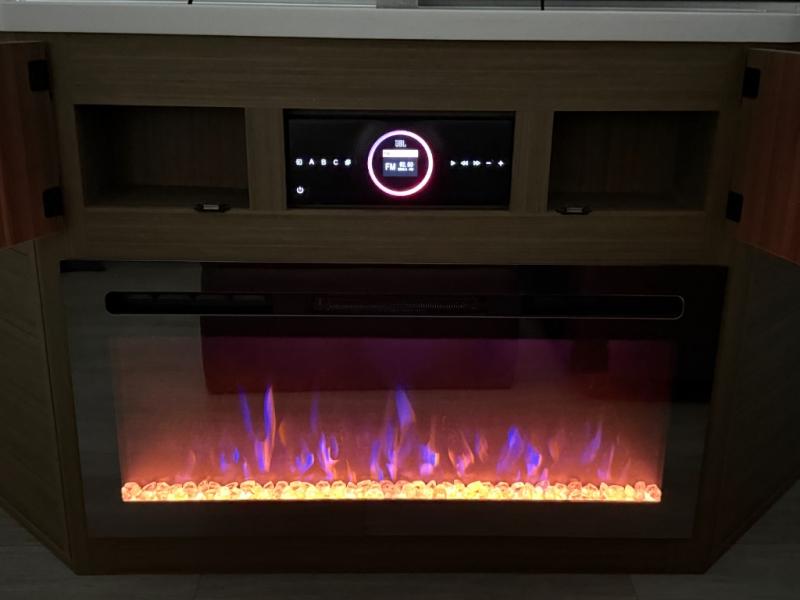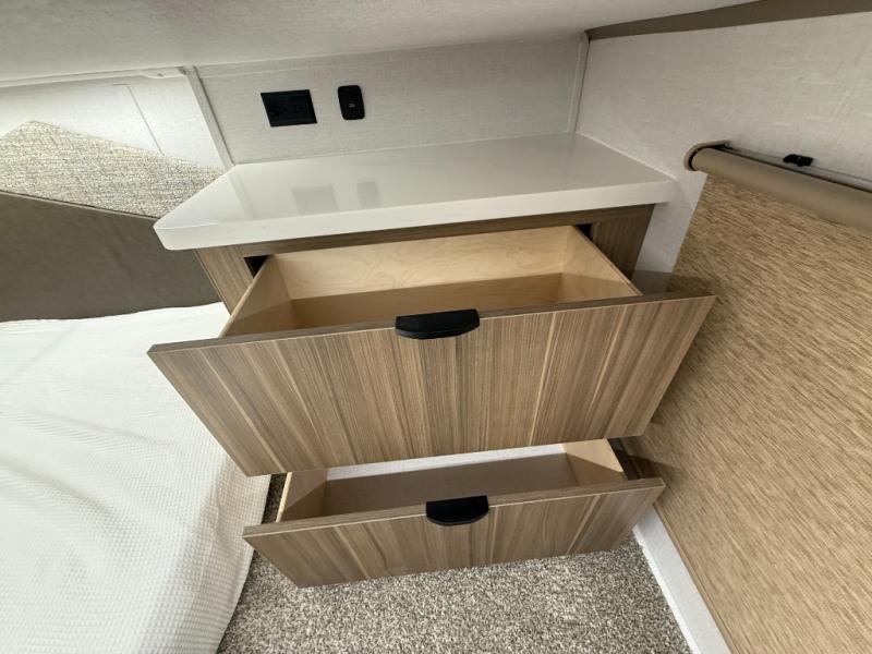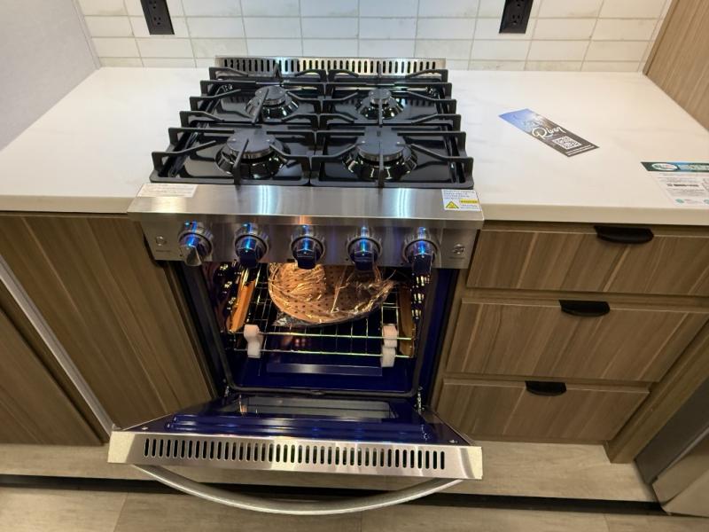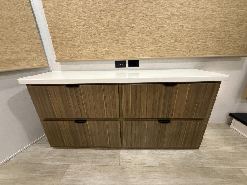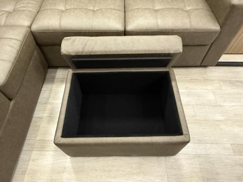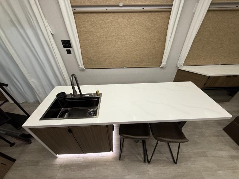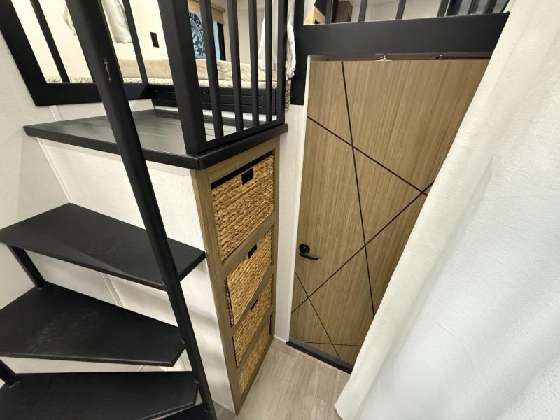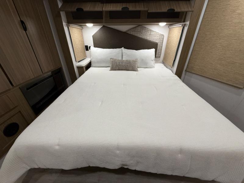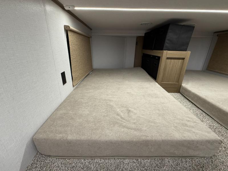 You will feel like you are home when you step inside! Not only will you be impressed with the large slide in the main combined kitchen and living area, but check out the island with four seats! The main entry closest to the front features a step up to a private bedroom featuring a custom king bed with Versa-Tilt within a slide, plus a fireplace, wardrobe, and a dress for your belongings. Just outside this door is a half bath around the corner and a spiral staircase to the front loft with two 42" x 74" bunk mats above. The kitchen is fully equipped for you to provide the best home cooked meals with a roll-out pantry, range and microwave, plus side-by-side refrigerator all part of the large slide that also houses an L-shaped sectional sofa with ottoman so everyone can have a seat! Opposite the sectional find an entertainment center with pop-up TV and fireplace. A second set of stairs leads up to the rear loft featuring a 62" x 74" Versa Queen mattress and a dresser. Back down in the very back of the unit, there is a large bathroom with a walk-in shower, linen cabinet, toilet, and vanity with a sink. There is also a space that has washer/dryer prep to add even more convenience. Outside, a 26' awning for outdoor living, and double entry doors to make it easy to move in and out.