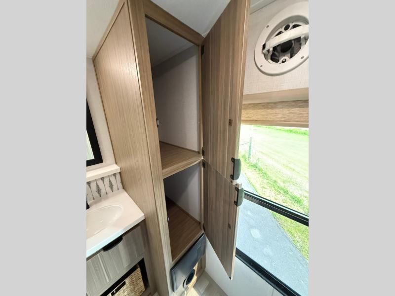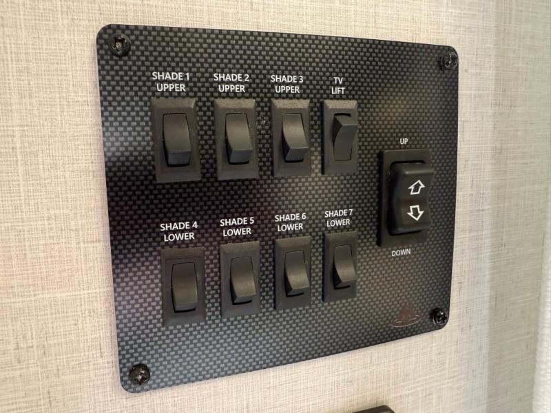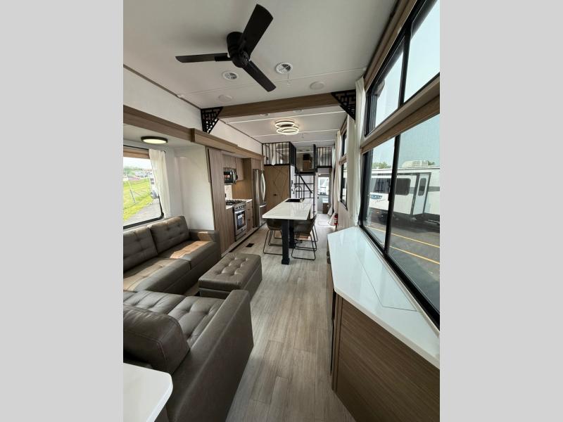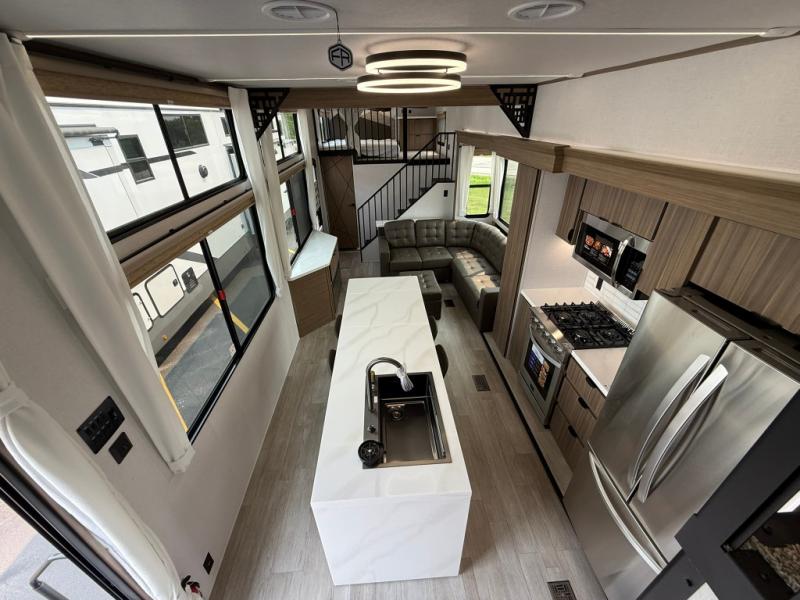 You will feel like you are home when you step inside! Not only will you be impressed with the large slide in the main combined kitchen and living area, but check out the island with four seats! The main entry closest to the front features a step up to a private bedroom featuring a custom king bed with Versa-Tilt within a slide, plus a fireplace, wardrobe, and a dress for your belongings. Just outside this door is a half bath around the corner and a spiral staircase to the front loft with two 42" x 74" bunk mats above. The kitchen is fully equipped for you to provide the best home cooked meals with a roll-out pantry, range and microwave, plus side-by-side refrigerator all part of the large slide that also houses an L-shaped sectional sofa with ottoman so everyone can have a seat! Opposite the sectional find an entertainment center with pop-up TV and fireplace. A second set of stairs leads up to the rear loft featuring a 62" x 74" Versa Queen mattress and a dresser. Back down in the very back of the unit, there is a large bathroom with a walk-in shower, linen cabinet, toilet, and vanity with a sink. There is also a space that has washer/dryer prep to add even more convenience. Outside, a 26' awning for outdoor living, and double entry doors to make it easy to move in and out.